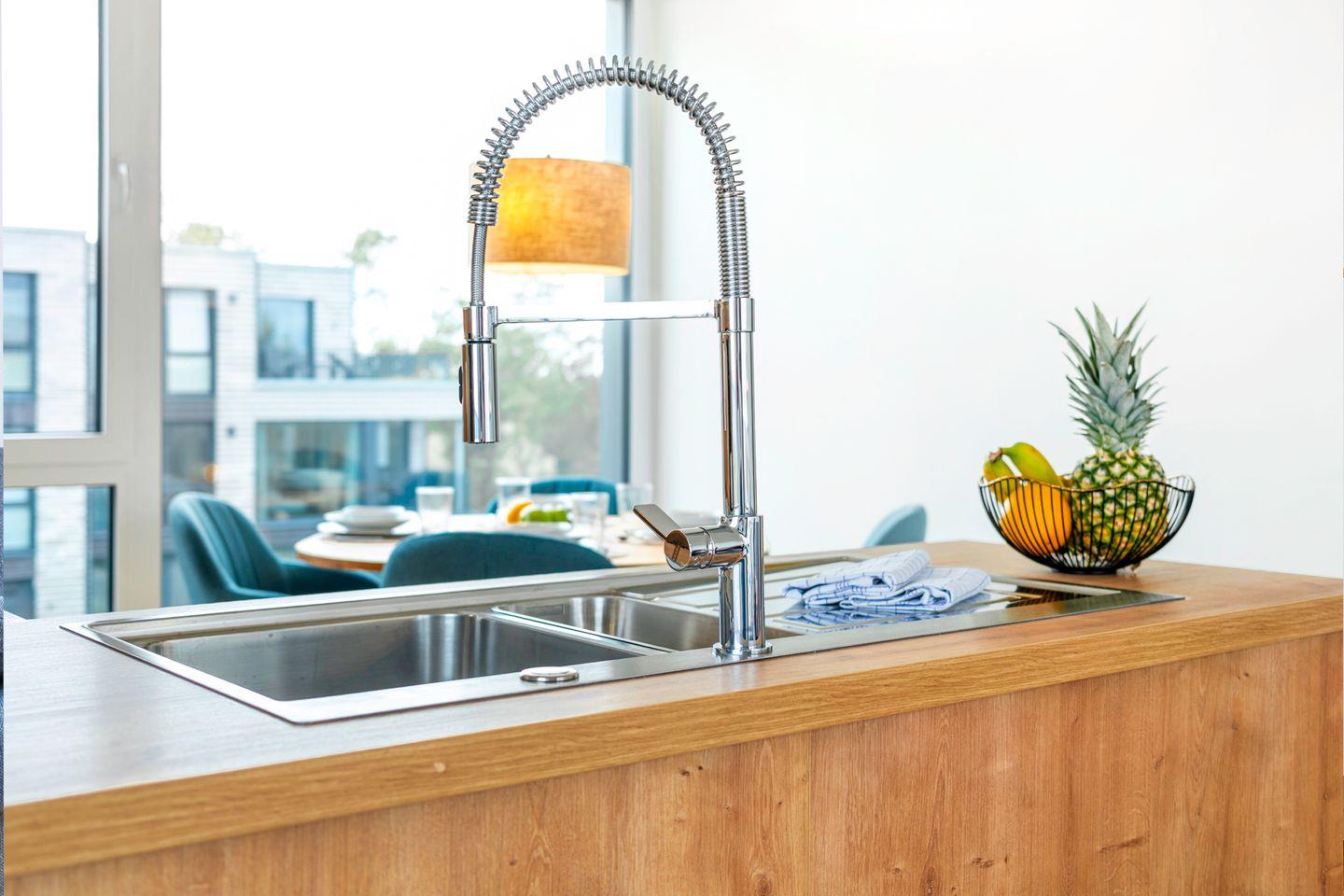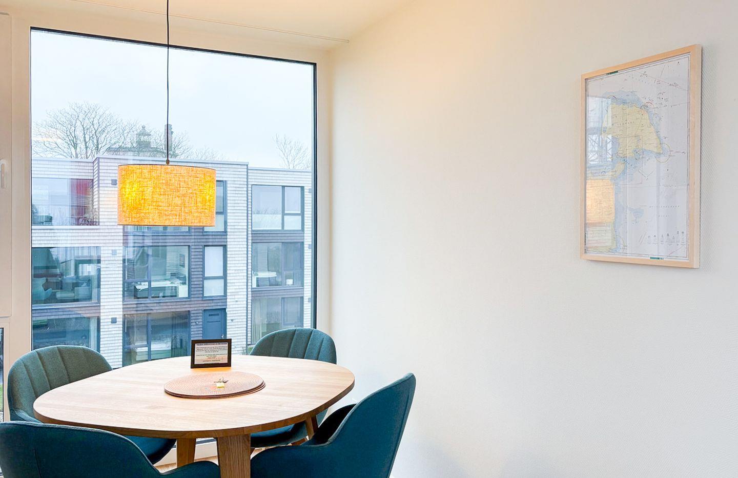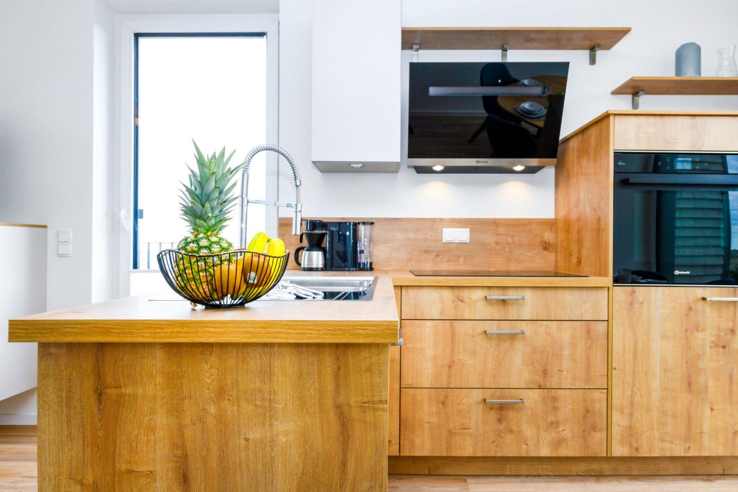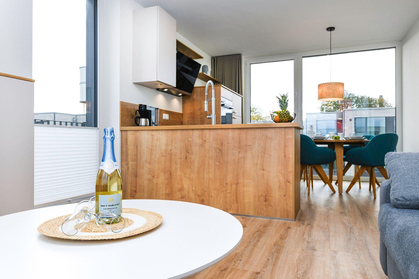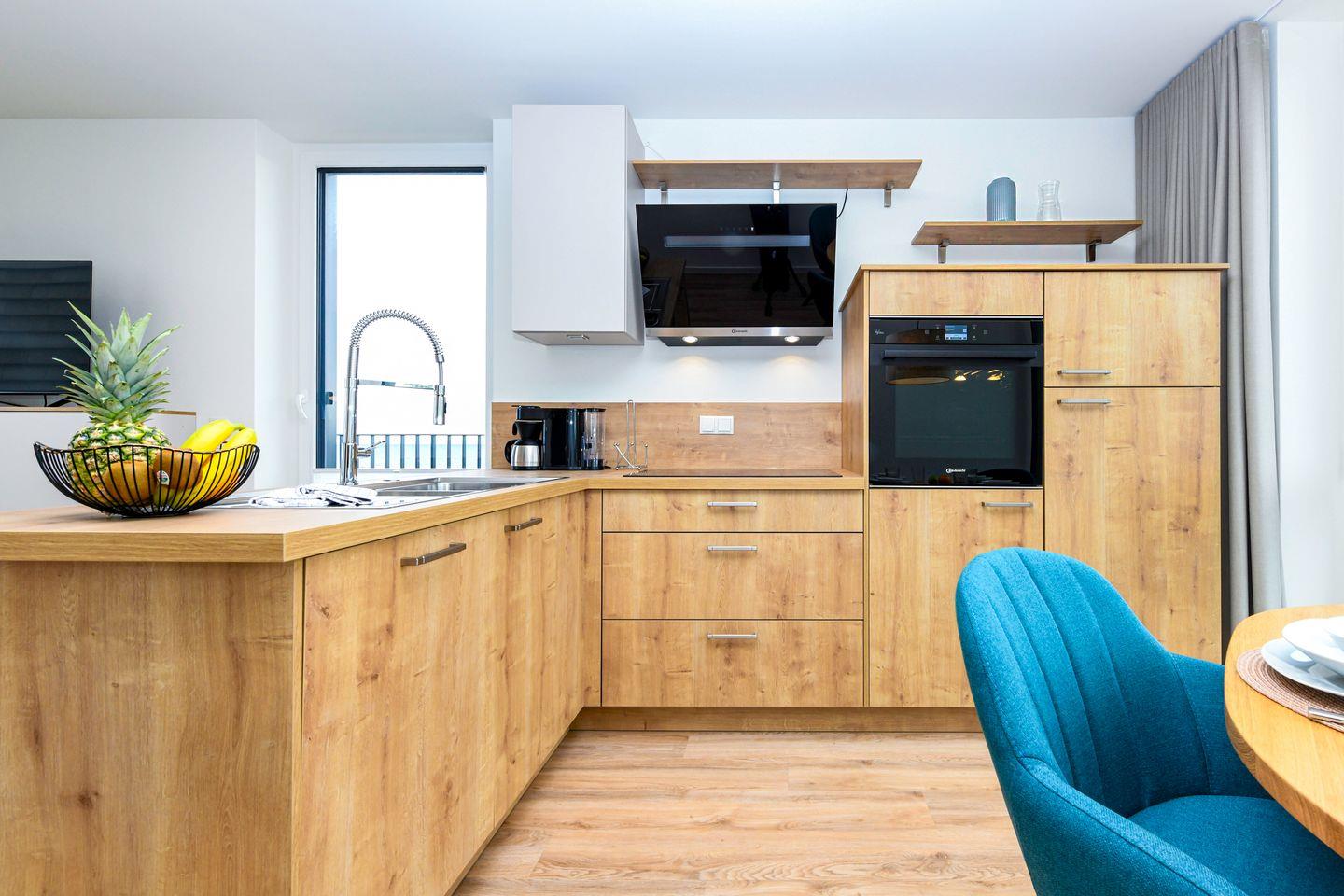 Der helle Wohnbereich verbindet zeitgemäßes Design mit hochwertiger Ausstattung. Bodentiefe Fenster schenken dir viel Licht und führen direkt auf die große Dachterrasse – dein Platz für Sonnenstunden und Meerblicke. In der offenen Küche findest du alles, was du brauchst: moderne Geräte mit Induktionsfeld, Backofen mit Heißluftfunktion, Geschirrspüler laden zu gemütlichen Kochabenden ein. Ob ein sonniges Frühstück oder ein schönes Abendessen mit Blick aufs Meer – hier genießt du echte Wohlfühlmomente.