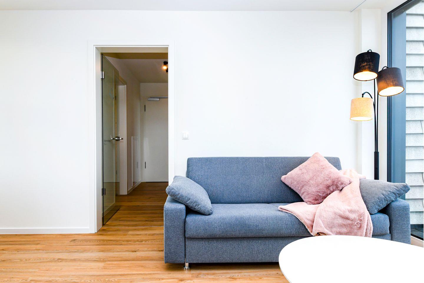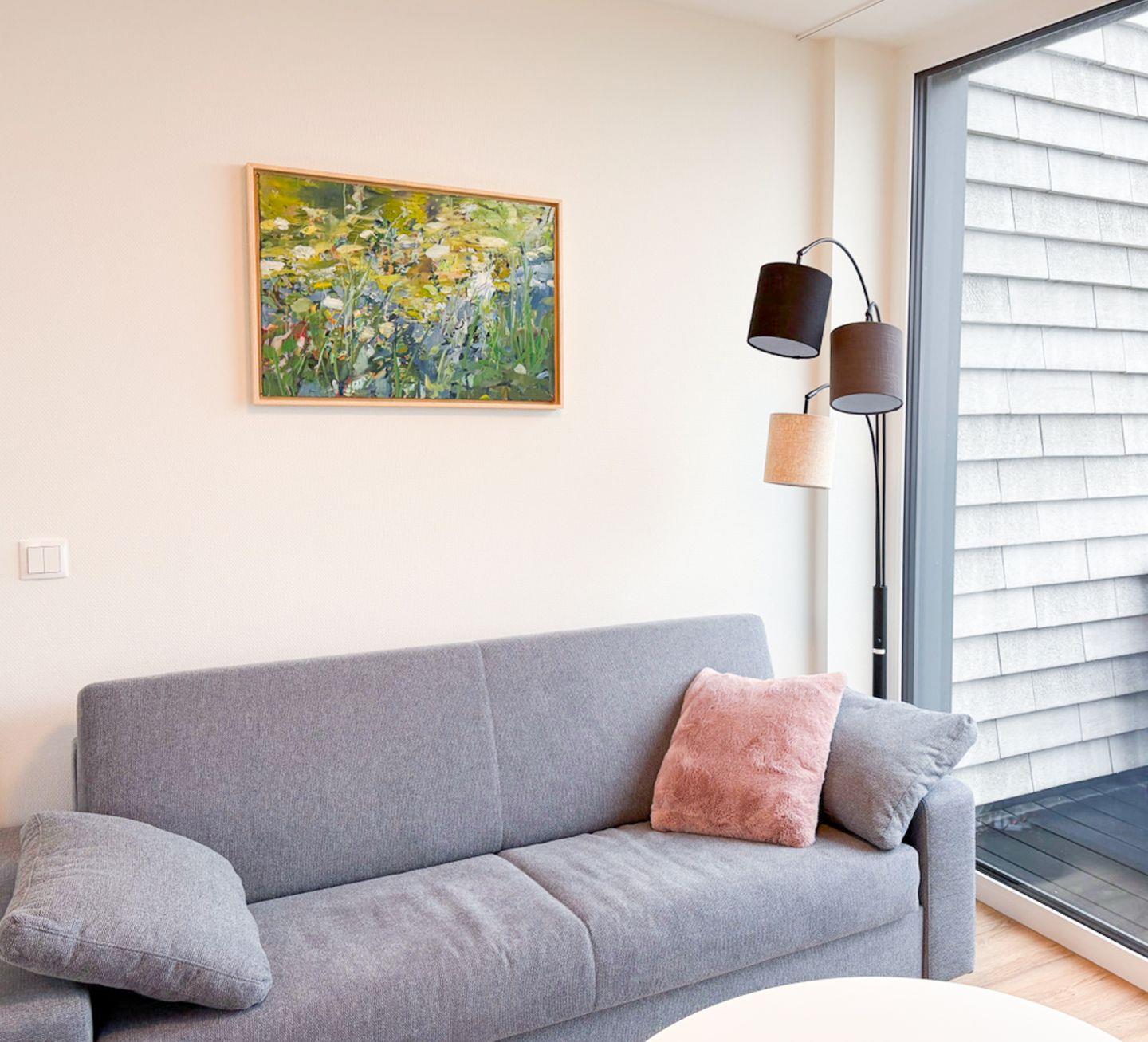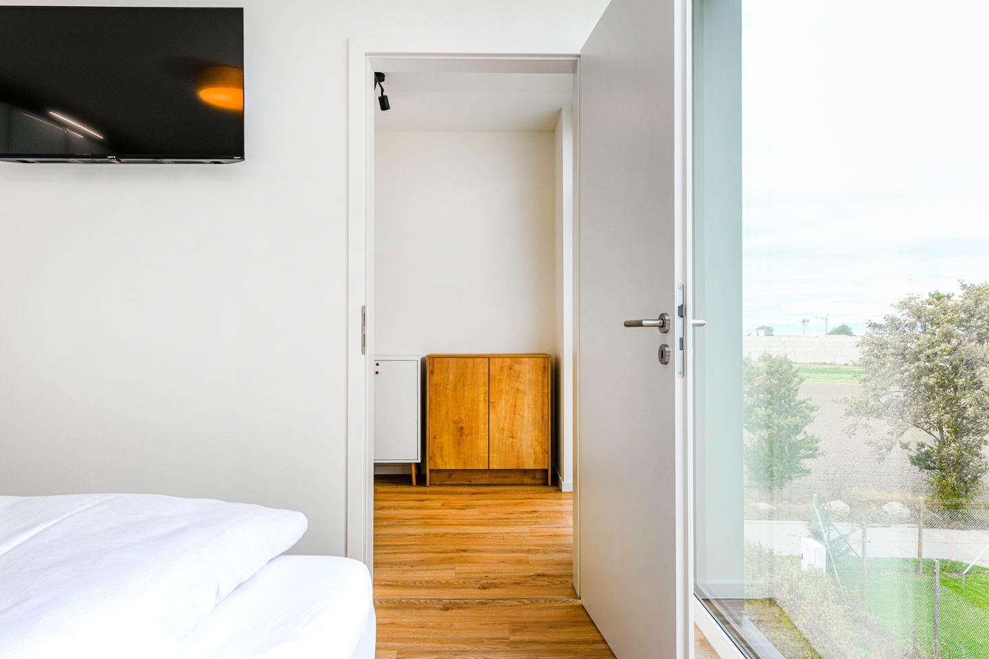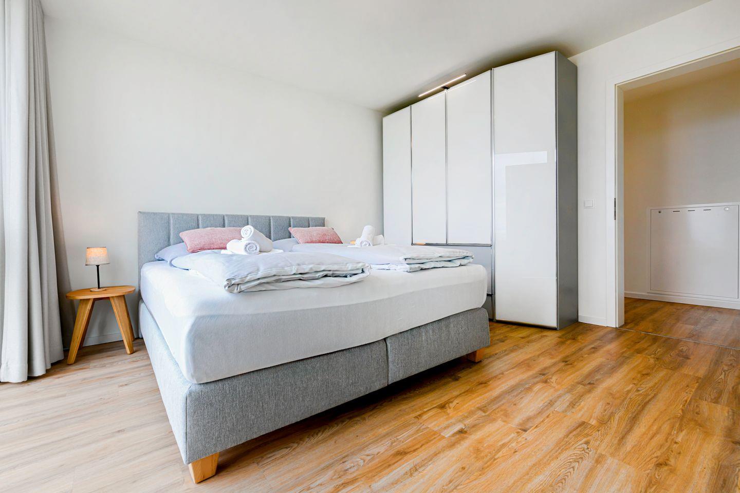 Im Schlafzimmer erwartet dich ein komfortables Boxspringbett mit bodentiefen Fenstern und Verdunkelungsmöglichkeiten – perfekt für erholsame Nächte. Harmonische Farben und die liebevolle Einrichtung sorgen für eine entspannte Atmosphäre. Zusätzlich bietet der Wohnbereich ein Schlafsofa (140 × 200 cm), das Platz für zwei Kinder oder einen Erwachsenen.