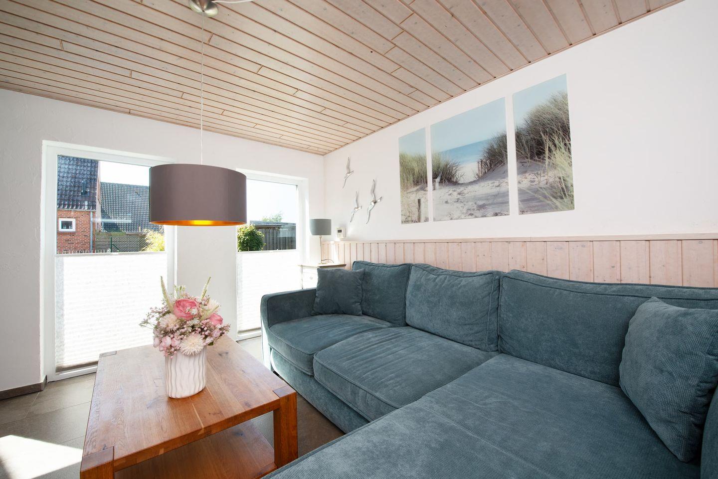 Das Herzstück des Huus Strandgut bildet das offene Wohnkonzept: Ein lichtdurchflutetes Wohnzimmer mit Fliesenboden, Kaminofen und Sofaecke lädt zum Entspannen ein. Im Essbereich bietet der große Esstisch Platz für gemeinsame Mahlzeiten. Die angrenzende, offene Küche verfügt über hochwertige Geräte wie einen Ceranherd, Backofen, Mikrowelle, Spülmaschine, Kühlschrank mit Gefrierfach und eine Nespresso-Espressomaschine. Küchenutensilien, Geschirr und Besteck sind selbstverständlich vorhanden. Für die Unterhaltung sorgen ein Satelliten-TV ( 42 Zoll), ein Blu-ray-Spieler sowie kostenfreies WLAN im gesamten Haus.