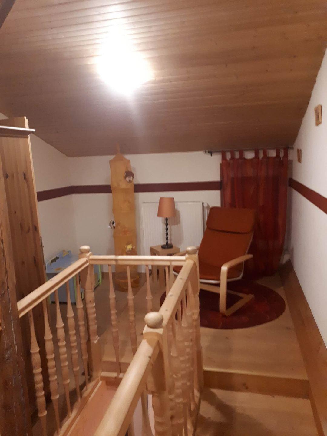 Über eine schmale Treppe gelangen Sie ins Obergeschoss, wo Sie zwei weitere Schlafzimmer mit Doppelbett erwarten. Hier oben befindet sich außerdem eine kleine, liebevoll gestaltete Spielecke – ein Highlight für kleine Gäste – sowie ein zusätzliches Gäste-WC mit Waschbecken und Toilette.