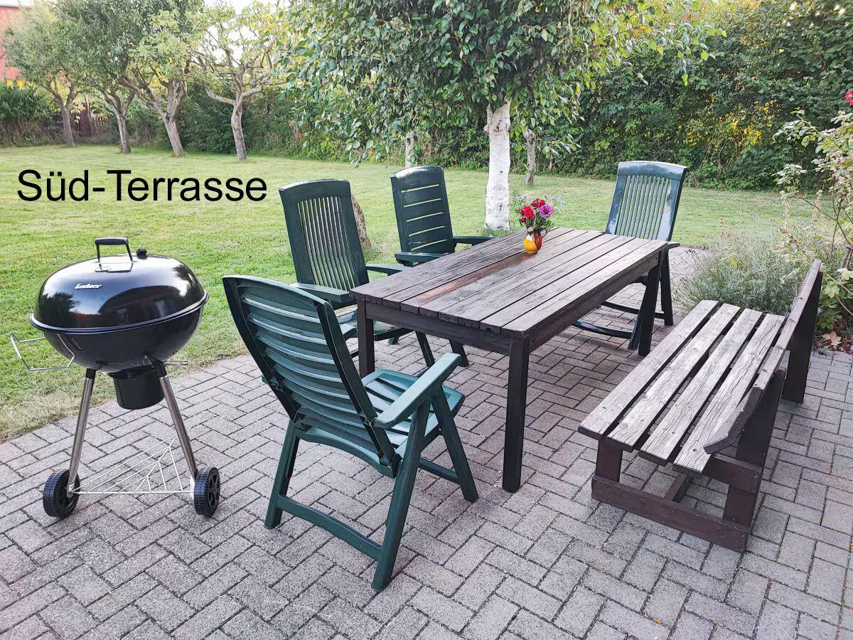 Im Außenbereich finden sie eine große Terrasse mit Südausrichtung sowie eine kleinere Terrasse im Westen des Hauses. Die große Rasenfläche eignet sich als Liegewiese oder Spielfläche für die Kinder. Für gemütliche Abende stehen Gartenmöbel und ein Holzkohlegrill bereit, dessen Reinigung der Mieter allerdings selbst übernehmen muss.
