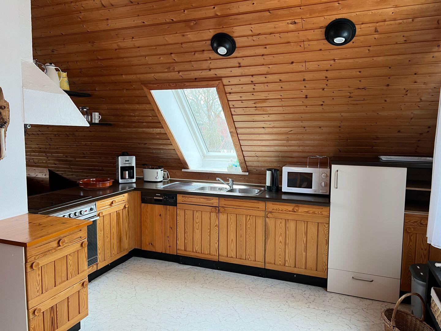 Die Küche ist umfassend ausgestattet und bietet Ceran-Feld, Backofen, Mikrowelle, Kühlschrank mit Gefrierfach, Spülmaschine sowie Kaffeemaschine, Wasserkocher, Toaster und Eierkocher. Geschirr und Besteck sind vorhanden. Für längere Aufenthalte stehen eine Waschmaschine mit Trocknerfunktion sowie Bügelbrett, Bügeleisen und Wäscheständer zur Verfügung. WLAN/Internet ist vorhanden.