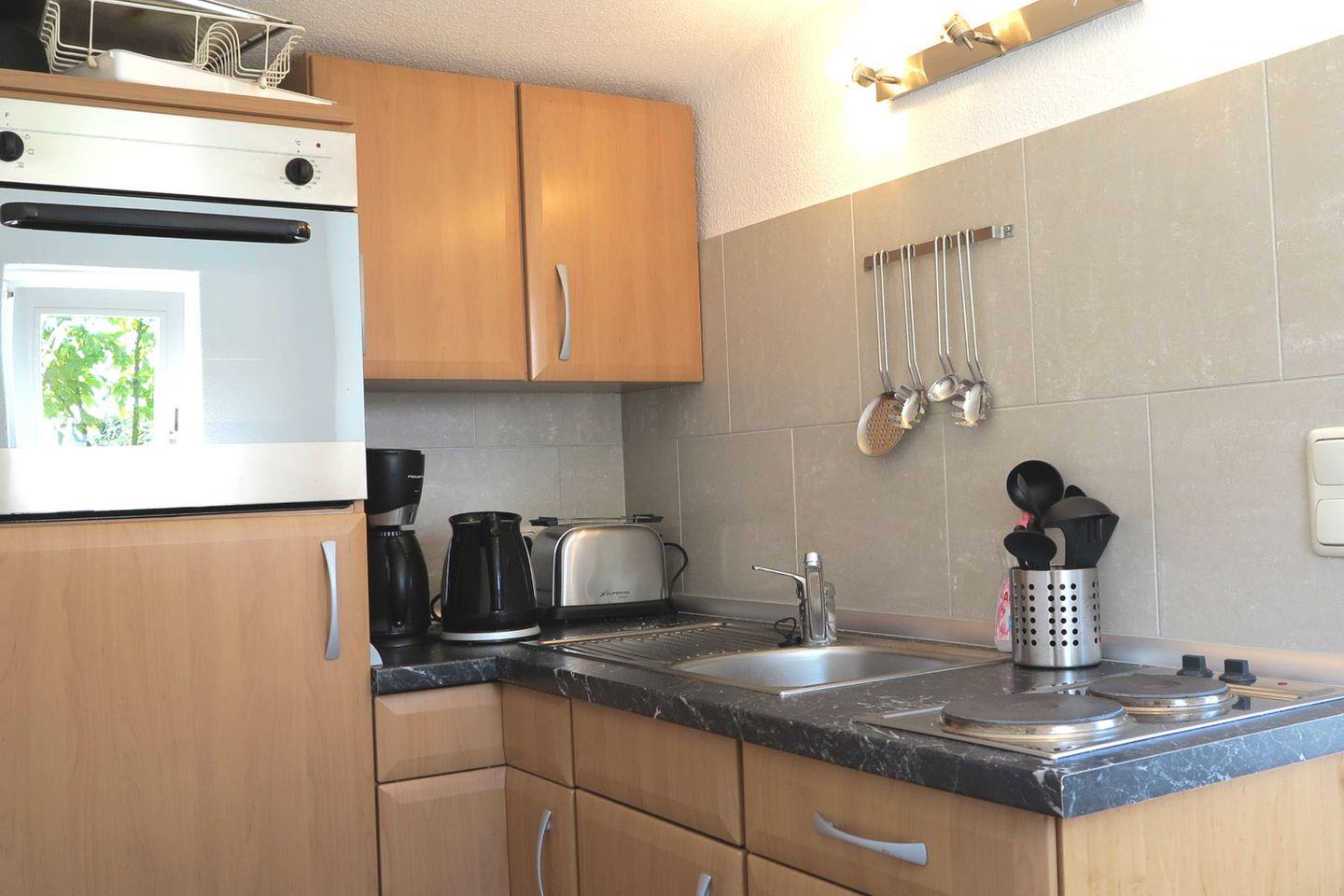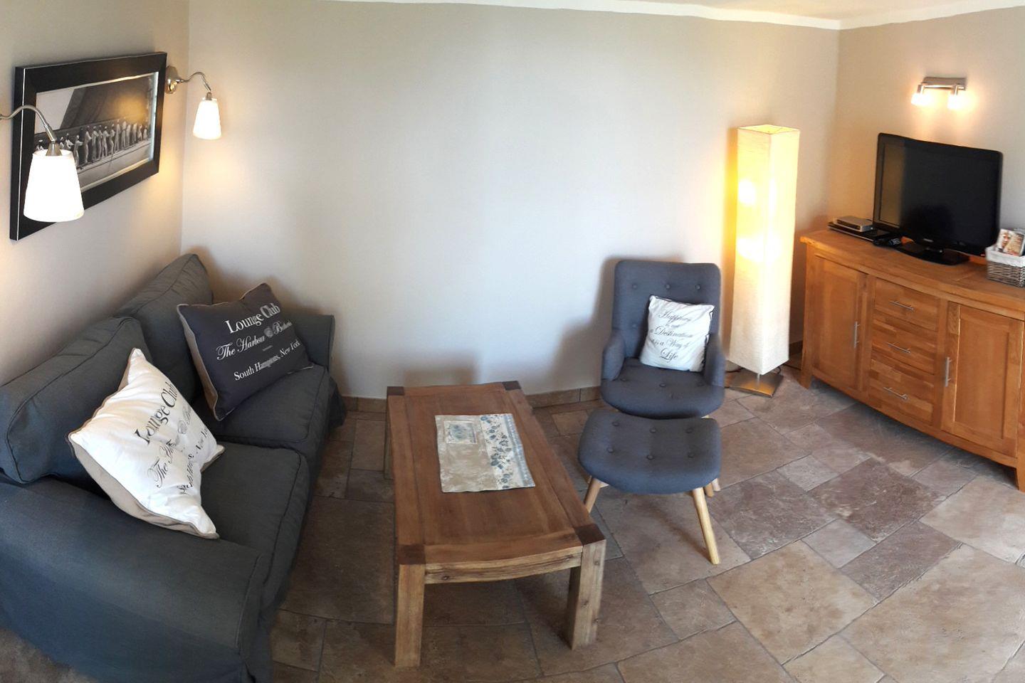 Der Wohnbereich ist als Wohnzimmer mit Sofaecke und Essbereich gestaltet und geht in eine offene Küche über. Für Ihre Selbstversorgung stehen unter anderem ein Elektro-Backofen, eine Mikrowelle, ein 2-Platten-Herd, Kühlschrank mit Gefrierfach, Kaffeemaschine, Toaster und Wasserkocher bereit; Geschirr und Besteck sind vorhanden. Zur Unterhaltung gibt es WLAN, Internet, ein Radio sowie einen Kabel-TV (1 Gerät, 35–44 Zoll). Sichtschutz an allen Fenstern unterstützt eine angenehme Privatsphäre.