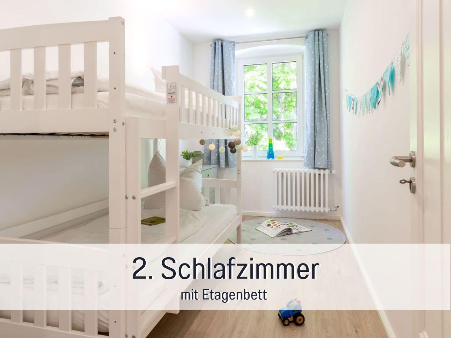 Ein Kinderzimmer mit einem stabilen Etagenbett. Ein helles Duschbad mit Fenster sorgt für einen frischen Start in den Tag.