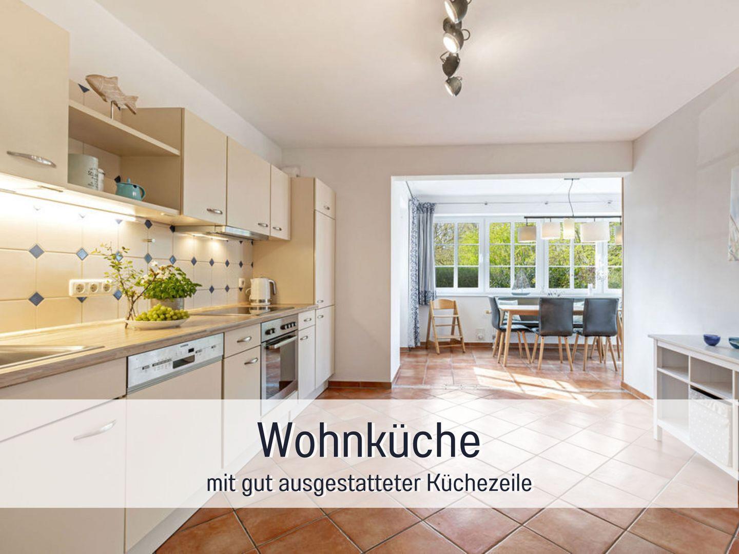 Der Mittelpunkt des Hauses ist das lichtdurchflutete Wohnzimmer mit großem Esstisch und gemütlicher Couchecke. Wenn es draußen mal stürmt, sorgt der Kaminofen für knisternde Romantik und wohlige Wärme. Angrenzend findet ihr die riesige Wohnküche, die keine Wünsche offenlässt. Highlight für Hobbyköche: Der Side-by-Side Kühlschrank bietet massig Platz für den Großeinkauf einer 8-köpfigen hungrigen Meute.