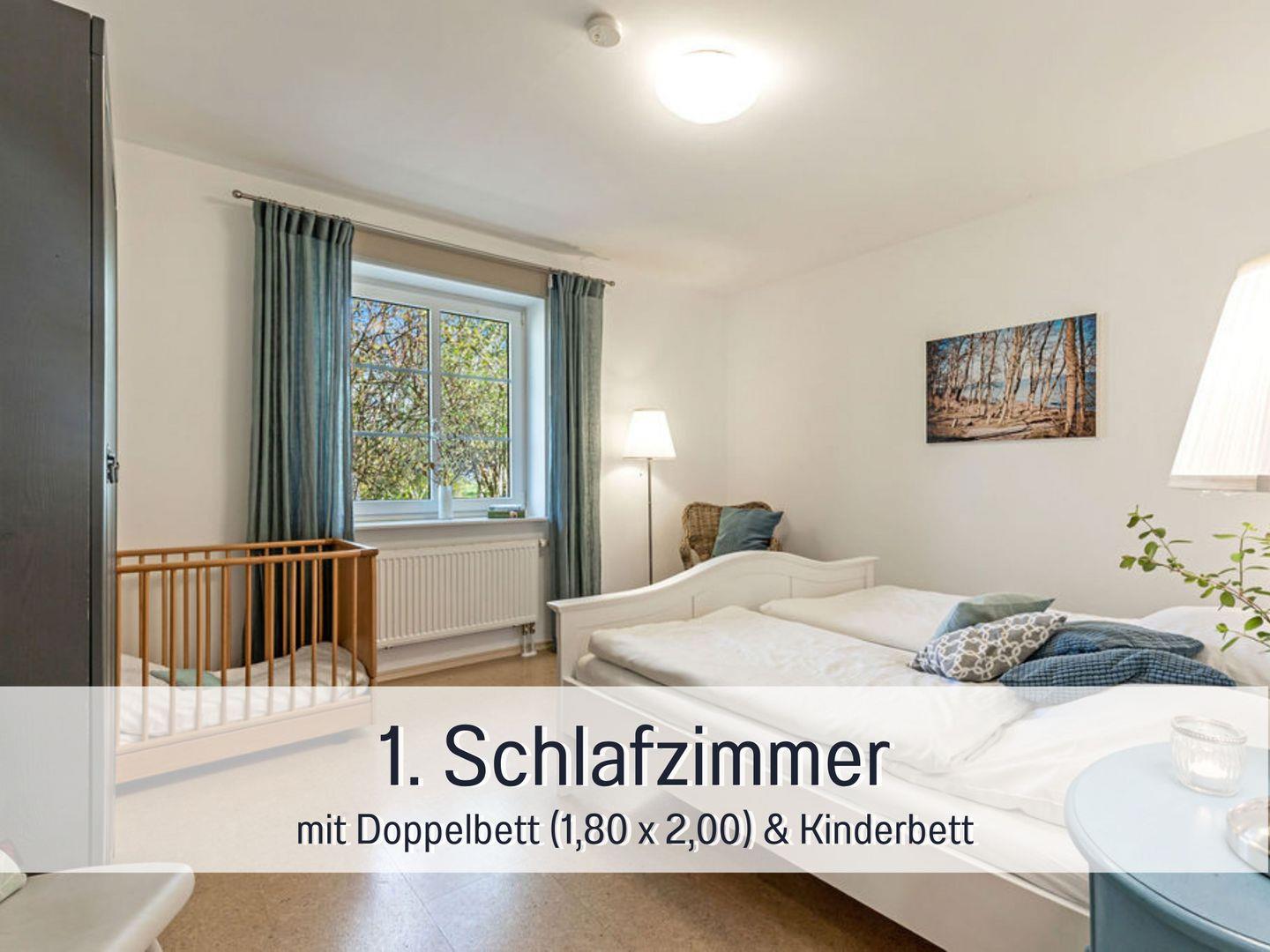 Schlafzimmer mit Doppelbett, Kinderbett & Schlafsessel.