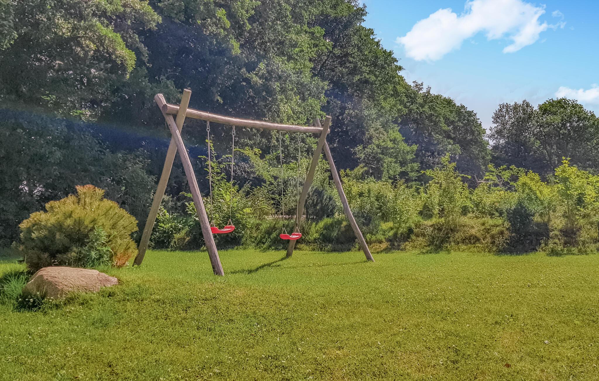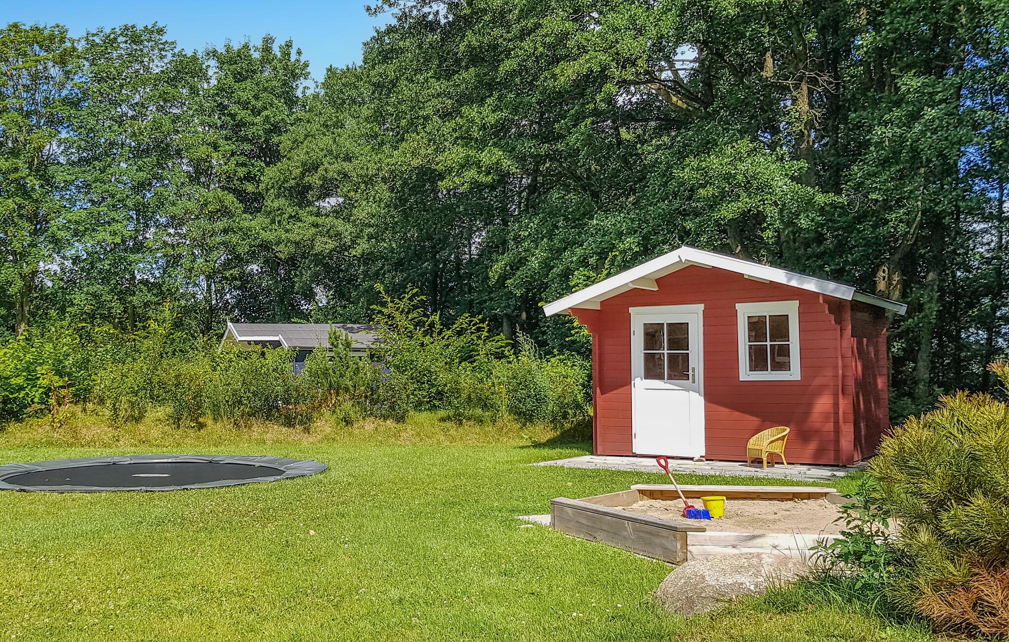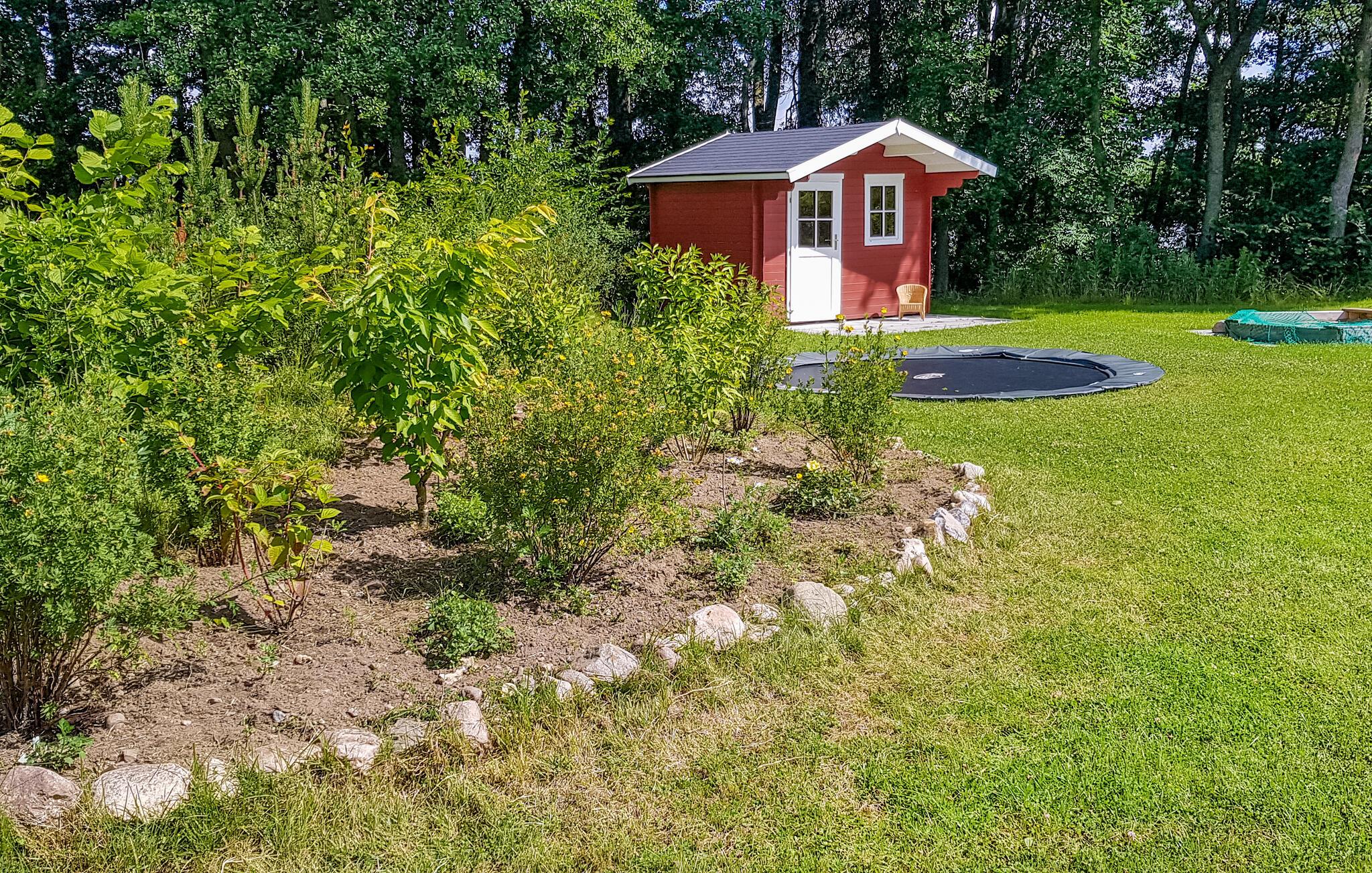 In den Sommermonaten locken Sie die Sonnenstrahlen auf die großzügige Terrasse, auf der Sie sich herrlich entspannen und mit der ganzen Familie frühstücken können. Das Grundstück ist groß und bietet ausreichend Platz, um eine Runde Federball oder Wikingerschach zu spielen. Besonders Ihre Kinder werden sich hier wohlfühlen, denn ein ebenerdiges Trampolin, ein Sandkasten, eine Schaukel sowie verschiedene Spiele für drinnen und draußen stehen bereit.