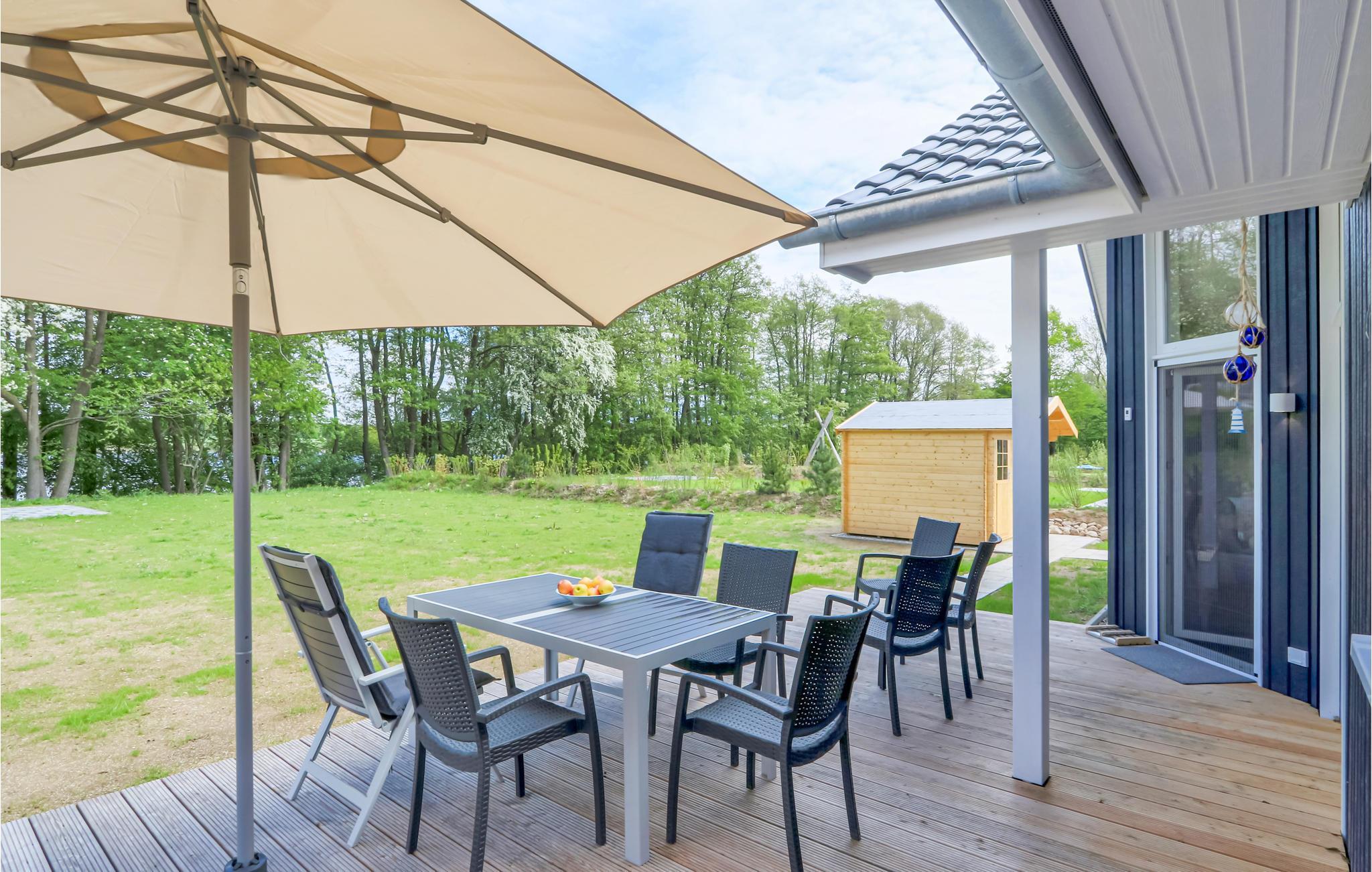 Modernes Holzhaus "Seezauber" im skandinavischen Stil am Wardersee, ideal für Familien mit Sauna und direktem Seezugang.