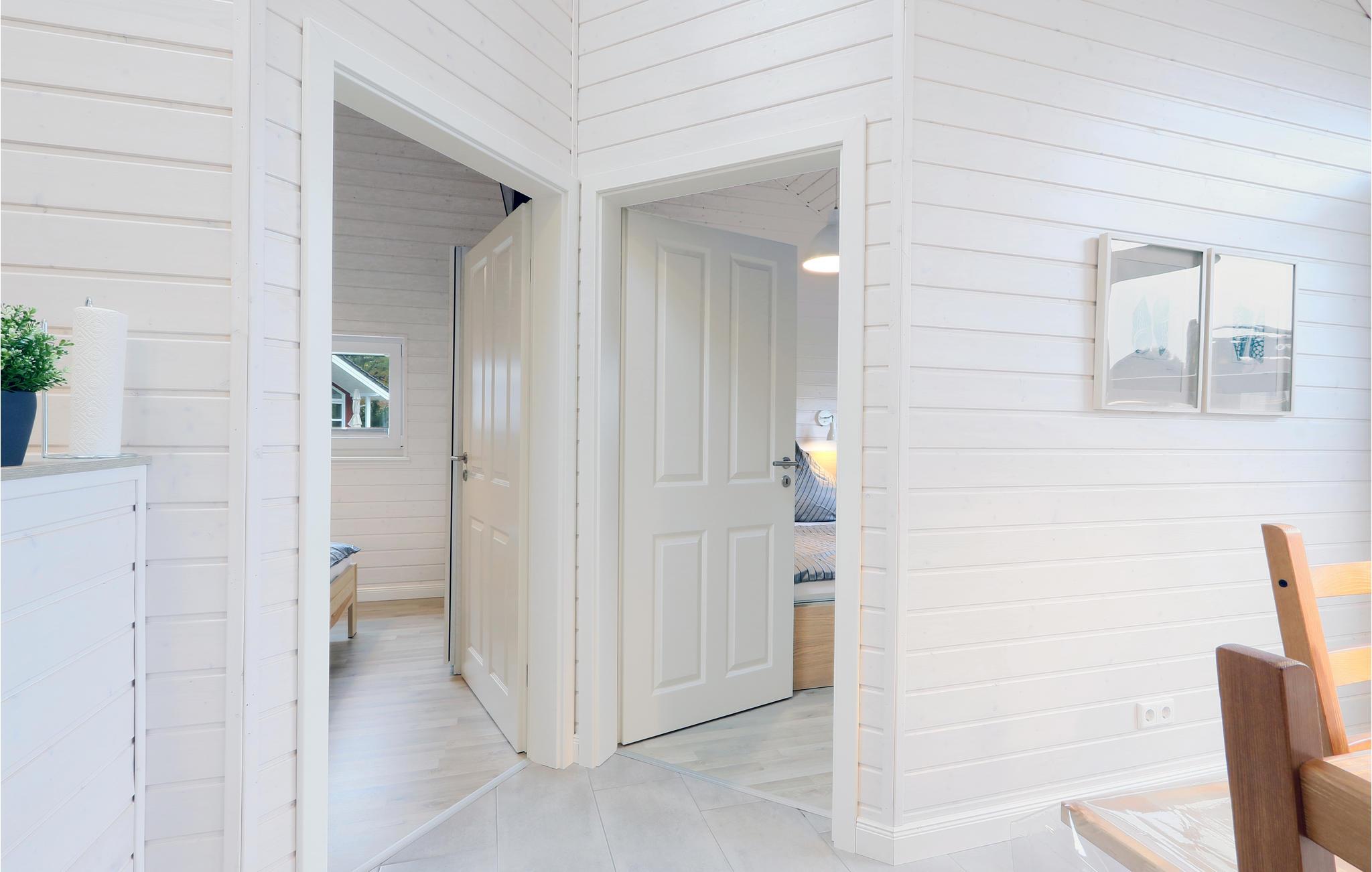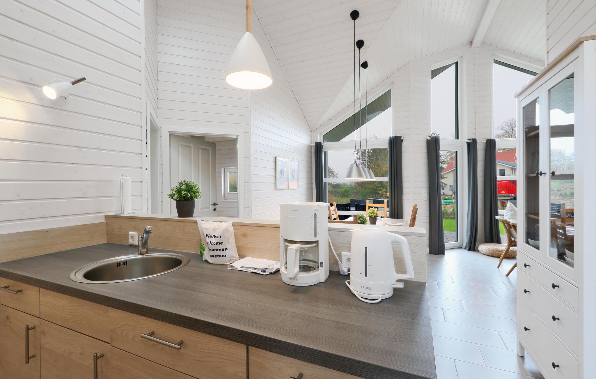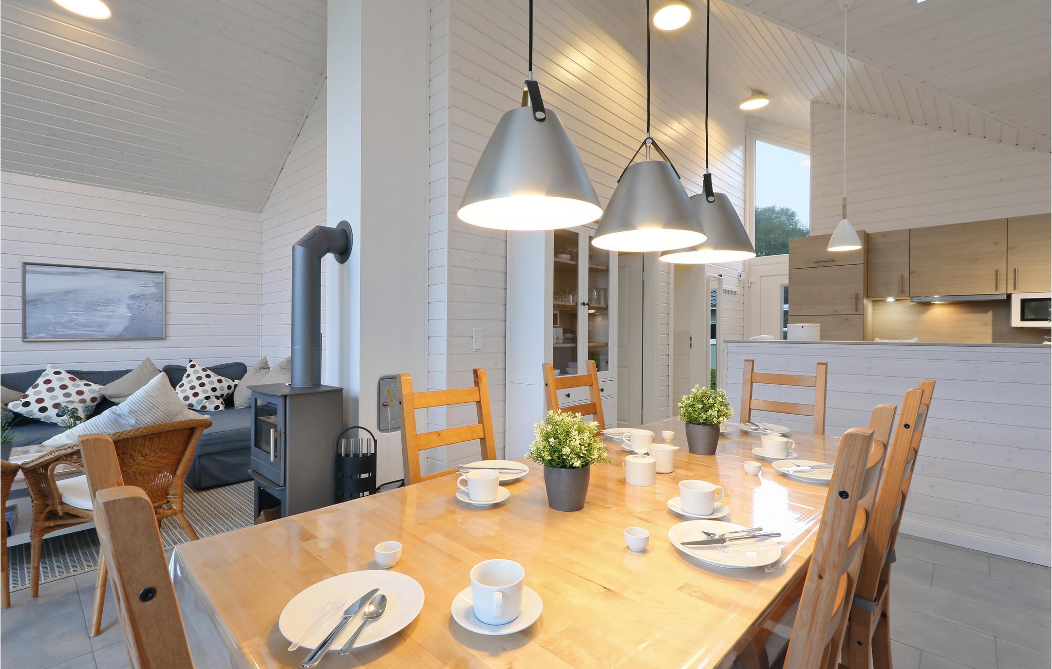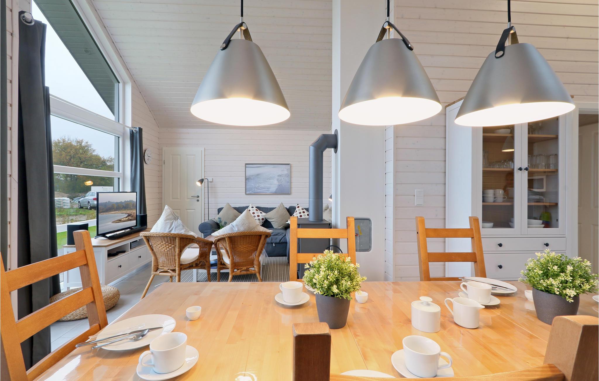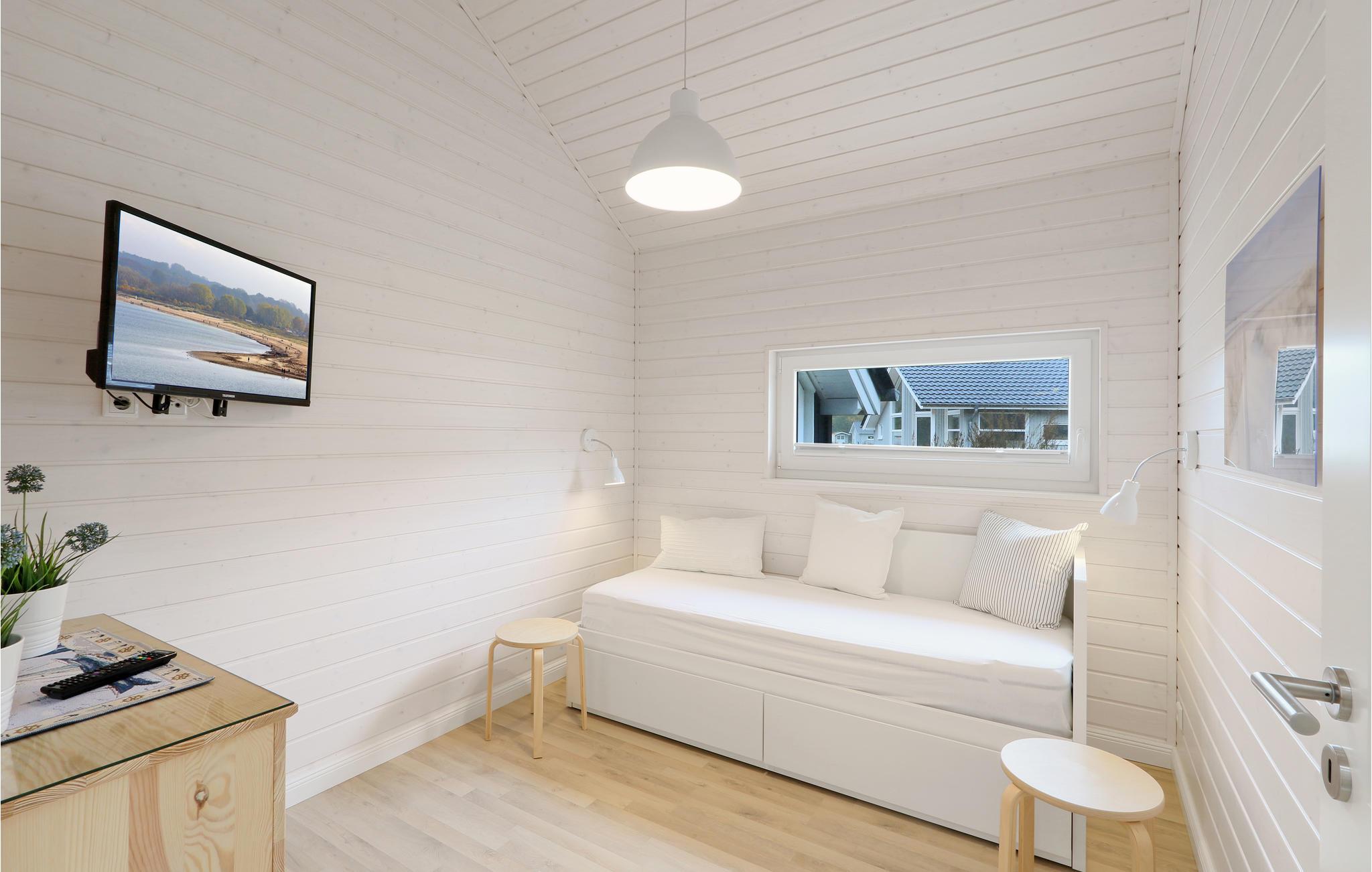 Das moderne Holzhaus „Seezauber“ überzeugt durch den skandinavischen Stil und bietet ausreichend Platz für 5 Erwachsene und 3 Kinder. Aufgrund der firsthoch offenen Decke genießen Sie hier ein angenehmes Raumgefühl und lichtdurchflutete Zimmer. Die maritime Einrichtung in hellen Tönen trägt zur Gemütlichkeit bei.