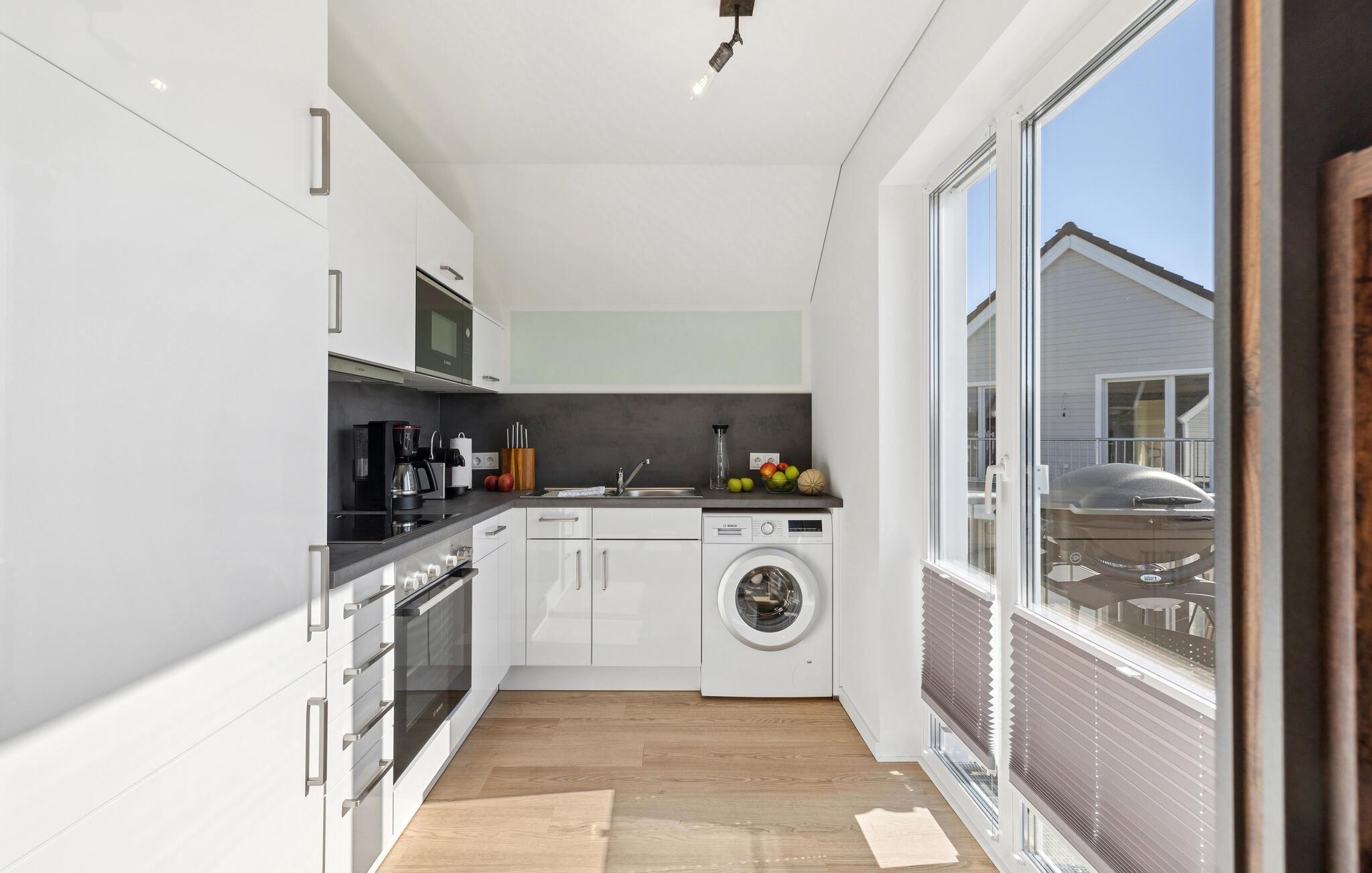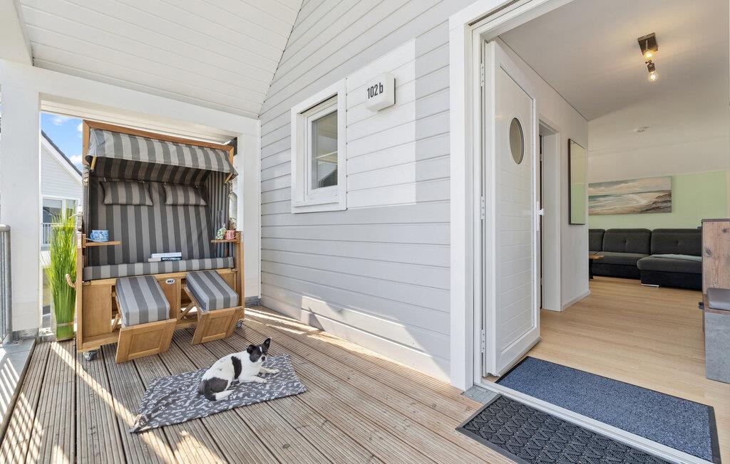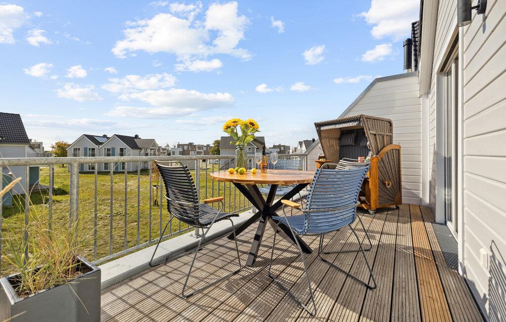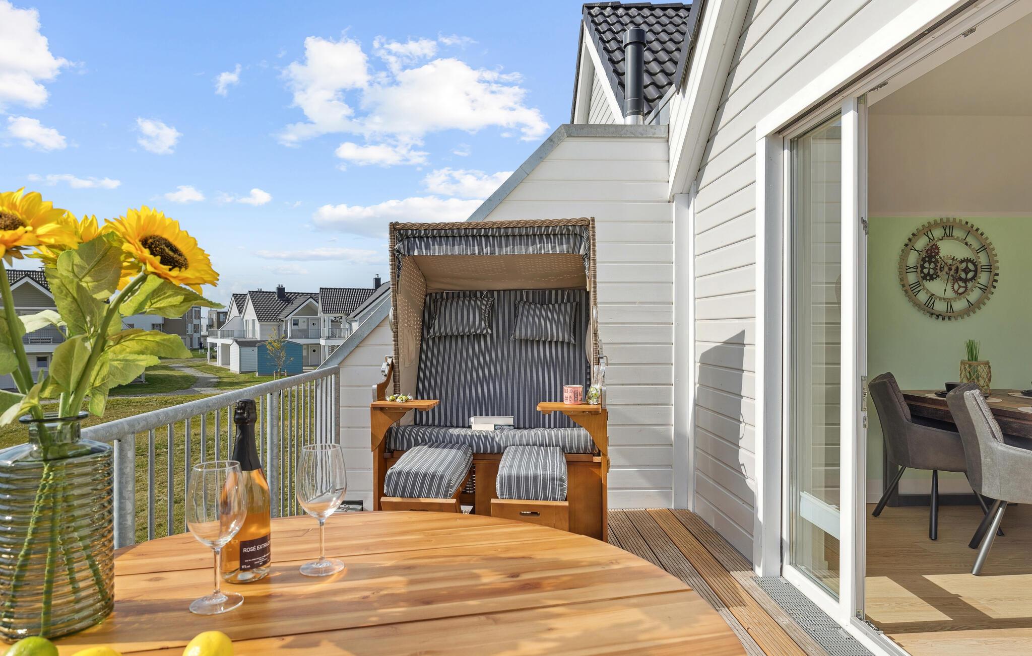 Die Küche präsentiert sich in höchstem Standard, voll ausgestattet und bereit für kulinarische Abenteuer. Von diesem Bereich aus betretet ihr den geräumigen Balkon, auf dem ein weiterer Strandkorb und ein Grill neben dem Balkontisch auf euch warten. Hier könnt ihr unter freiem Himmel die frische Luft genießen und den Urlaub in vollen Zügen auskosten. Einen zweiten überdachten Balkon könnt ihr über den Flur betreten.