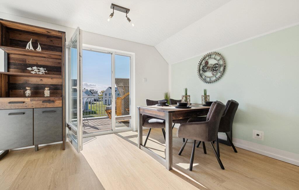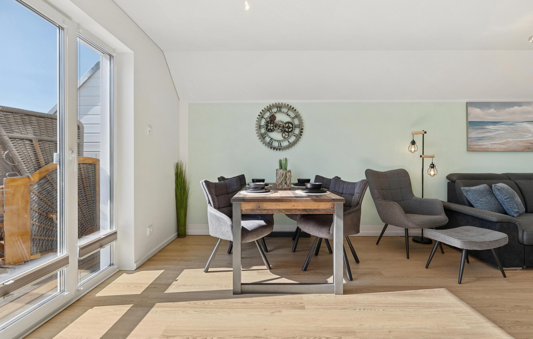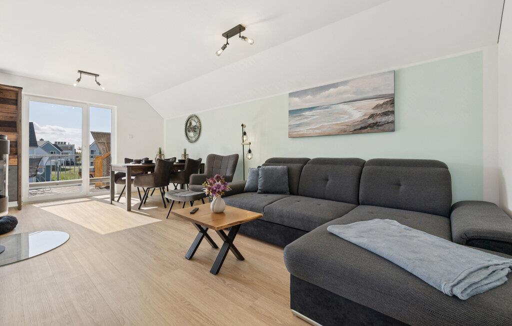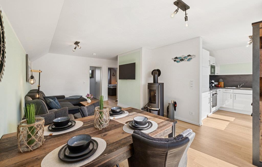 Bereits vor dem Eintreten in die Wohnung heißt euch ein gemütlicher Balkon mit einem Strandkorb willkommen. Beim Betreten der Wohnung öffnet sich ein Flur, der den Weg in den großzügigen, offenen Wohn-/Essbereich mit angrenzender Küche weist. Hier erwartet euch eine komfortable Sitzlandschaft, die förmlich zum Entspannen einlädt, während der Smart TV für beste Unterhaltung sorgt. Der Kamin verleiht dem Raum eine rustikale Atmosphäre, ideal für gesellige Abende. Ein großer Esstisch bietet nicht nur genügend Platz für gemeinsame Mahlzeiten, sondern wird auch zum Mittelpunkt fröhlichen Beisammenseins.