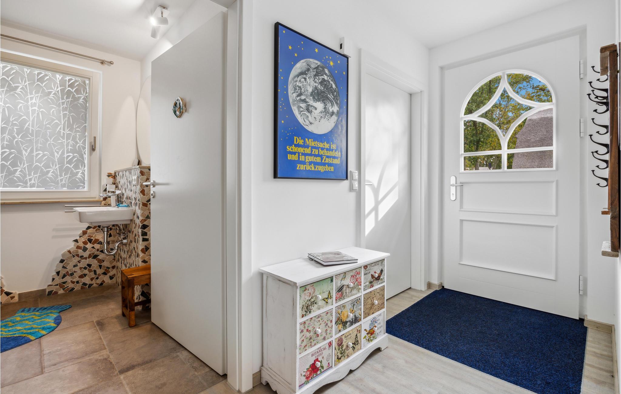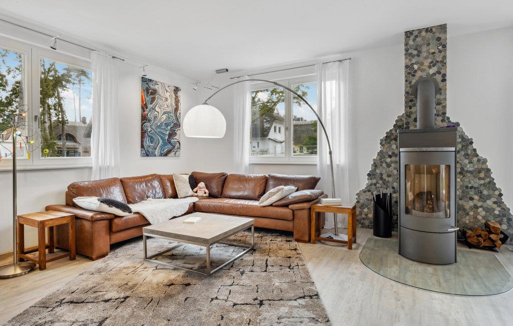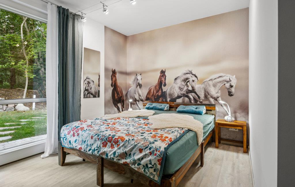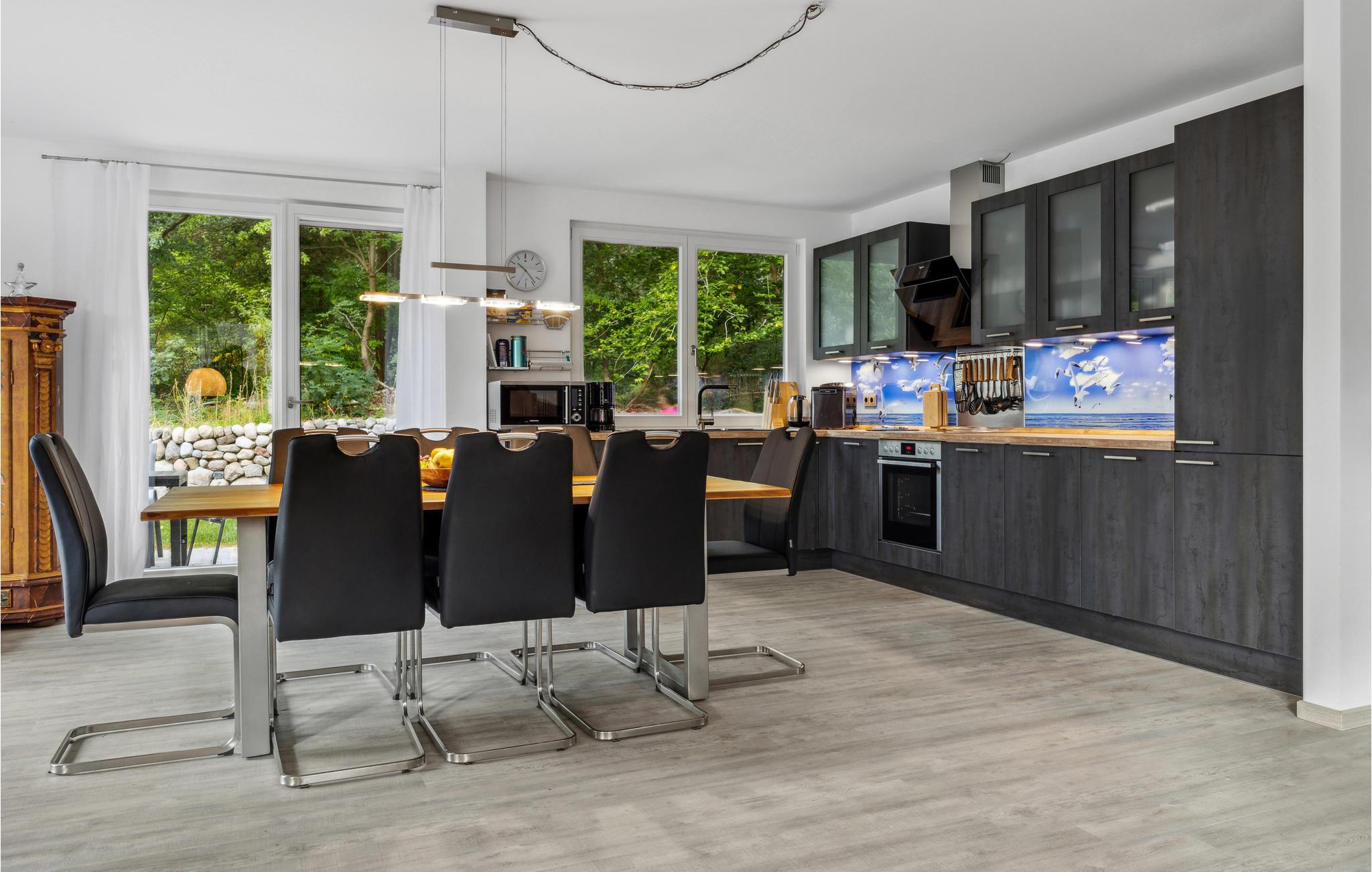 Dieses großzügige, freistehende Ferienhaus bietet viel Platz auf zwei Etagen. Betreten Sie das Haus und freuen sich auf eine individuelle Einrichtung mit markanten Fototapeten und ansprechender Einrichtung. Für wohlige Wärme im Wohnraum sorgt der Holzofen. Kommen Sie zu Brettspielen oder geselligen Unterhaltungen auf dem Sofa oder am Esstisch zusammen und gönnen sich Erholung in Ihrer privaten Infrarot-Sauna. Vom kombinierten Wohn- und Essbereich erreichen Sie die Terrasse, auf der Sie die herrlichen Sonnenstunden Usedoms genießen können
