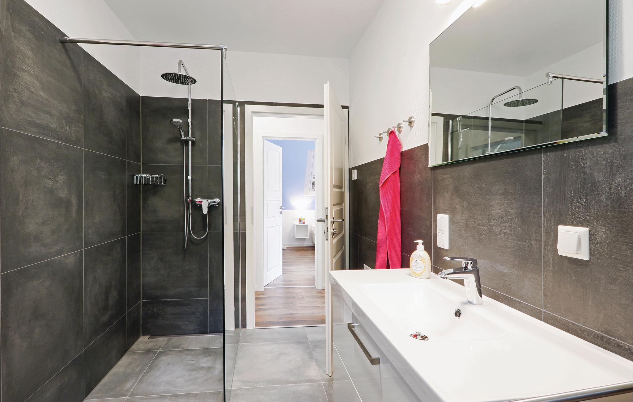 Im Obergeschoss verfügt das erste Schlafzimmer über ein gemütliches Doppelbett, im zweiten Schlafzimmer befinden sich zwei Einzelbetten, die sich aber auch zusammenstellen lassen, sowie ein Kleinkinderbett mit dünner Faltmatratze. Das großzügige, moderne Bad mit WC und Walk-In Dusche ist leicht von den Zimmern zu erreichen.