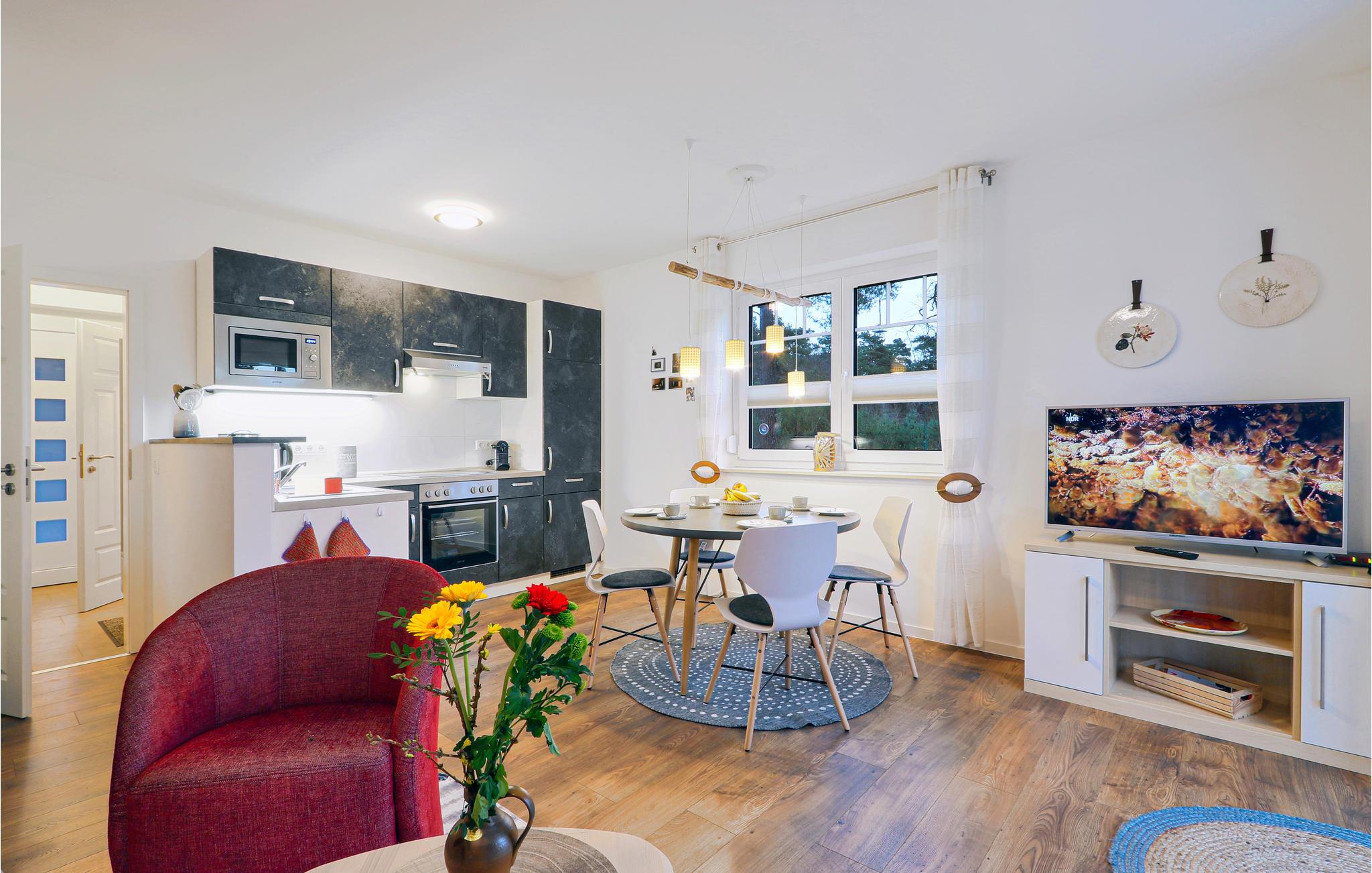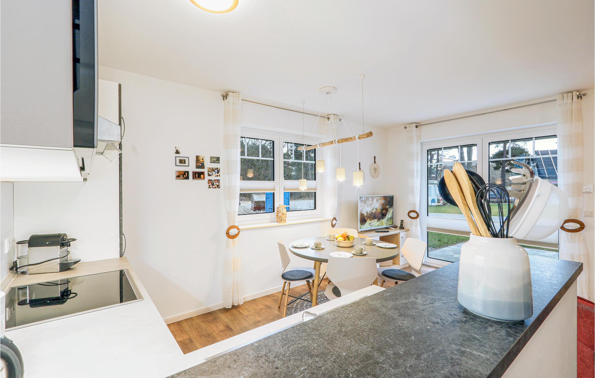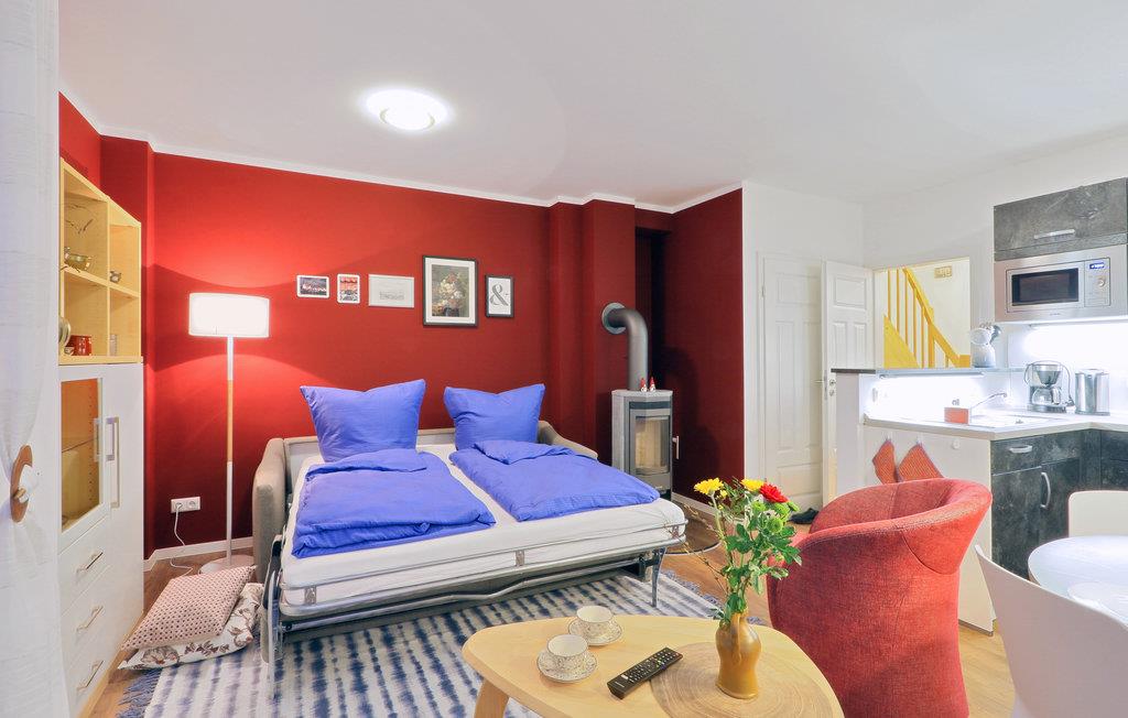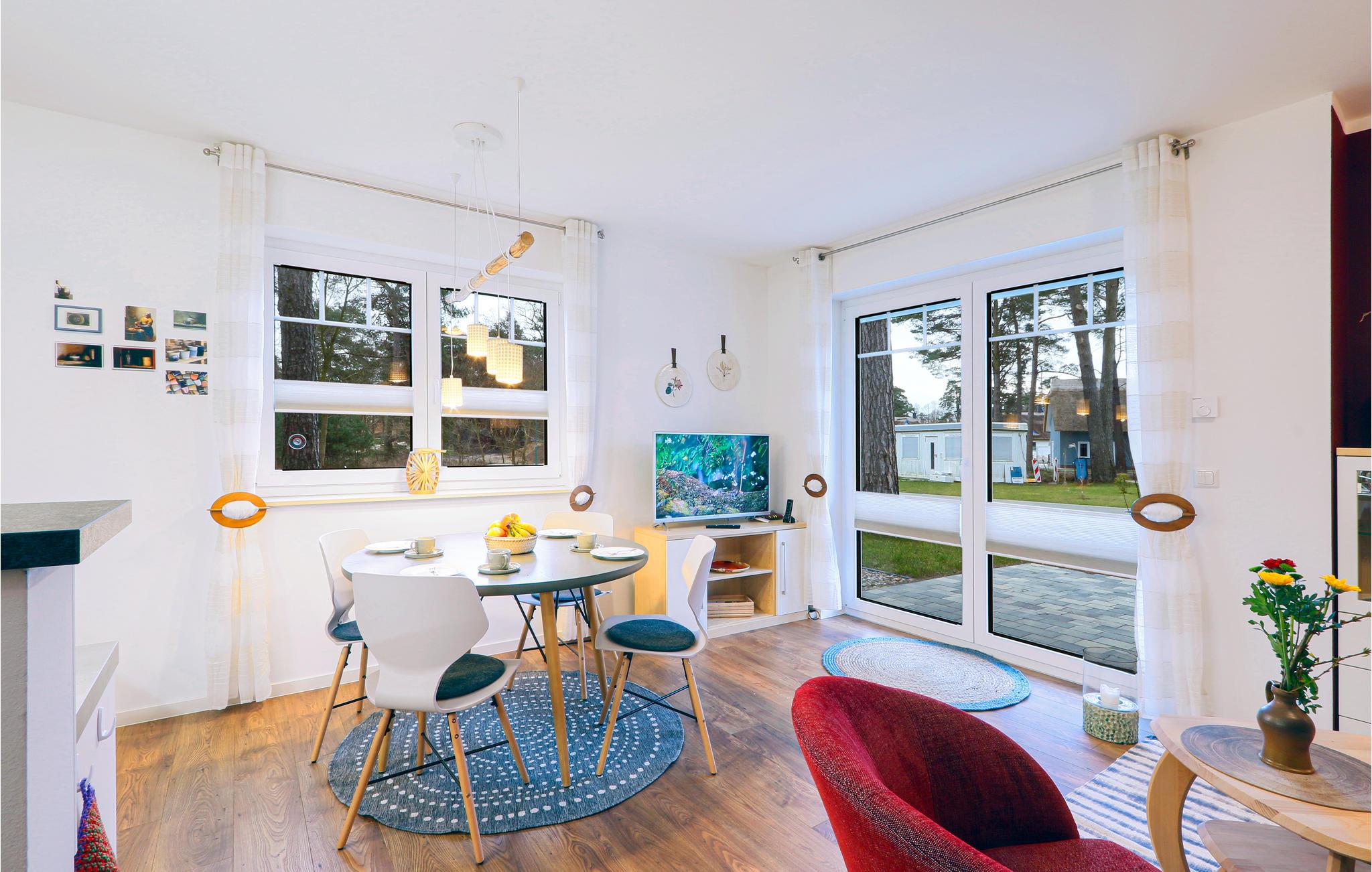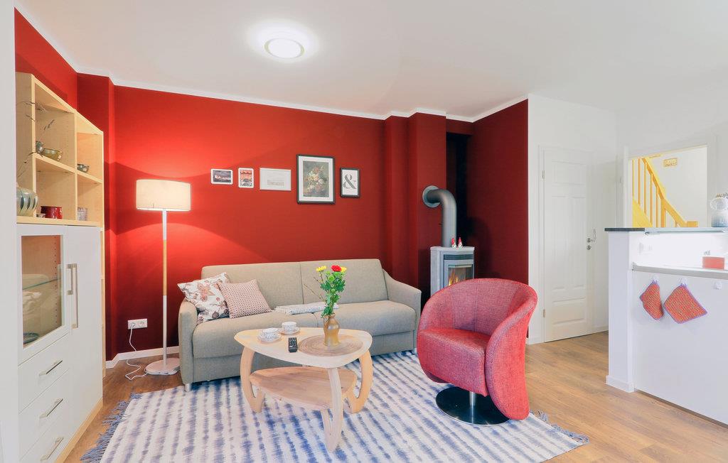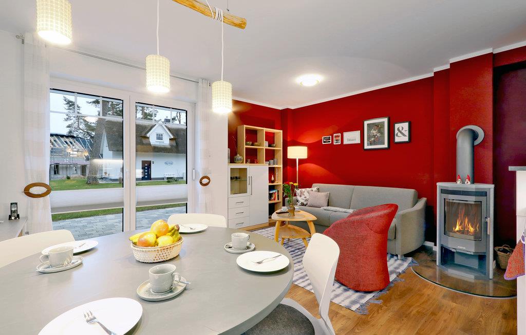 Vom Wohnbereich gelangen Sie auf die Terrasse, auf der sich als kleines Highlight der schöne Strandkorb befindet. Hier können Sie Ihren ersten Kaffee am Morgen und die herrlichen Sonnenstunden Usedoms im windgeschützten Strandkorb genießen. An kalten Tagen können Sie sich in der Infrarot-Sauna aufwärmen und es sich anschließend vor dem Kaminofen im Wohnzimmer gemütlich machen. Die Fußbodenheizung im ganzen Haus trägt ebenfalls zur Gemütlichkeit bei.