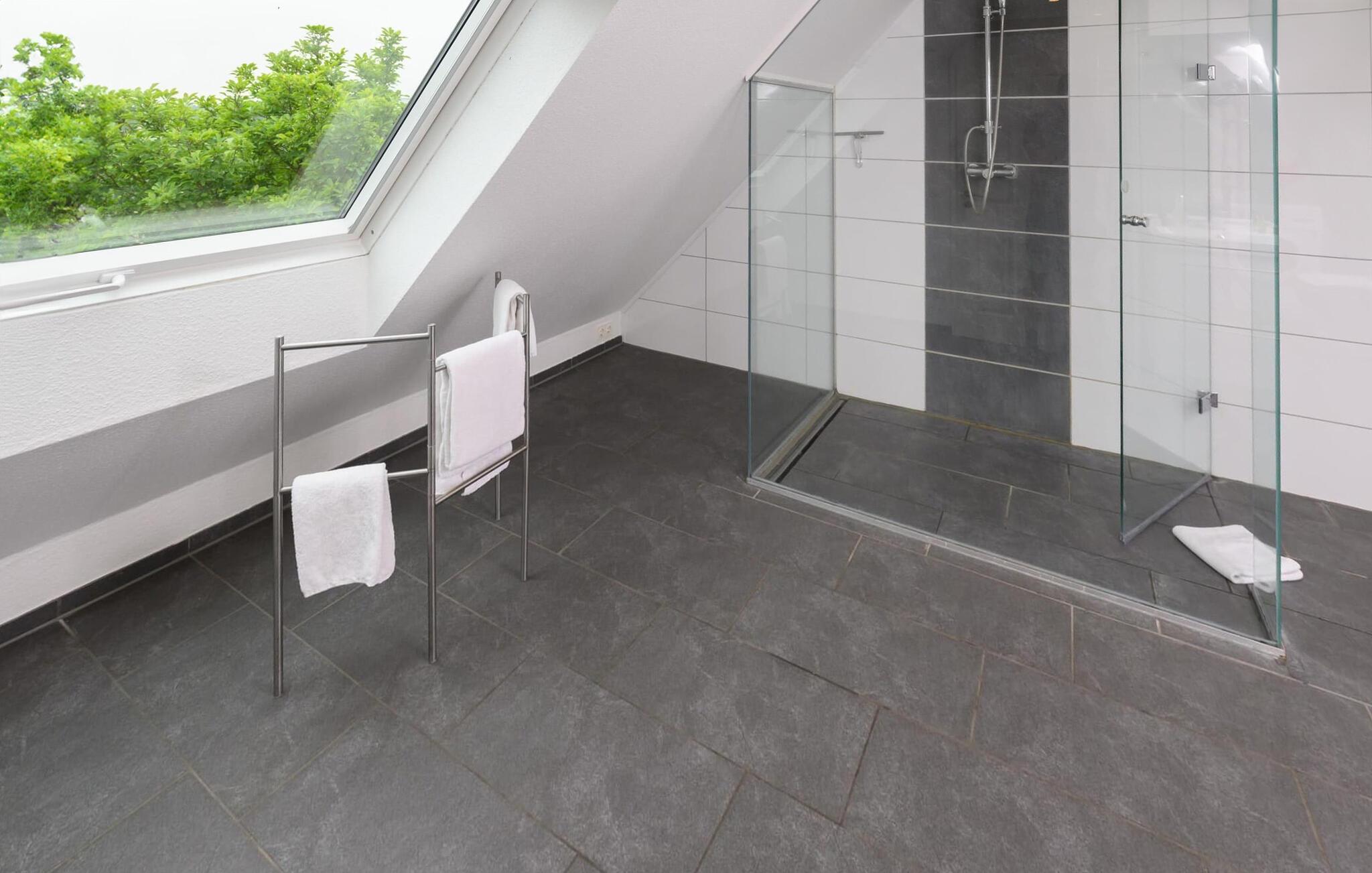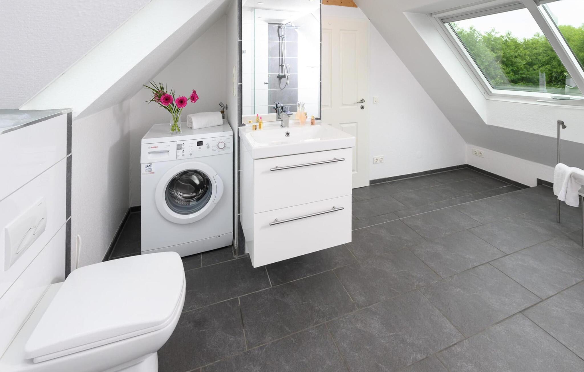 Das stilvolle und geräumige Badezimmer befindet sich ebenfalls im Dachgeschoss.