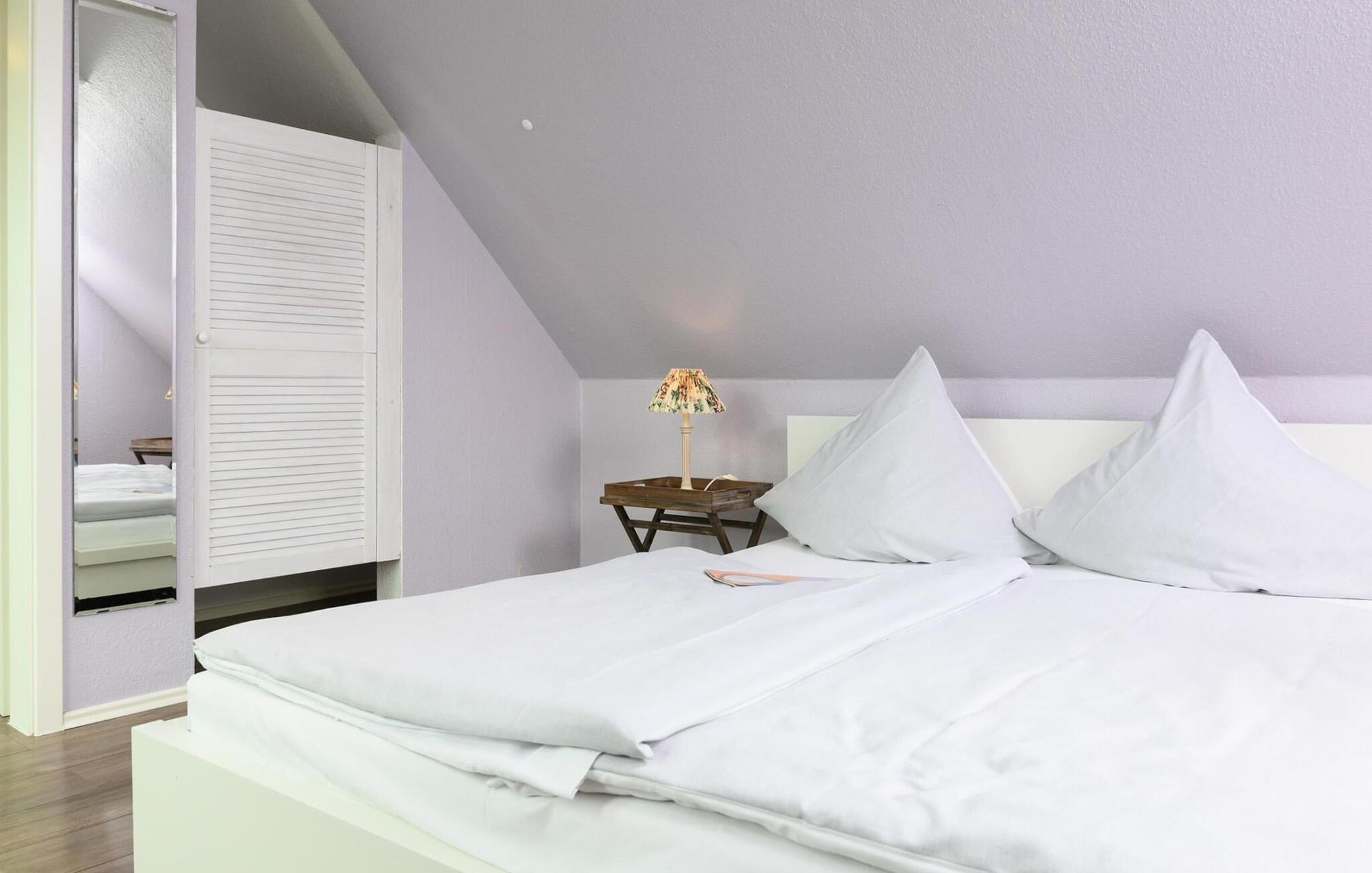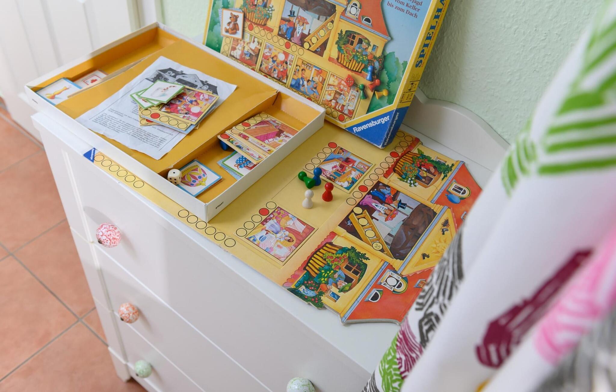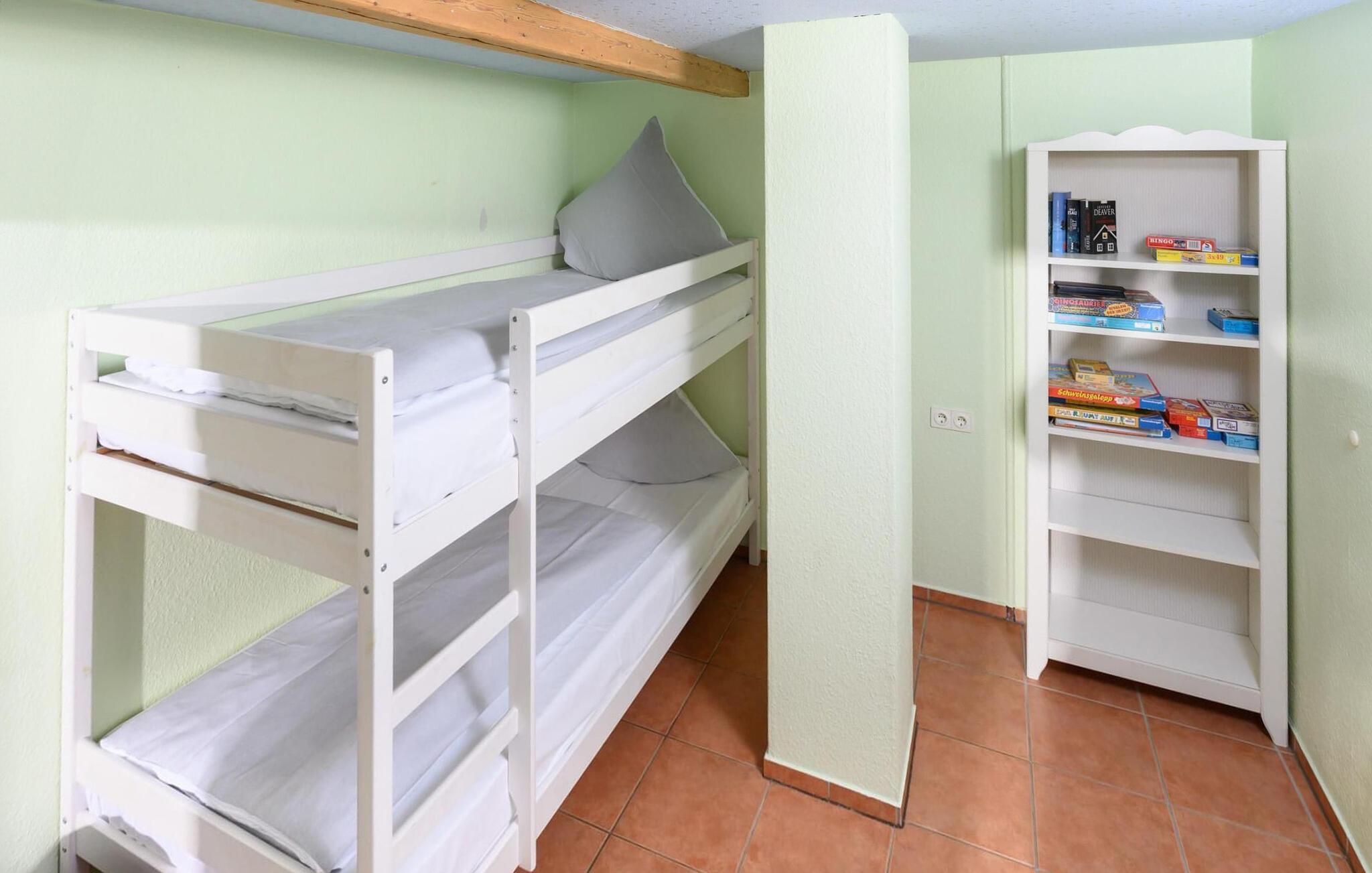 Angrenzend an den Wohnbereich und mit Blick auf den Garten befindet sich das Kinderzimmer. Vom Etagenbett aus können Sie nachts die funkelnde Sternentapete bewundern, während ein Spielschrank für Beschäftigung sorgt. Das zweite Schlafzimmer befindet sich im Dachgeschoss und zeichnet sich durch seine Helligkeit, die freiliegenden Balken im Giebel und seine liebevolle Einrichtung aus. Für 2 weitere Personen steht eine gemütliche Schlafcouch zur Verfügung.