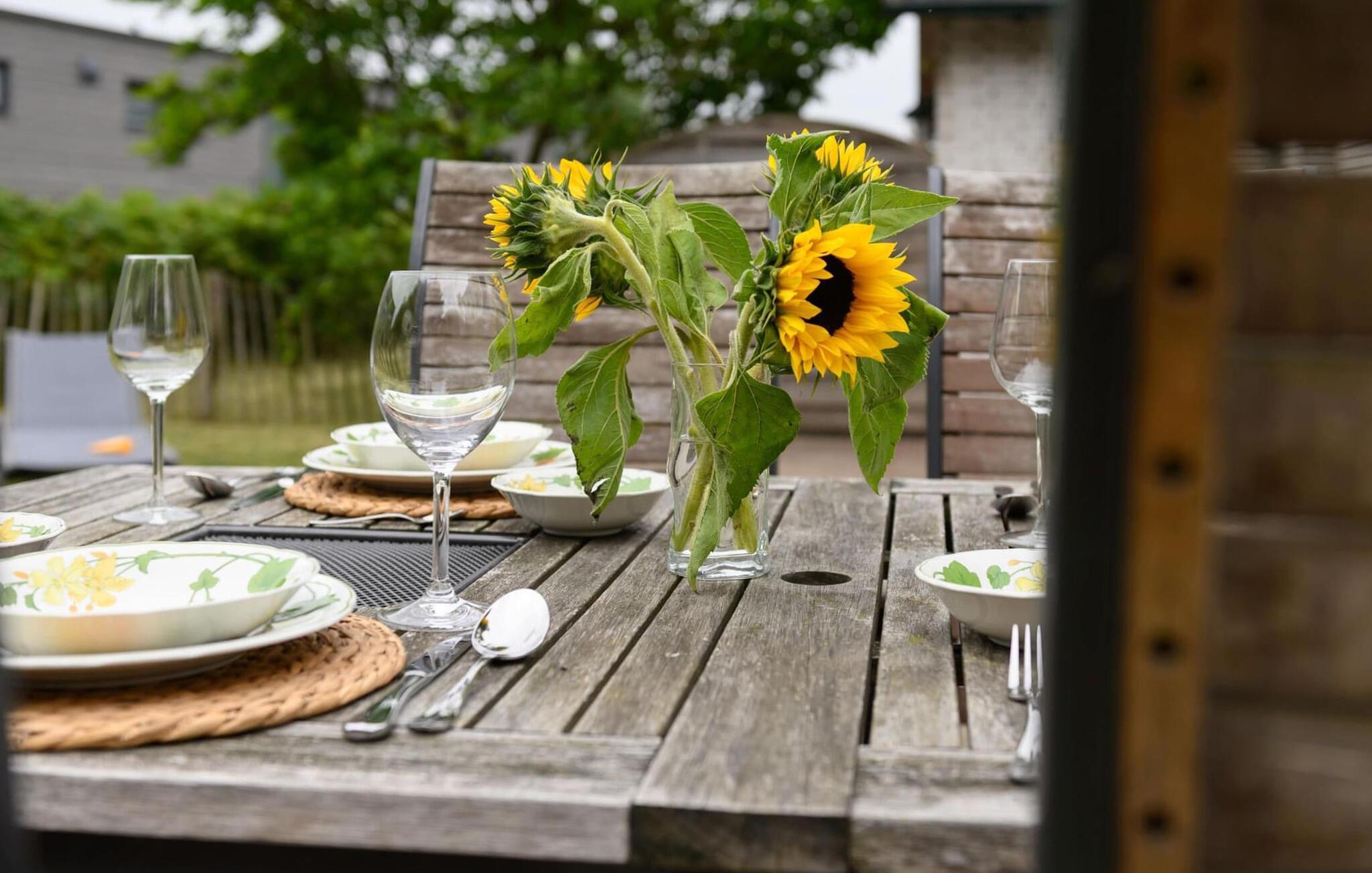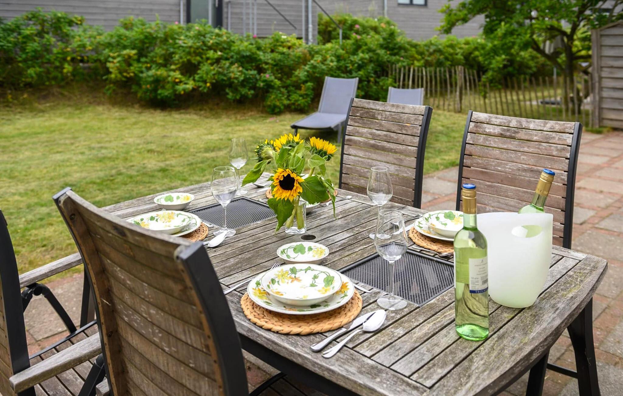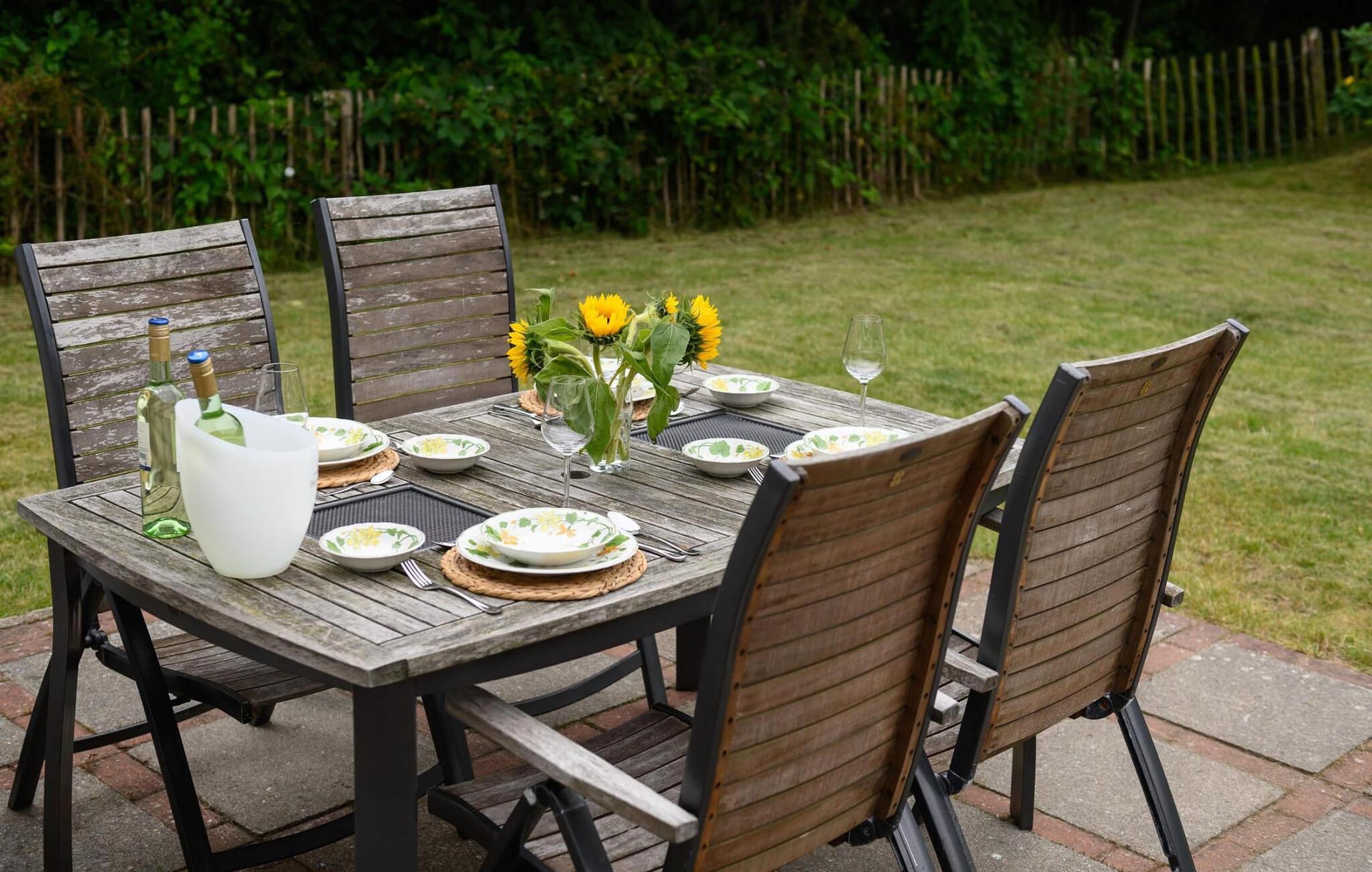 Die Terrasse verspricht den ganzen Tag Sonne und ist mit Holzmöbeln ausgestattet, perfekt für einen Grillabend. Das Grundstück ist frei nutzbar und der Garten ist eingezäunt.
