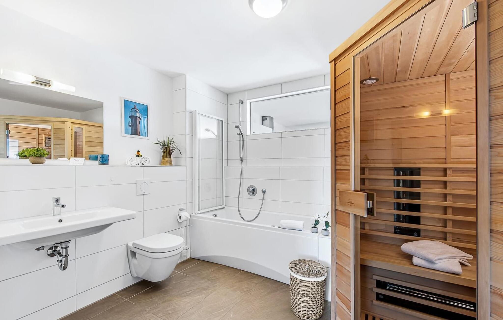 Wellness Liebhaber kommen ganz auf ihre Kosten. Ein Infrarotsauna (Wärmekabine) mit Hifi-Sound-System und LED-Farblichttherapie sowie eine Whirlpool-Badewanne laden nach dem Strandspaziergang zum Entspannen ein.