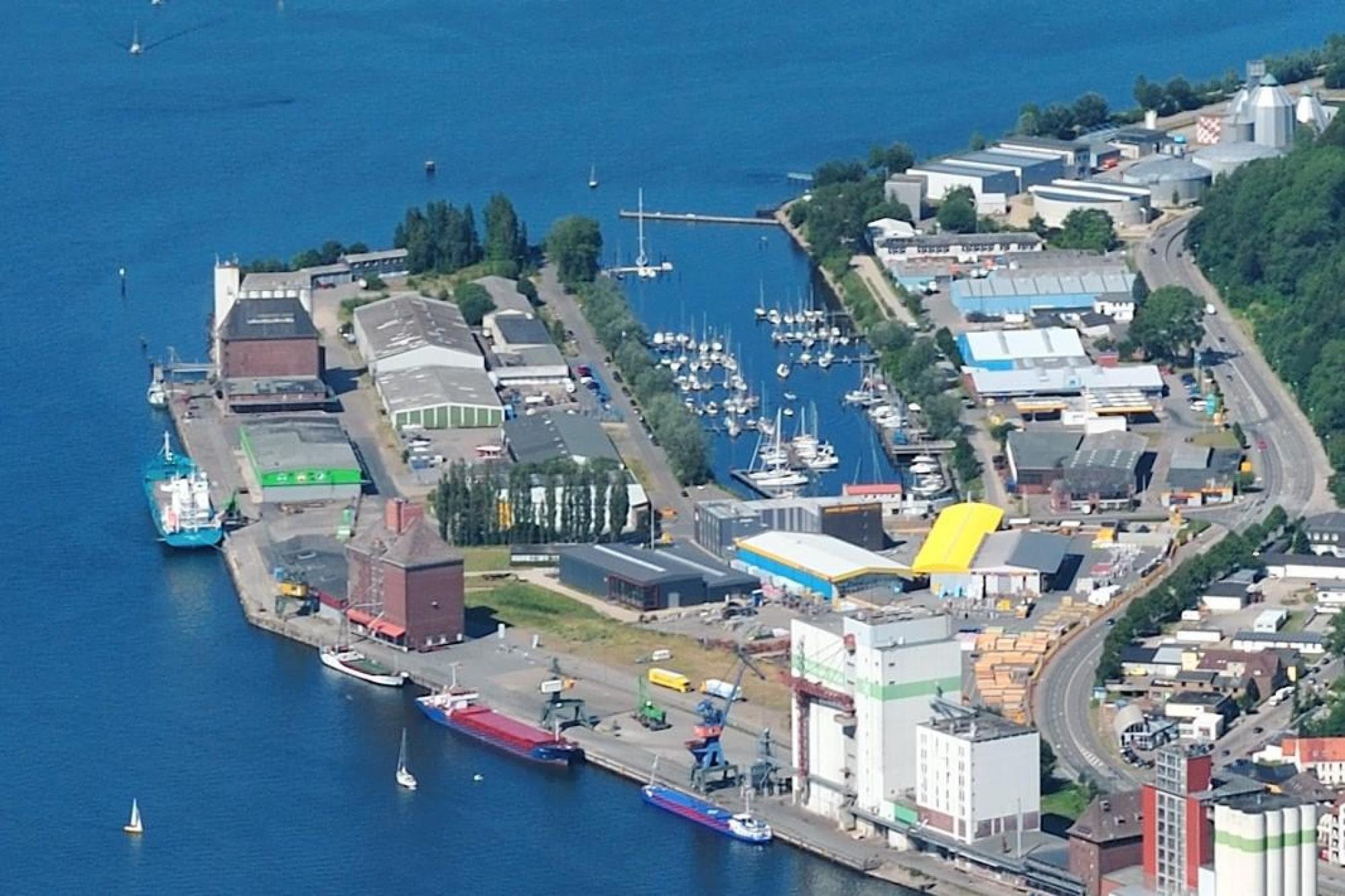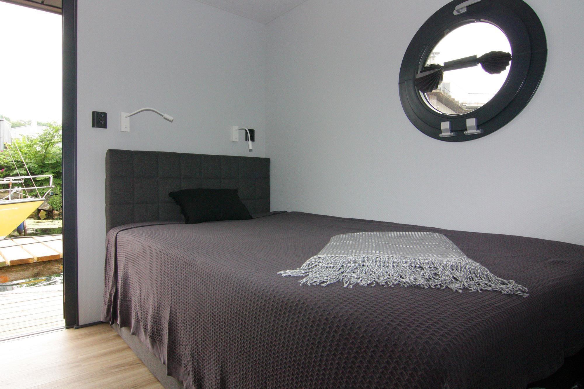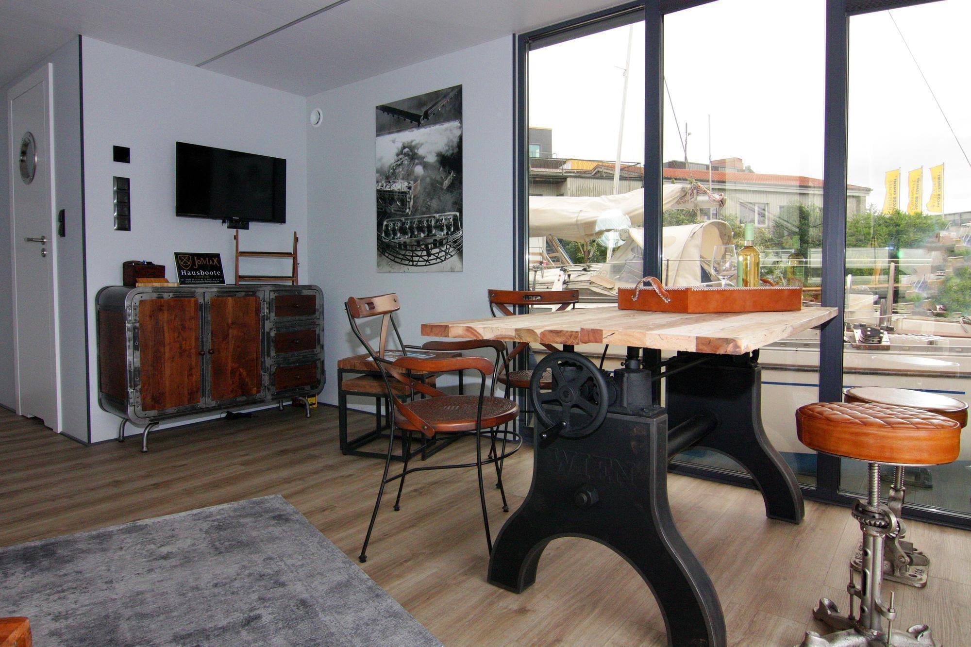 Hausboot Leni in Flensburg bietet modernes Wohnen mit Hafenblick und Dachterrasse direkt am Wasser.