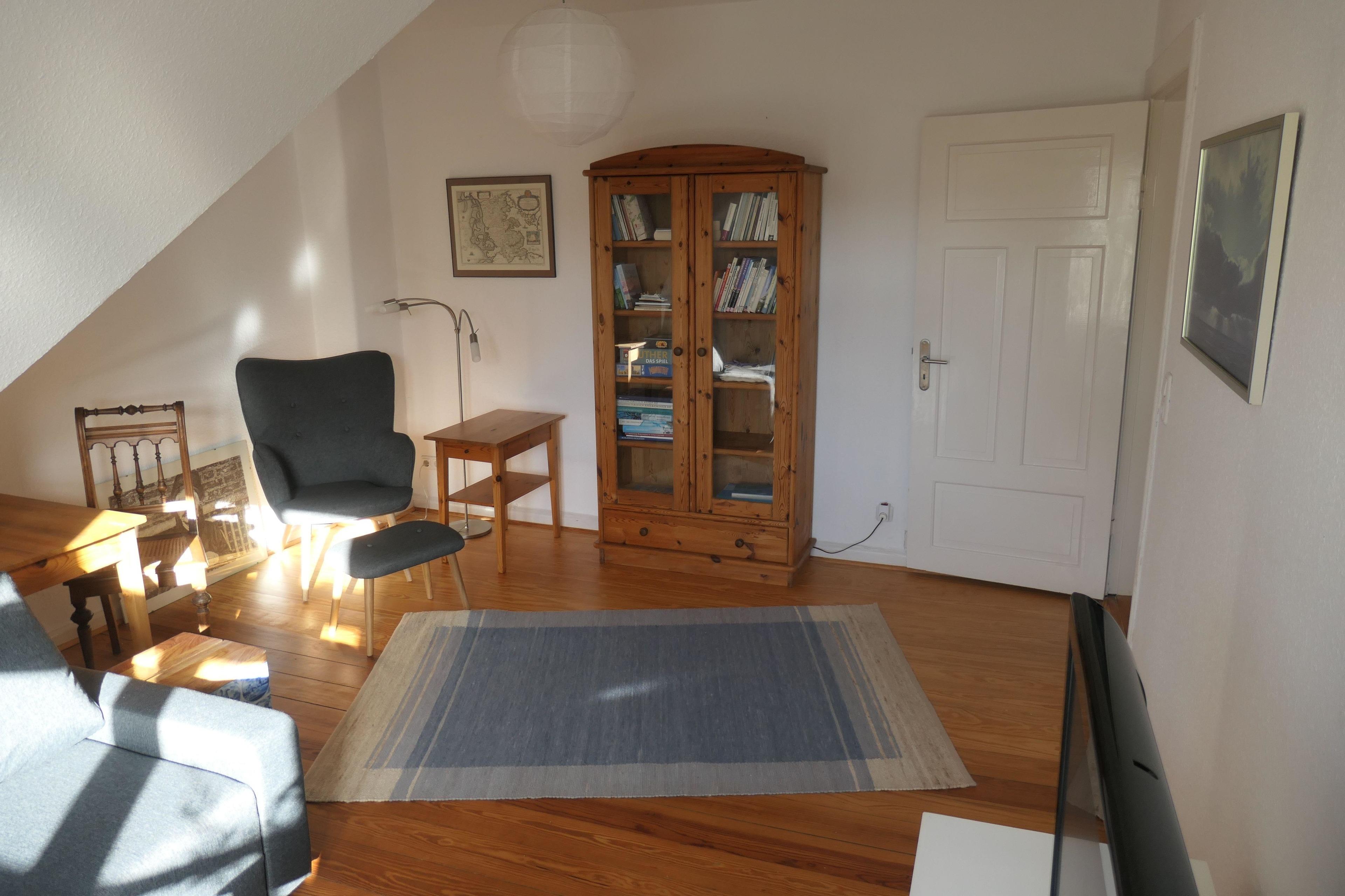 Das stilvolle Wohnzimmer ist offen gestaltet, hat eine bequeme Couch, die sich zum Schlafen ausziehen lässt und dann mit 2 Bettdecken über eine Liegefläche von 200 x 140 cm verfügt. Außerdem stehen ein gemütlicher Sessel, ein kleiner Schreibtisch und ein Bücherschrank mit einigen Büchern und Spielen zur Verfügung. Ein TV-Gerät komplettiert das Wohnzimmer.