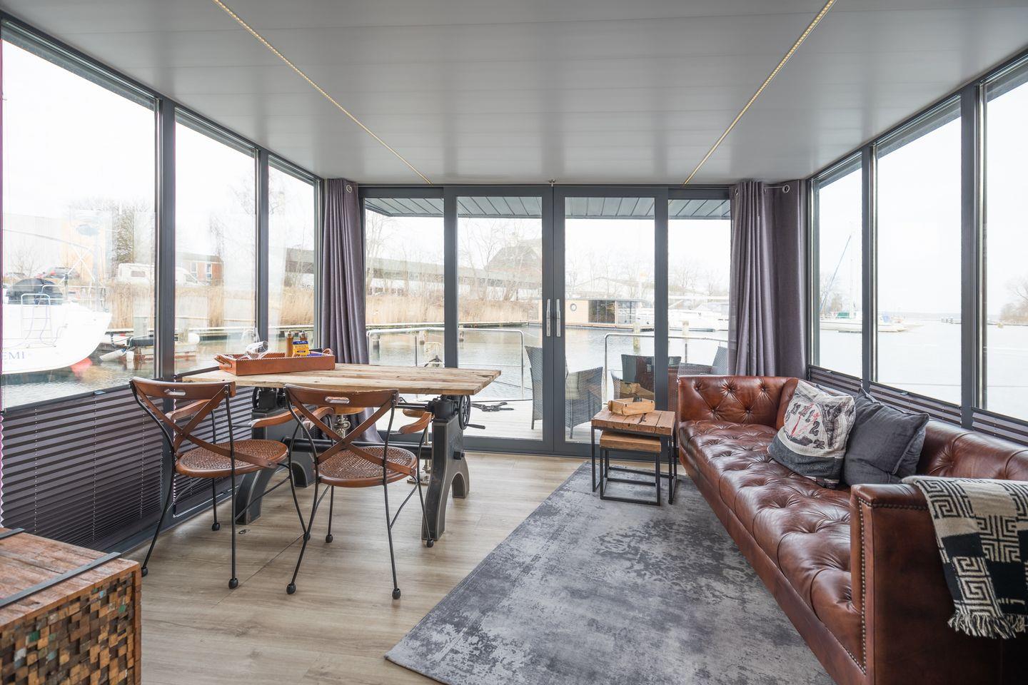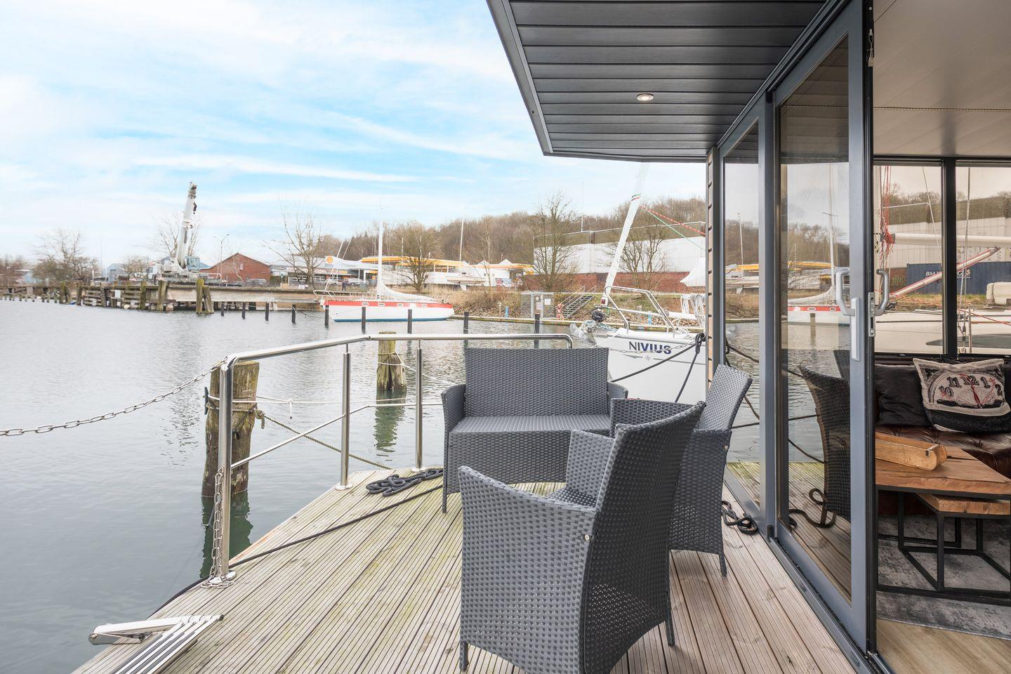Erleben Sie Luxus auf dem modernen Hausboot Leni in Flensburg mit Panoramablick und möblierter Terrasse.