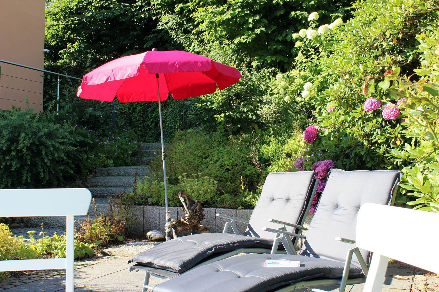 Der liebevoll angelegte Garten des Hauses mit zwei Terrassen lädt Dich zum Verweilen ein.