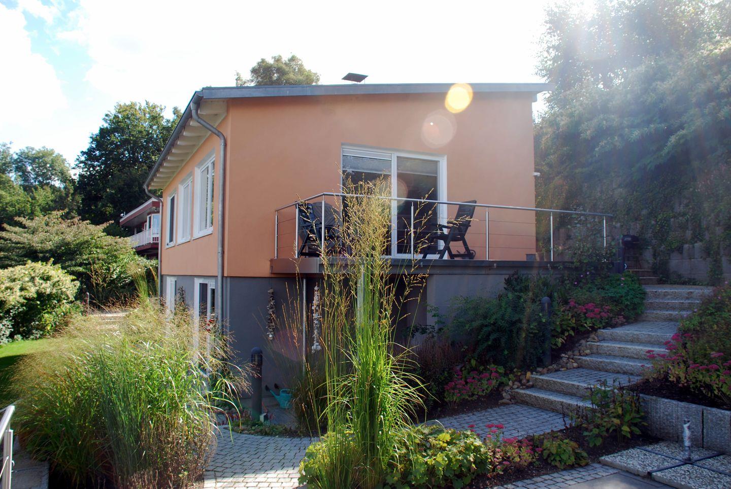 Das Haus steht in Hanglage und es führen ca. 60 Stufen zur Haustür hinauf.