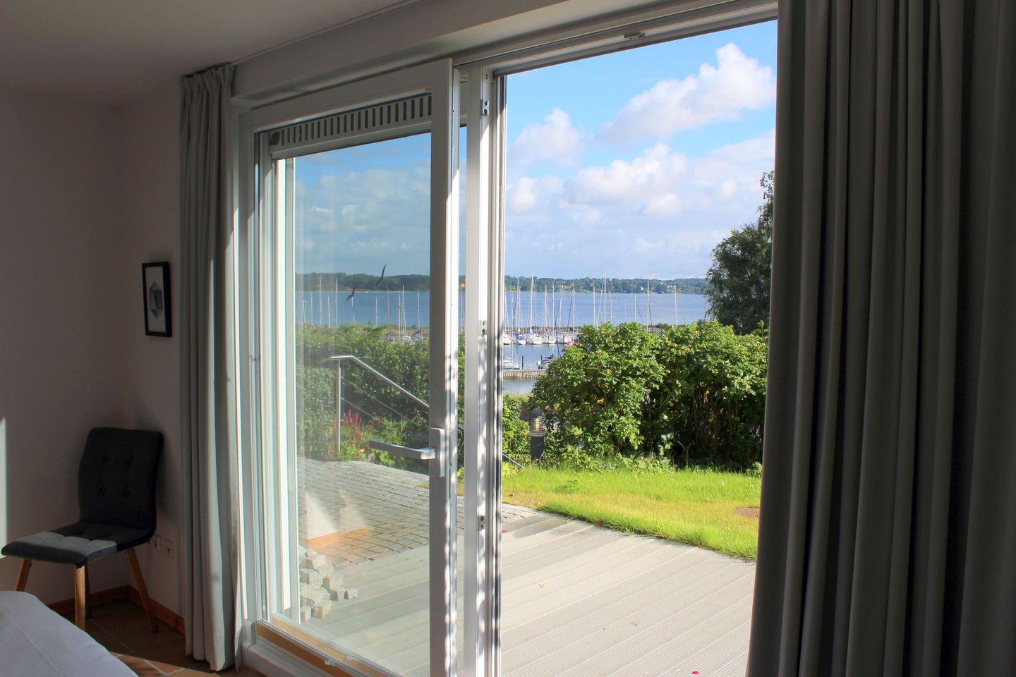 Vom Wohnzimmer mit offener Küche aus kannst Du diesen fantastischen Ausblick über den Garten, den Segelhafen und das Wasser der Förde genießen.