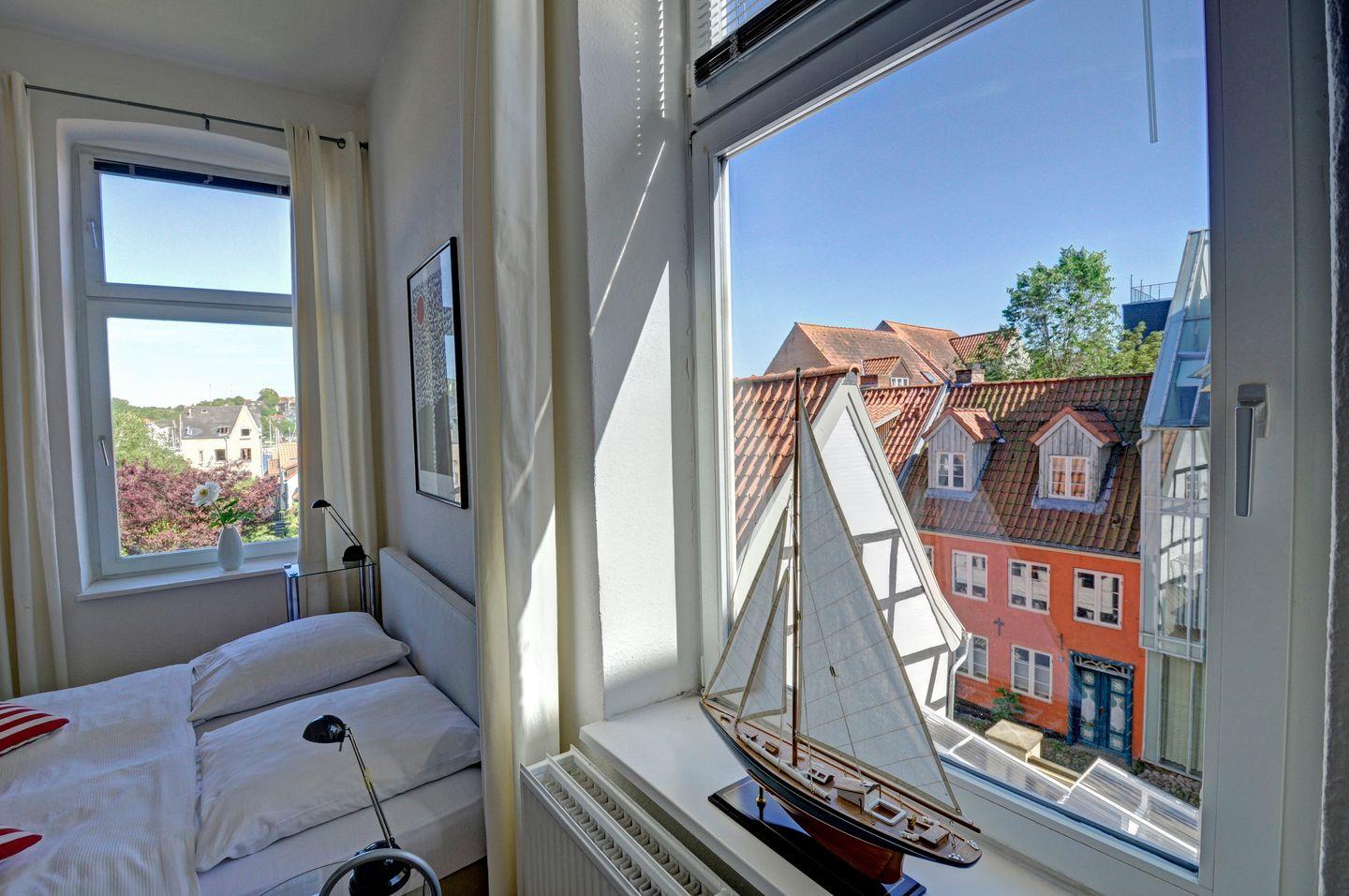 Charmante Altbauwohnung mit Blick auf die Norderstraße in Flensburg, WLAN, TV und elegantem Ambiente.