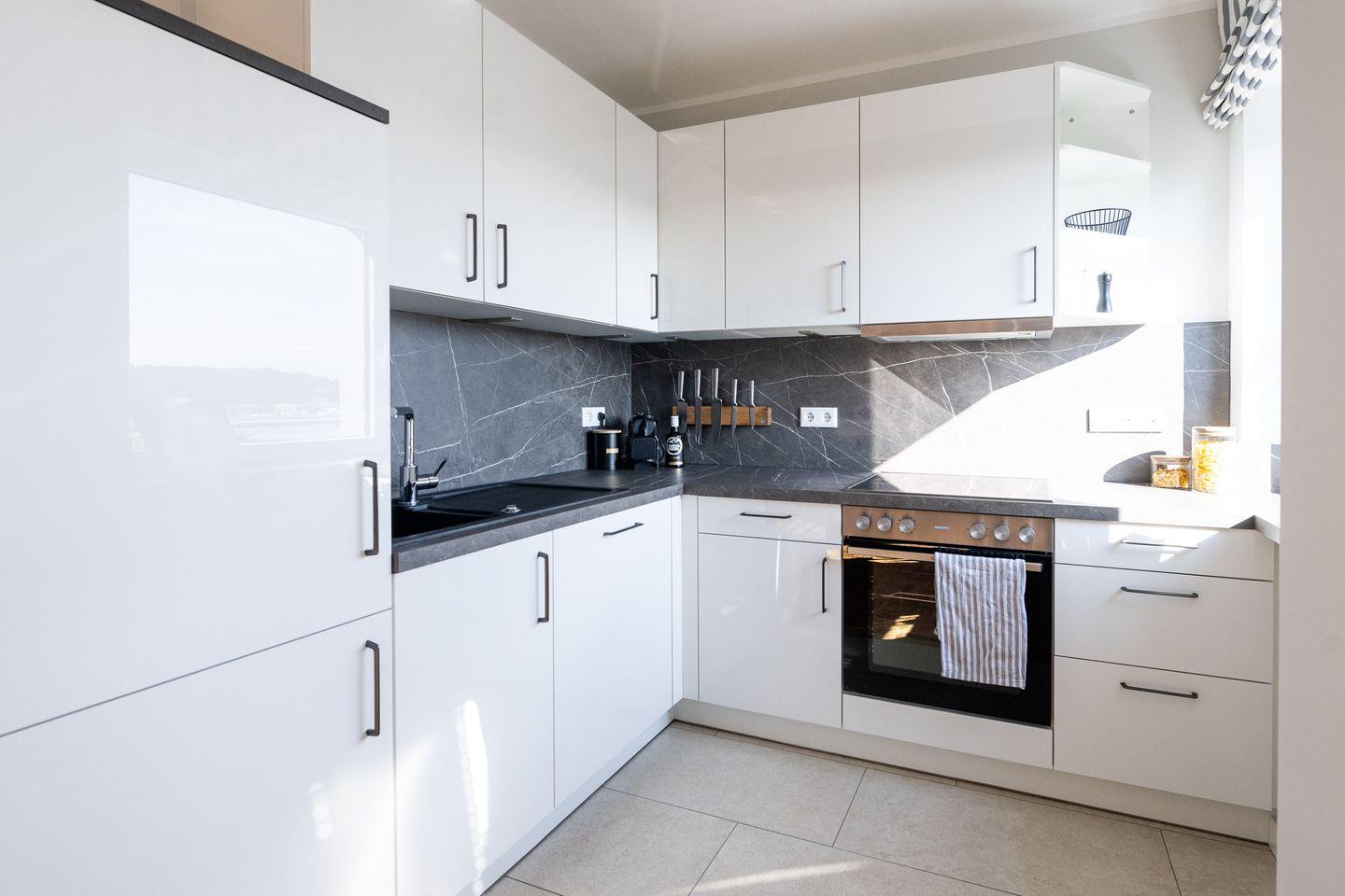 Die modern ausgestattete Küche lädt zum Kochen ein und bietet Ihnen dabei einen wunderschönen Ausblick auf den Flensburger Hafen, der das Kocherlebnis zu etwas Besonderem macht. Das offene Konzept der Wohnung verbindet Wohnzimmer, Esszimmer und Küche zu einem großzügigen und einladenden Raum.