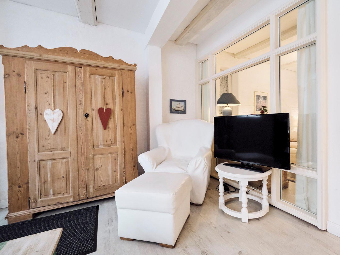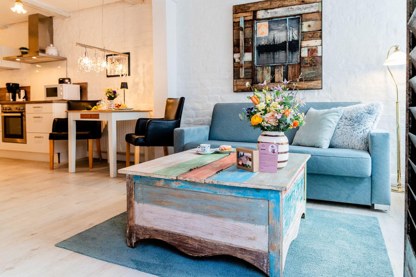 Über die Norderstraße gelangt ihr über eine niedrige Stufe in eure weitestgehend barrierefreundliche Ferienwohnung – ein liebevoll eingerichtetes Apartment in einem denkmalgeschützten Fachwerkhaus aus dem 16. Jahrhundert.