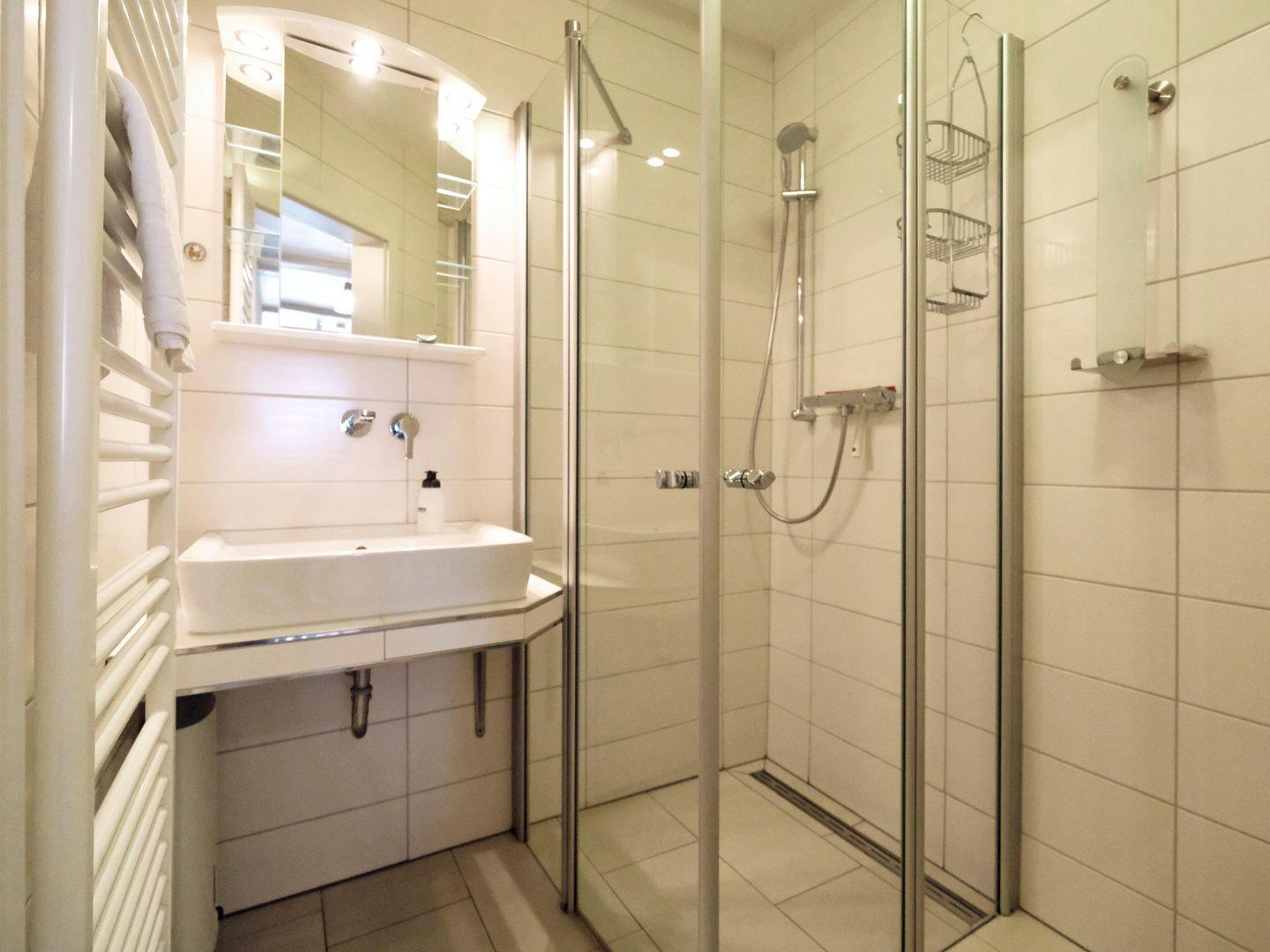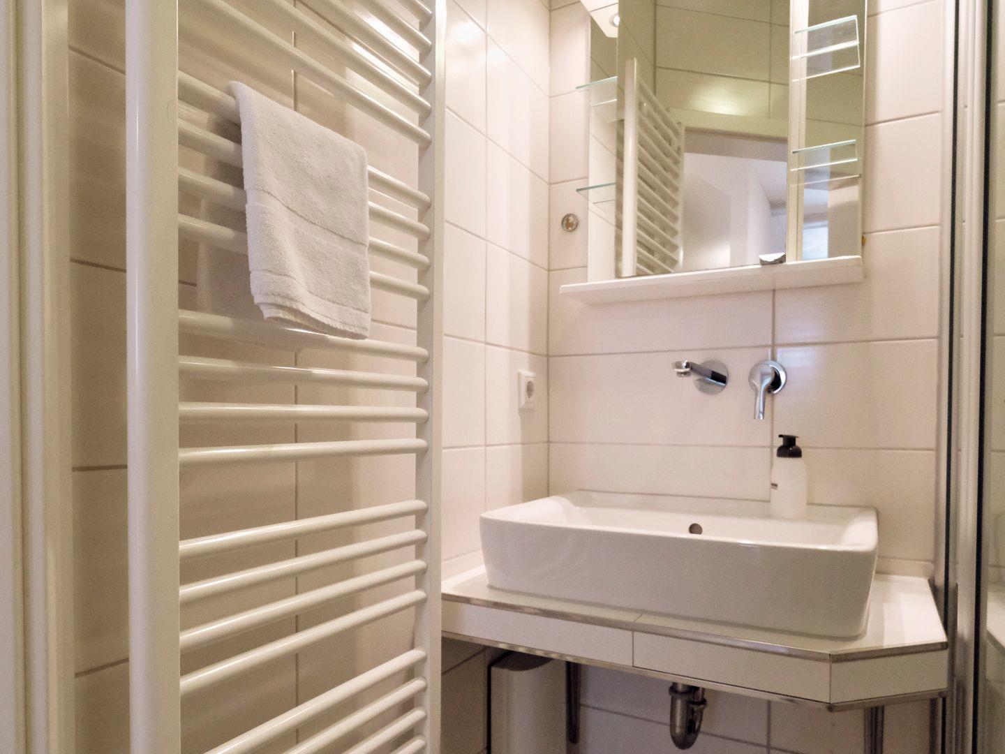 Das stilvoll erneuerte Badezimmer bietet eine ebenerdige Dusche, ein WC und einen beheizten Handtuchhalter für extra Komfort.