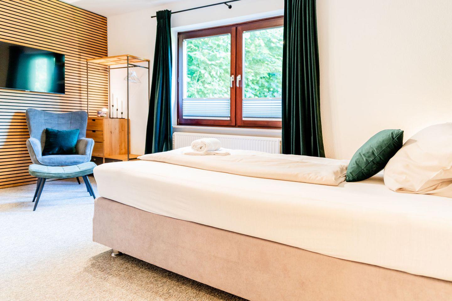 Ein Flachbild-TV und ein separates Badezimmer mit Dusche, sowie verdunkelte Gardinen.