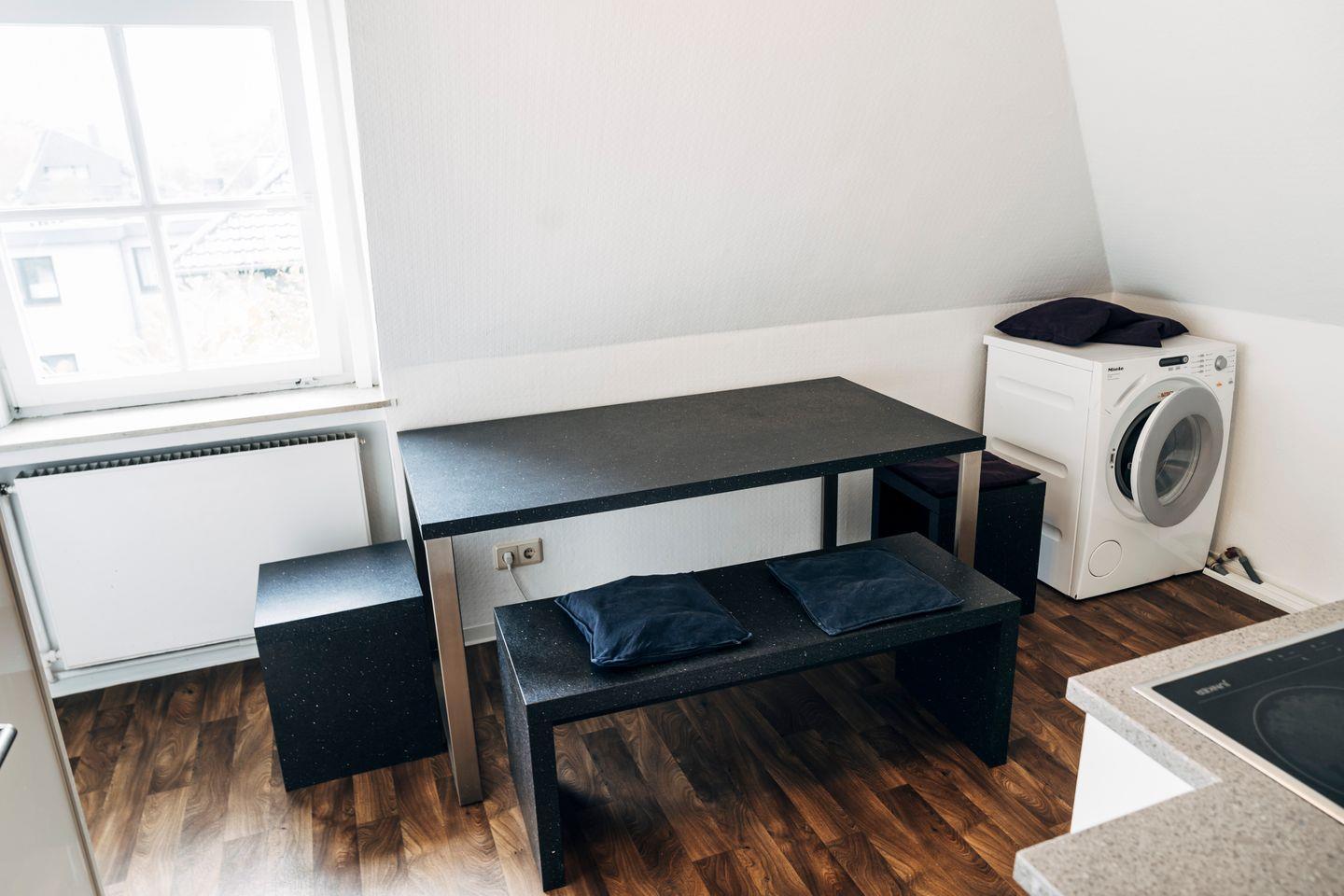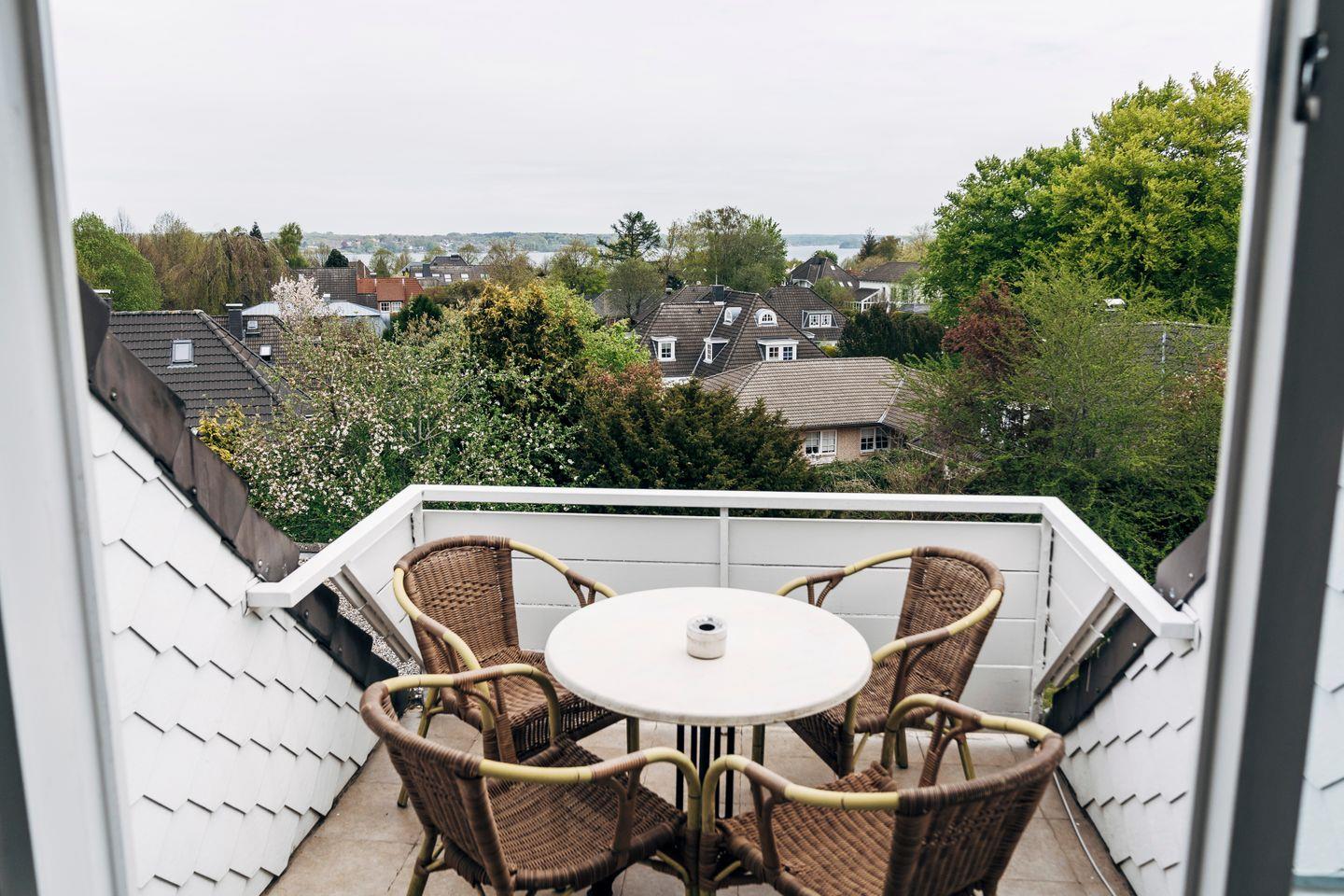 Ein kleiner Balkon mit direkten Blick auf die Förde, ist mit einem runden Tisch und 4 Stühlen ausgestattet. Es bietet sich gerade in den Sommermonaten, ideal für einen entspannten Drink oder zum Abendessen im Freien an.