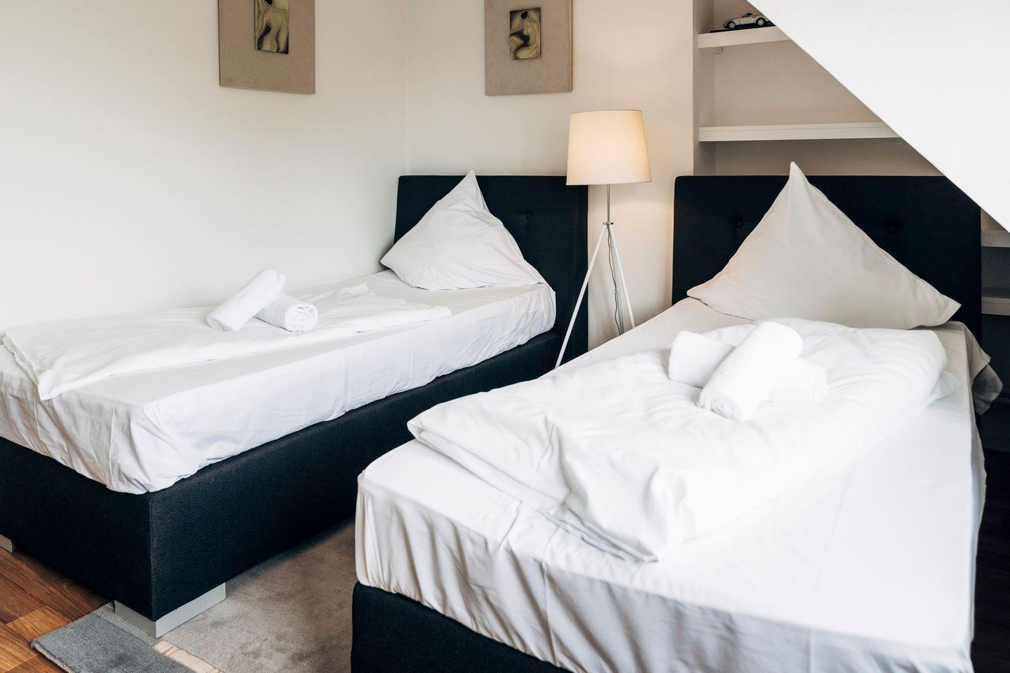 Die Wohnung bietet Platz für regulär 4 Personen in zwei getrennten Schlafzimmern, davon ein Schlafzimmer mit Doppelbett. Das andere Schlafzimmer mit 2 Einzelbetten, die auch zusammen geschoben werden können. (Im ausgebauten Dachboden befinden sich 2 Zustellbetten, die bei Bedarf zur Verfügung stehen)