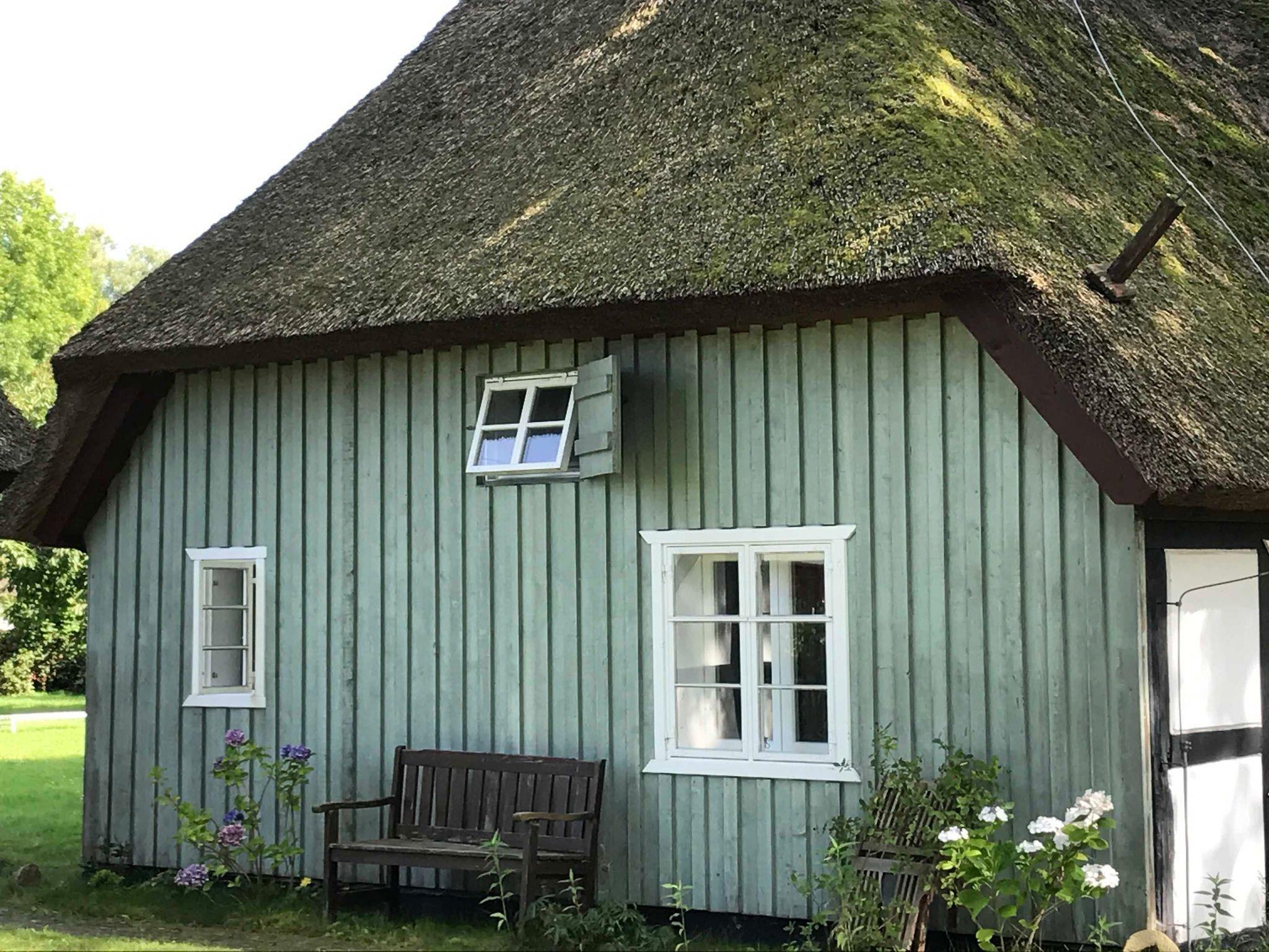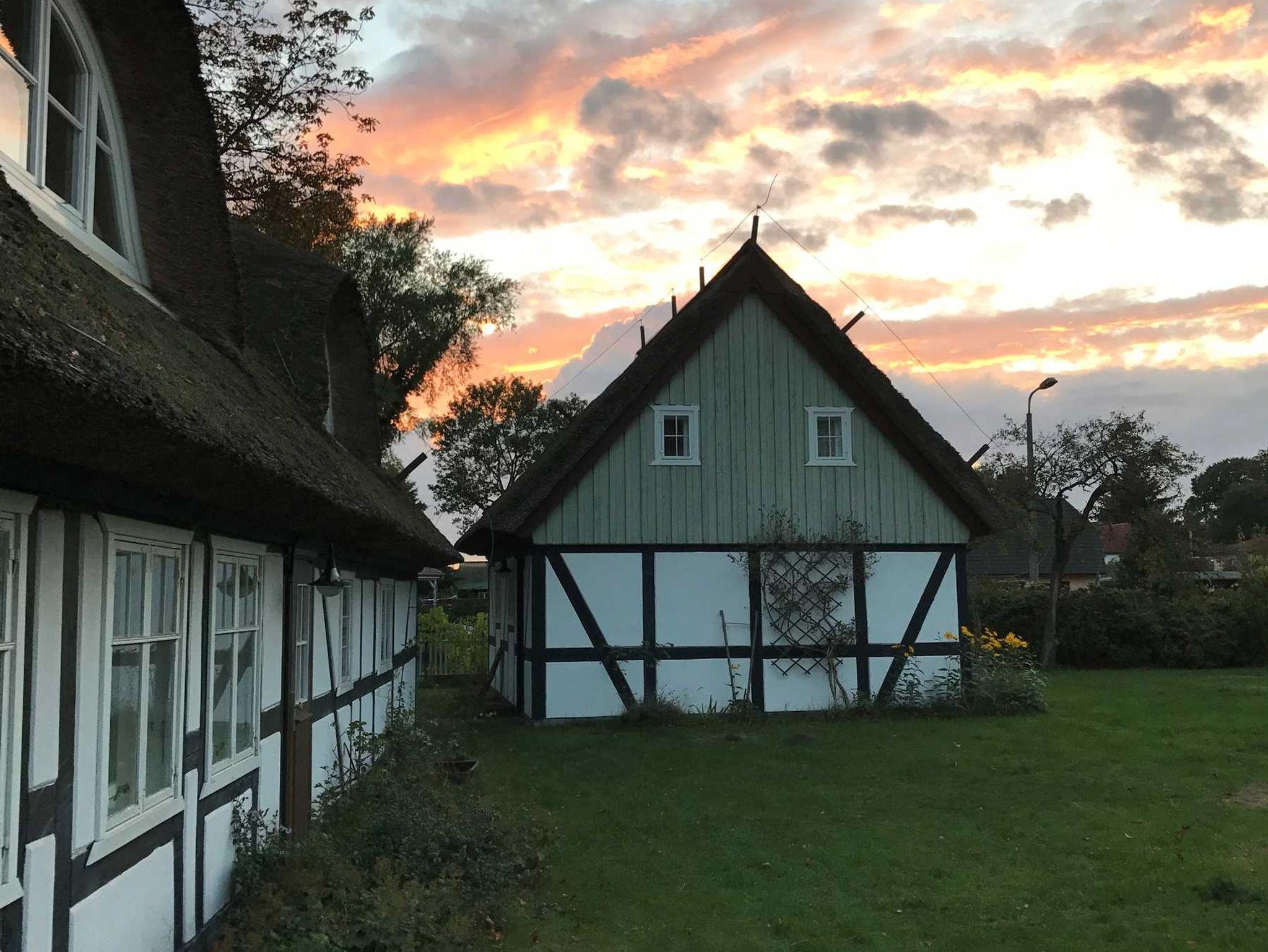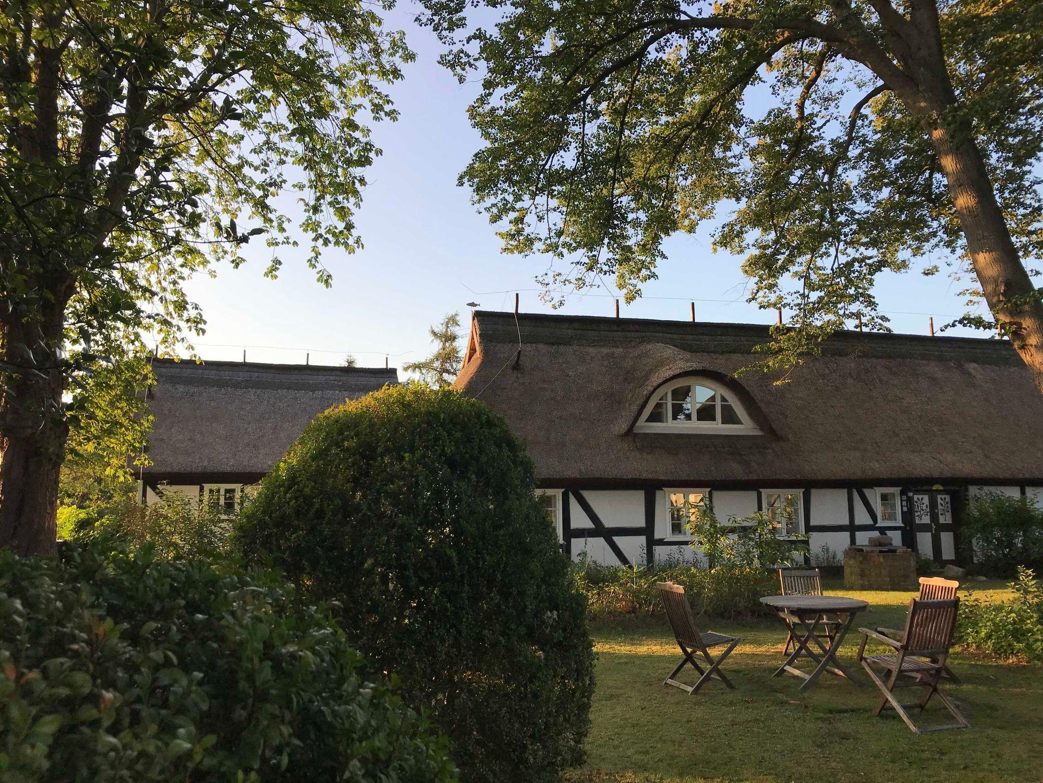 Historisches Reetdachhaus mit gemütlicher Ferienwohnung in Bodstedt, umgeben von großem Garten und naturnaher Umgebung.