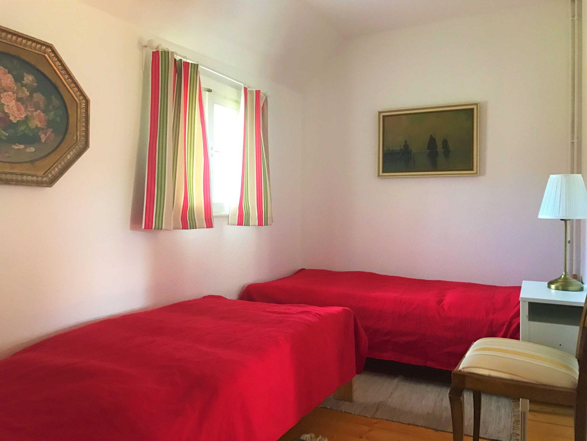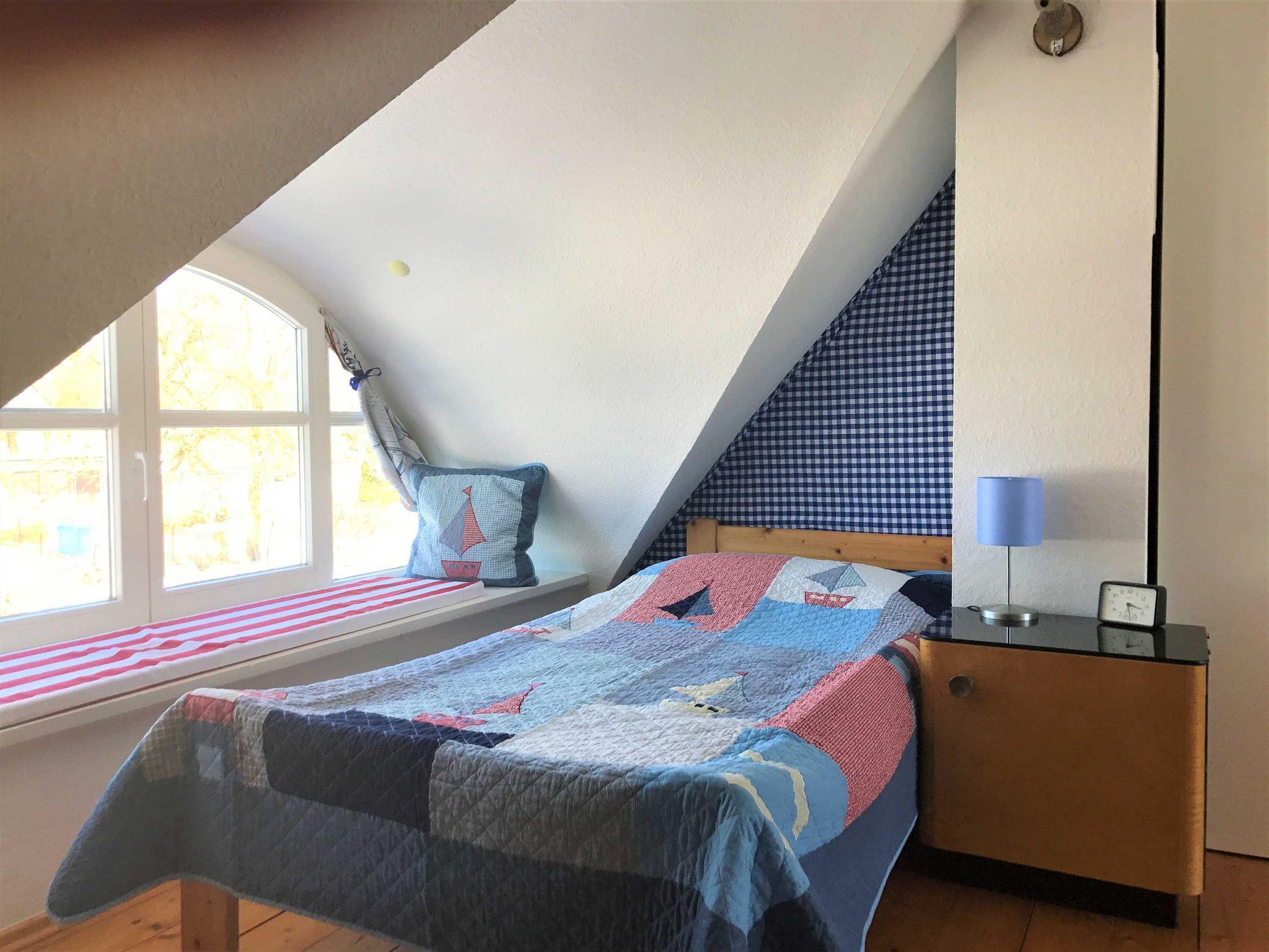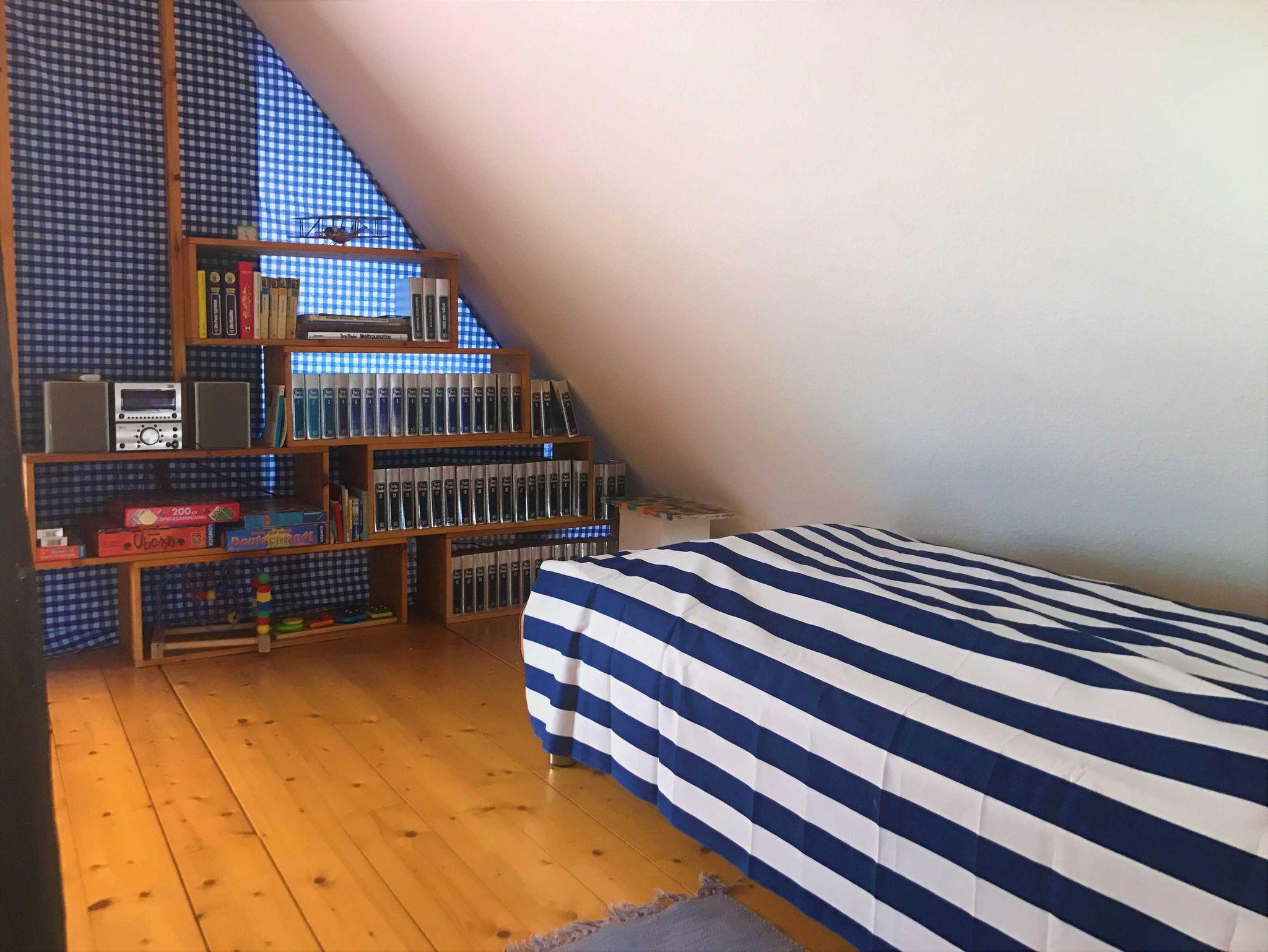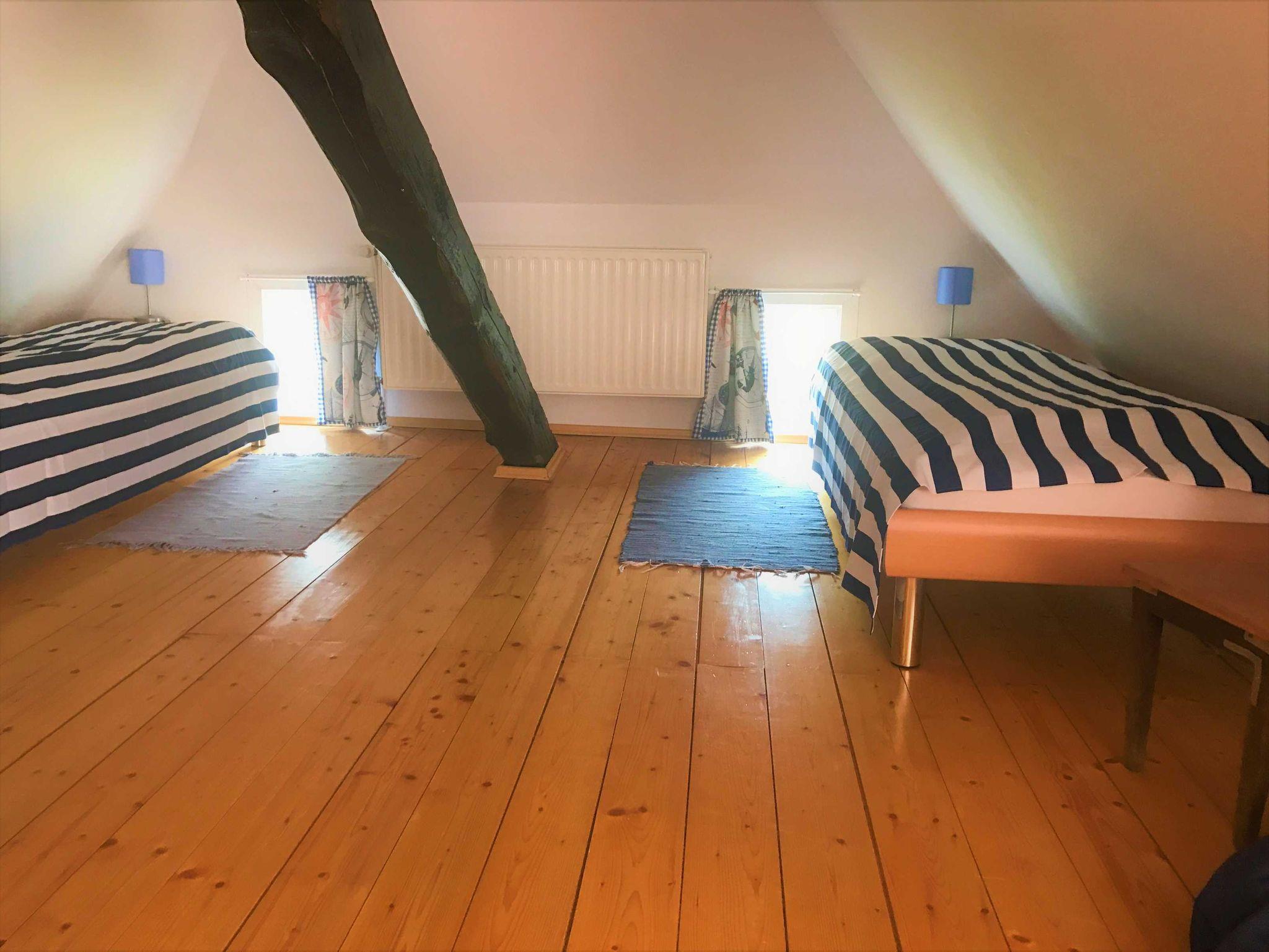 107 qm große Ferienwohnung über zwei Etagen für 7 Personen. Wohnzimmer mit Couch und Doppelbett, 1 Schlafzimmer mit 2 Einzelbetten im EG, 1 SZ mit 3 Einzelbetten im OG. Bad mit Dusche und Badewanne.