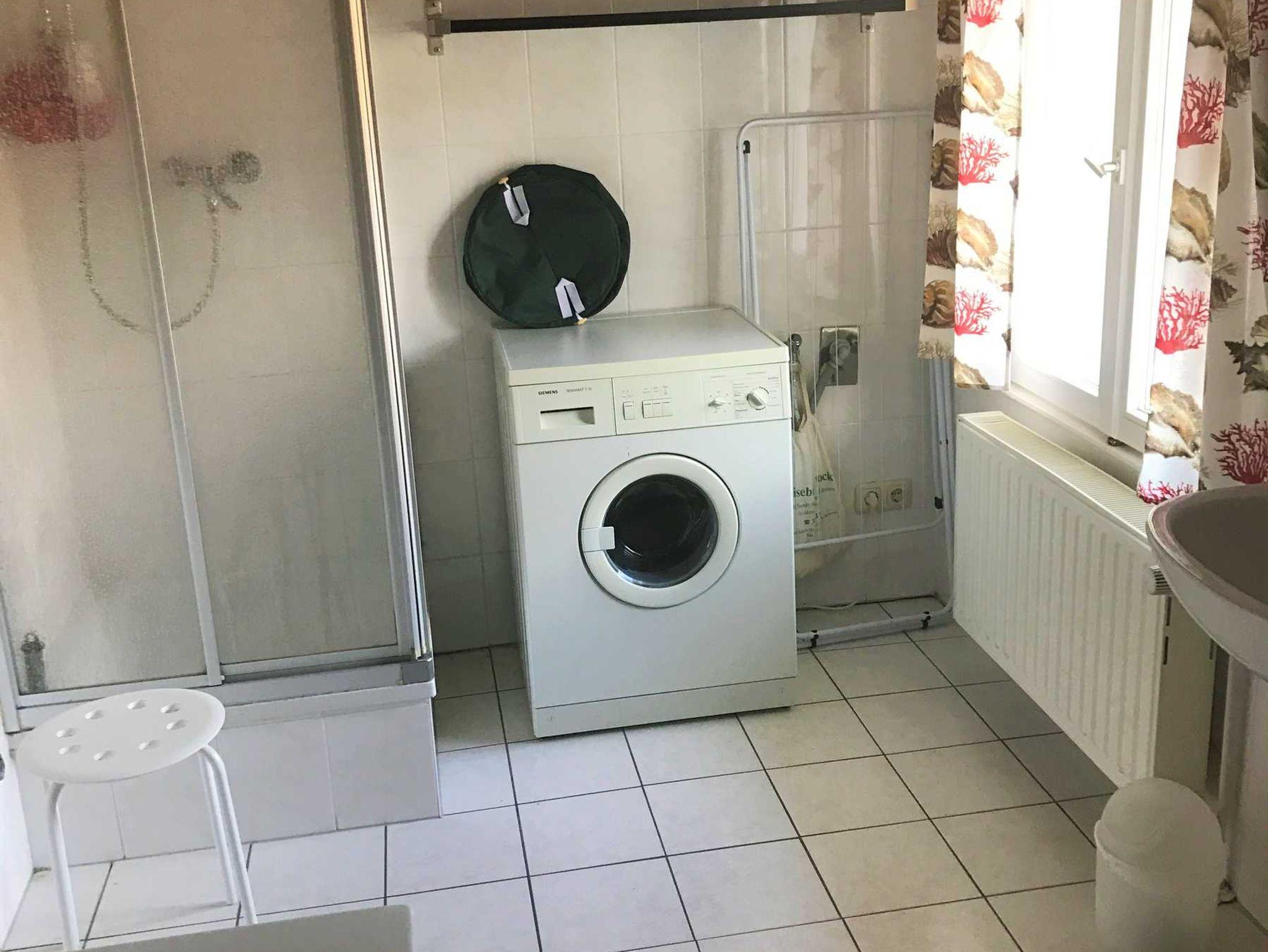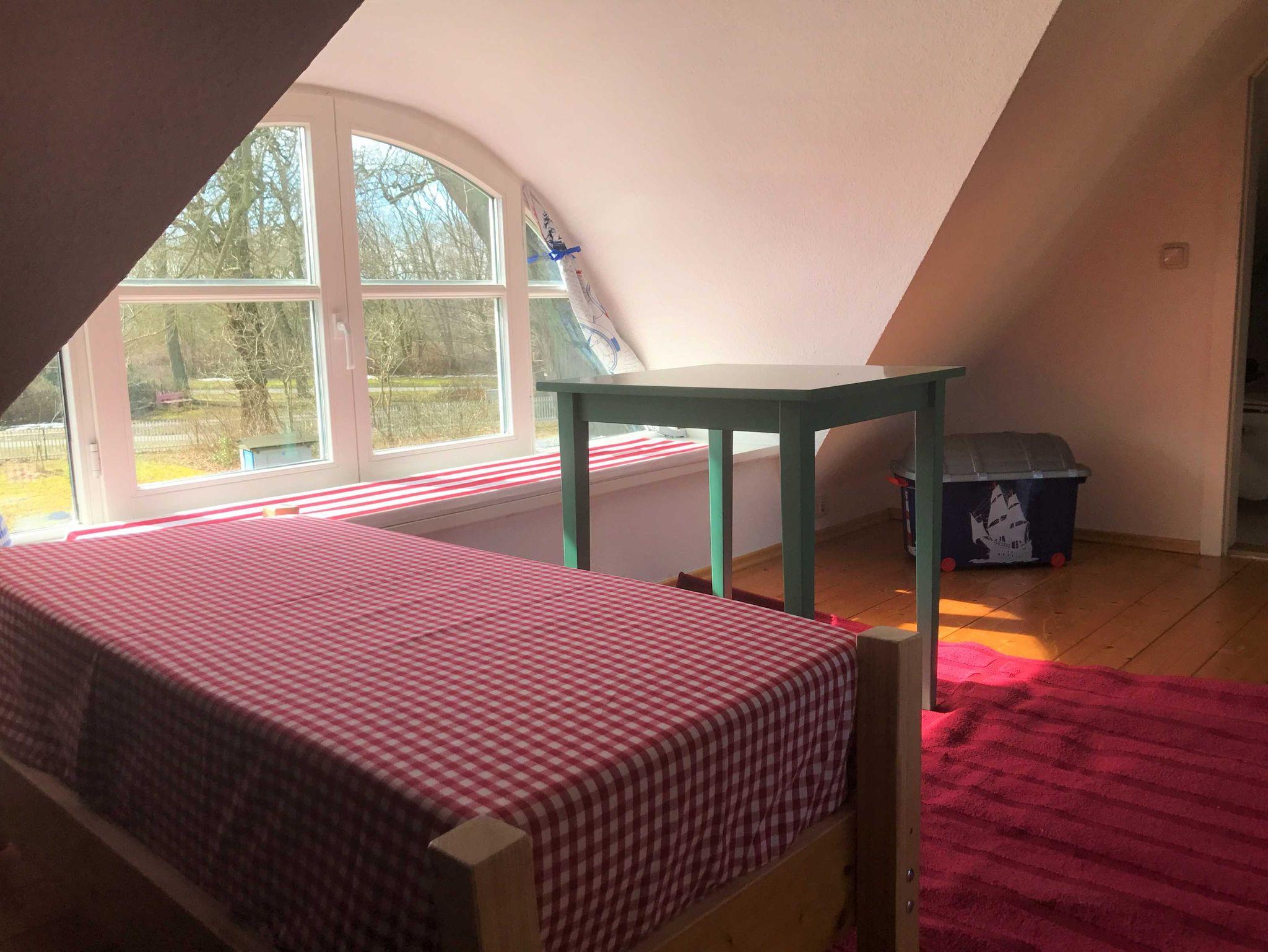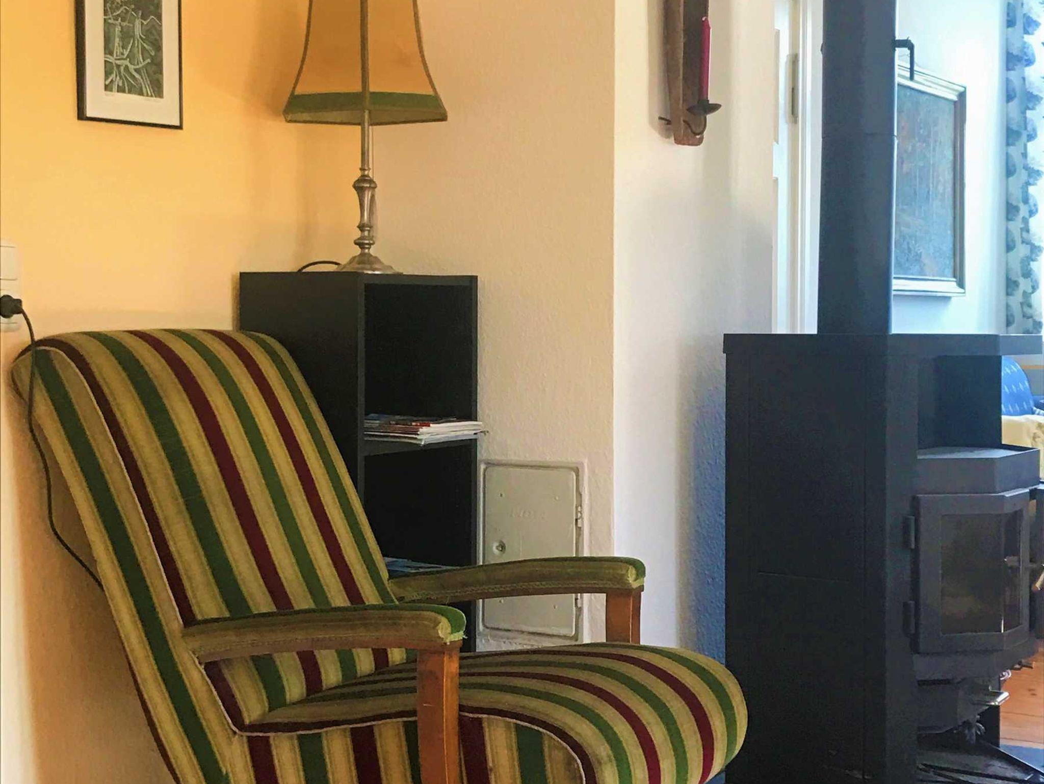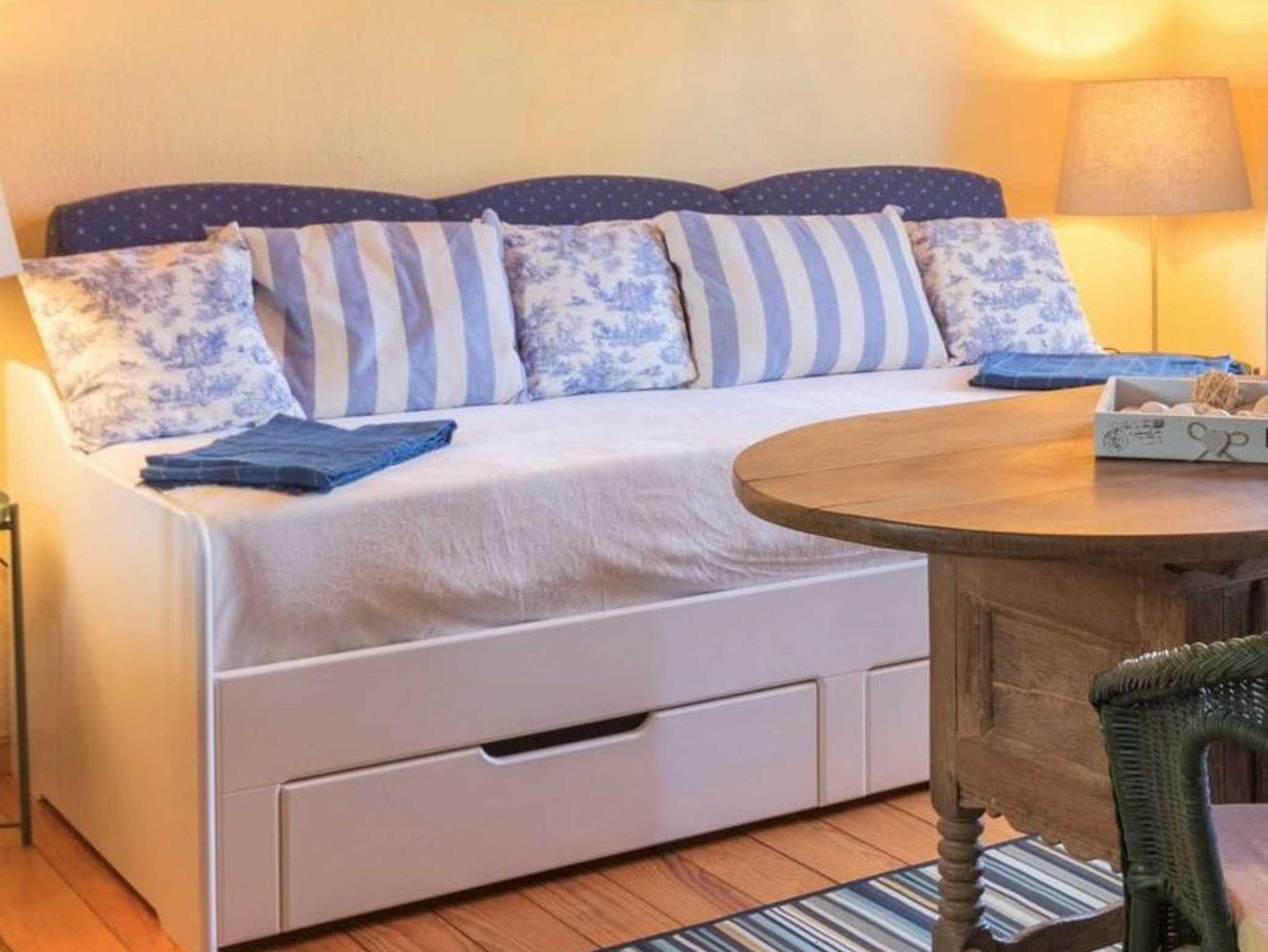 107 qm große Ferienwohnung über zwei Etagen für 7 Personen. Wohnzimmer mit Couch und Doppelbett, 1 Schlafzimmer mit 2 Einzelbetten im EG, 1 SZ mit 3 Einzelbetten im OG. Bad mit Dusche und Badewanne.