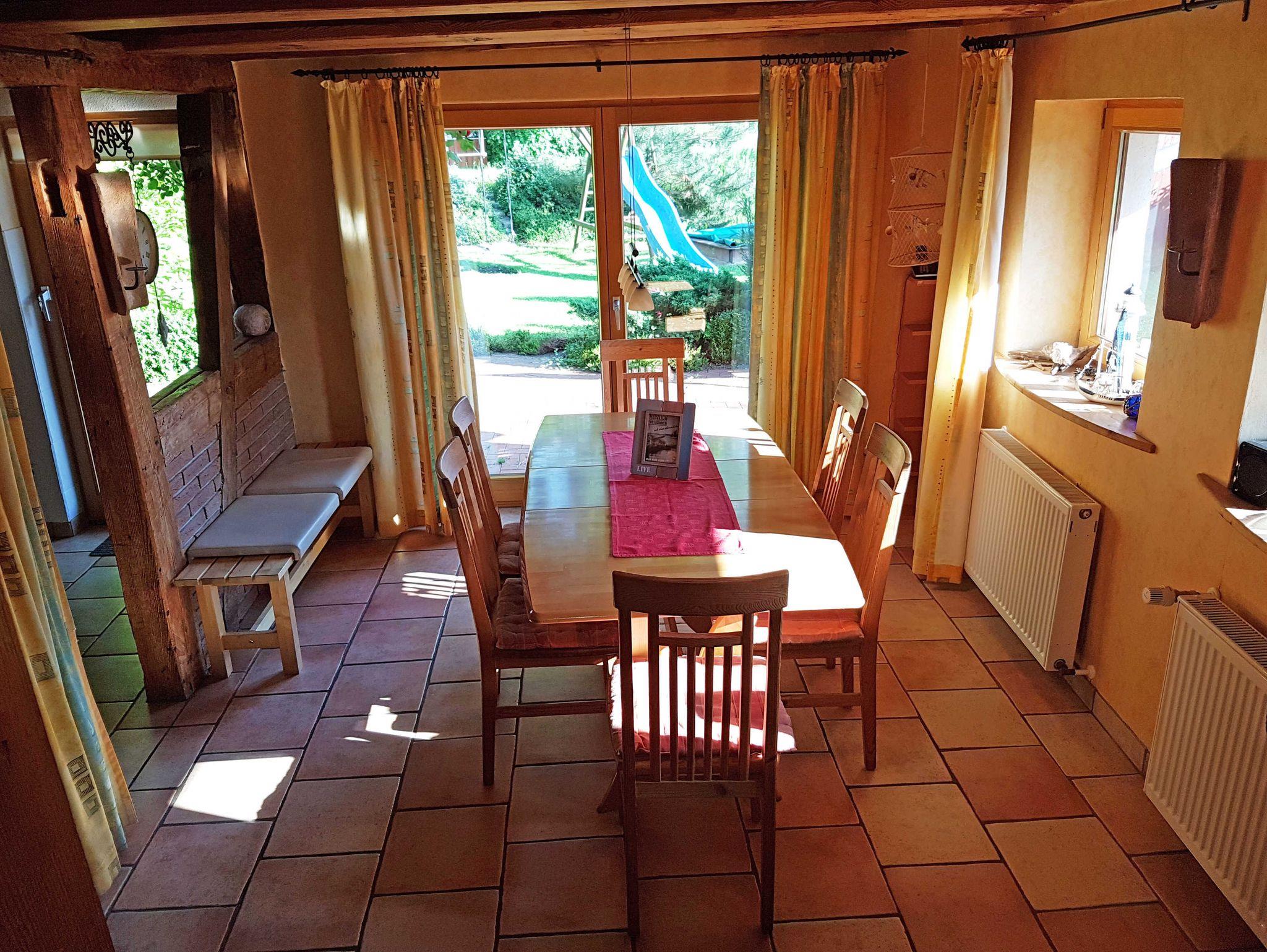 Ein Esszimmer mit großem Tisch für bis zu 10 Personen und Kaminofen.