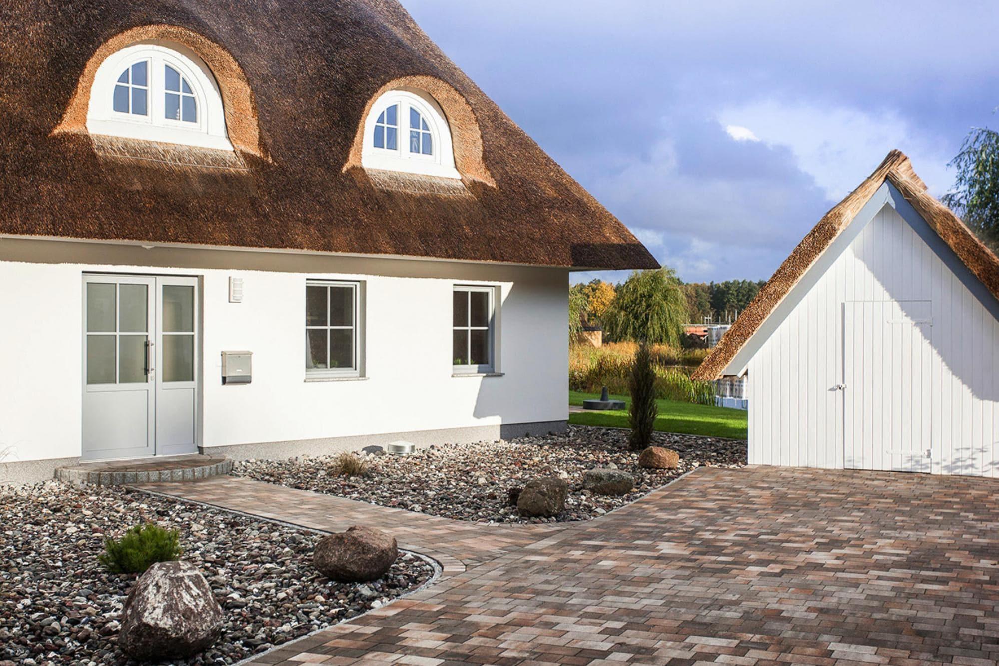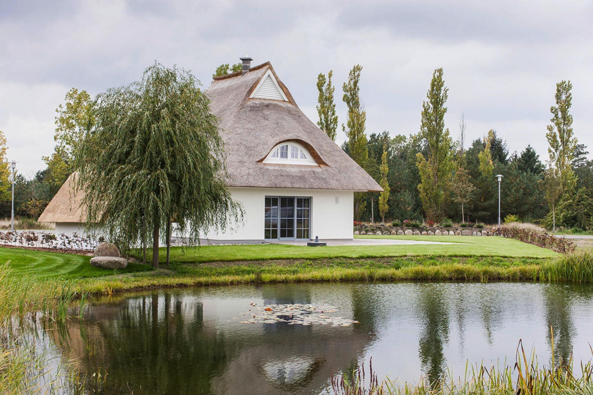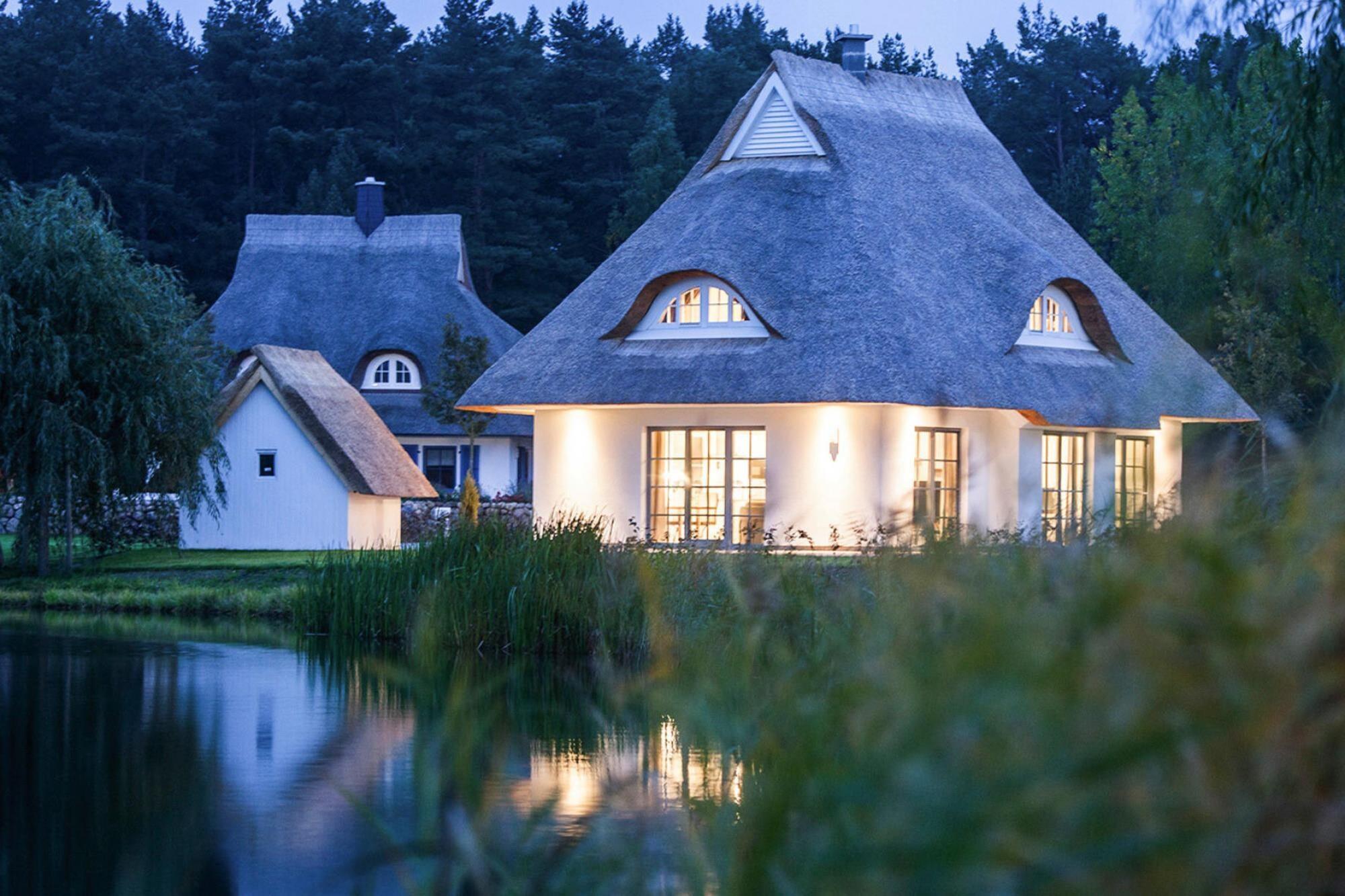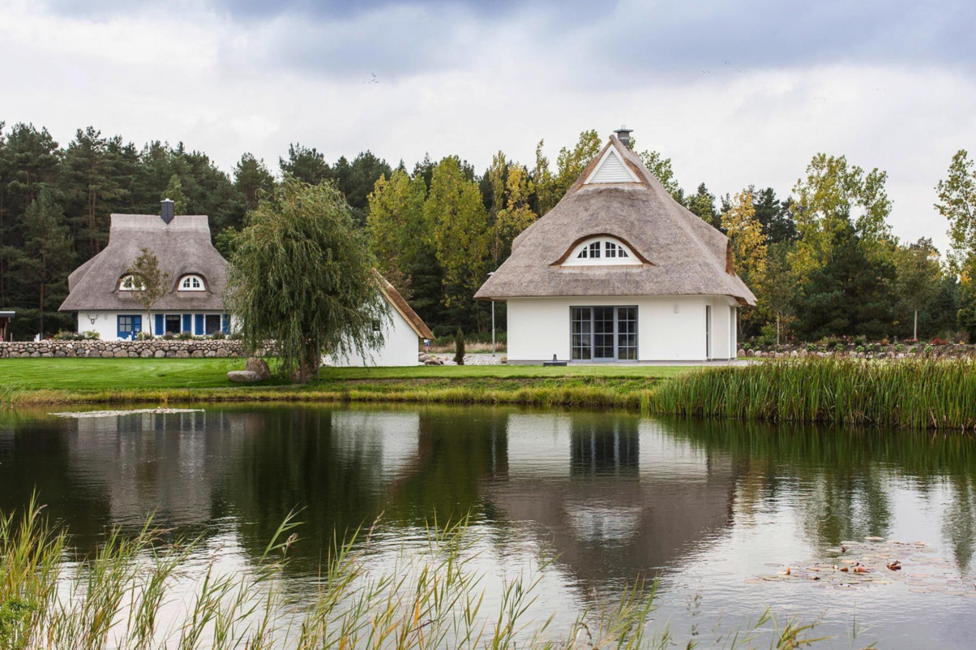 Luxuriöses Reetdachhaus mit Sauna, nur 100 m vom Bodden entfernt, ideal für erholsame Ferien in idyllischer Natur.