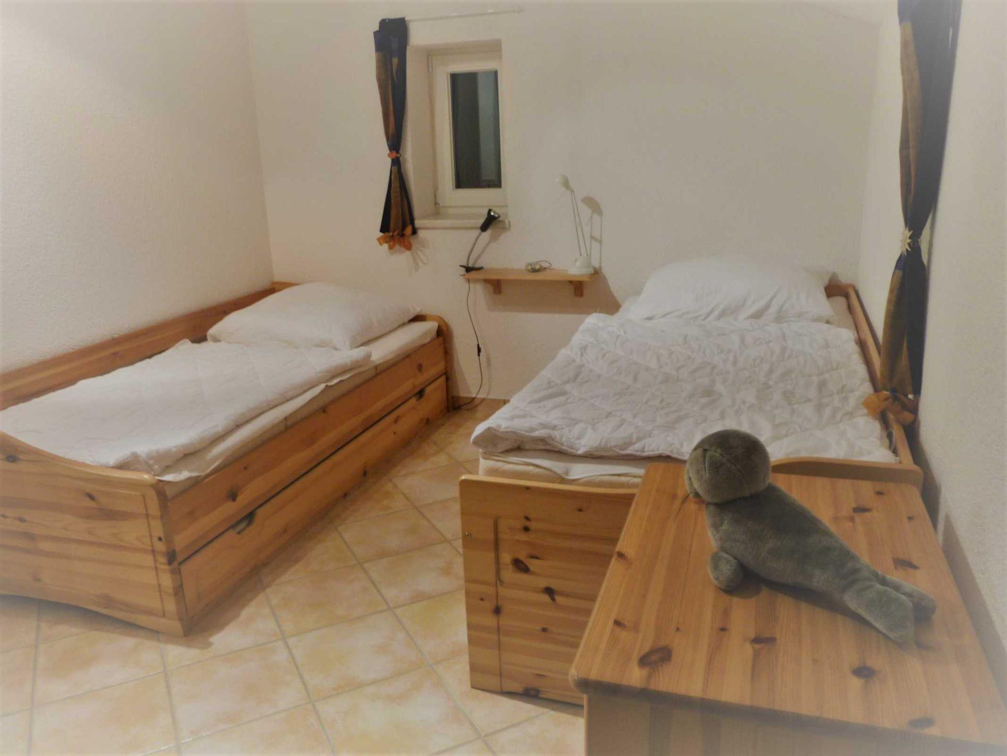 Diese helle Ferienwohnung in der ersten Etage bietet mit zwei separaten Schlafzimmern reichlich Platz für Familien oder kleine Gruppen. Während das erste Zimmer mit einem klassischen Doppelbett ausgestattet ist, verfügt das zweite Schlafzimmer über ein Einzelbett und ein praktisches, ausziehbares Tandembett. In der voll ausgestatteten Küche finden Sie alles Notwendige für eine entspannte Selbstversorgung während Ihres Aufenthalts.
