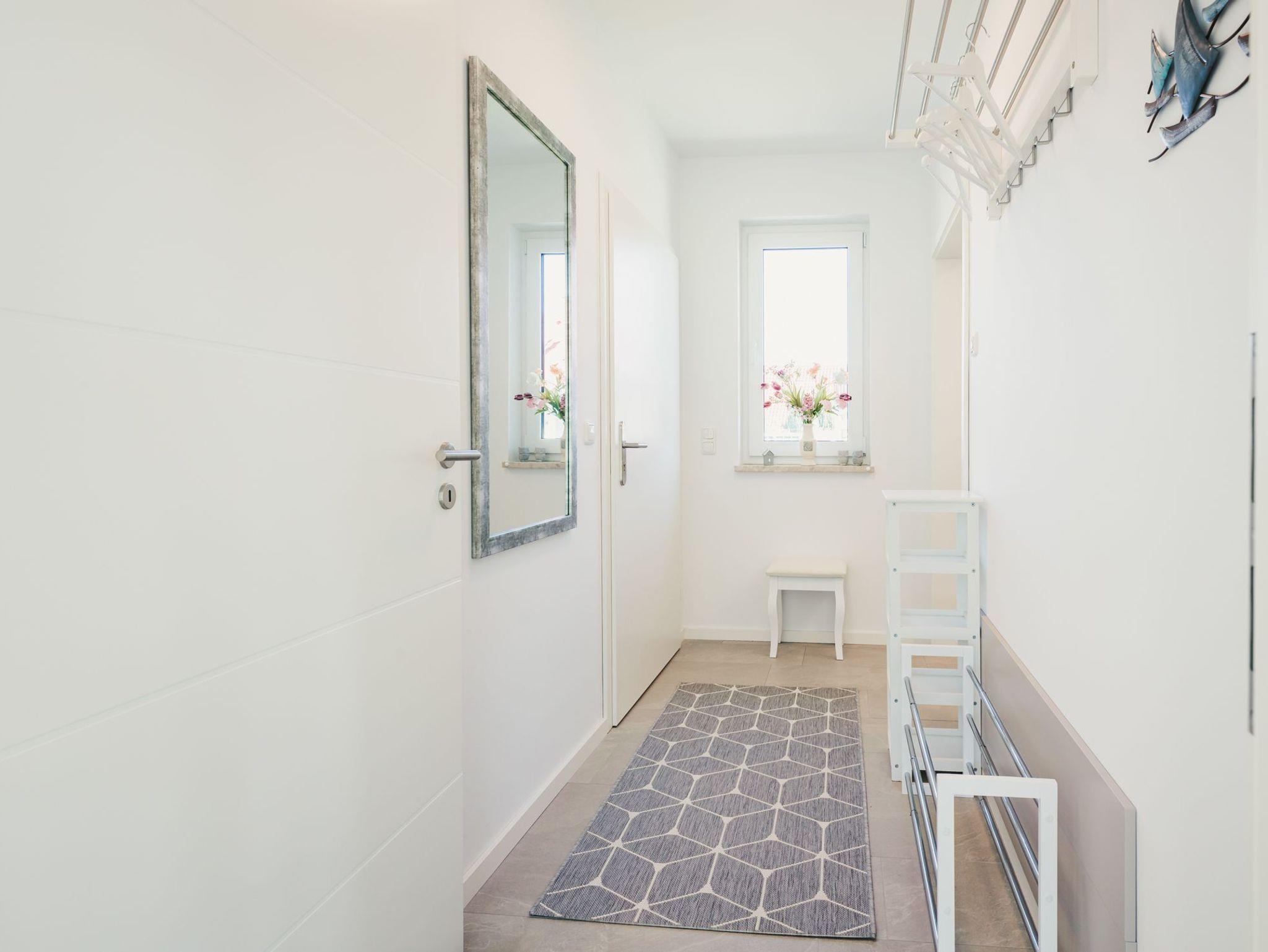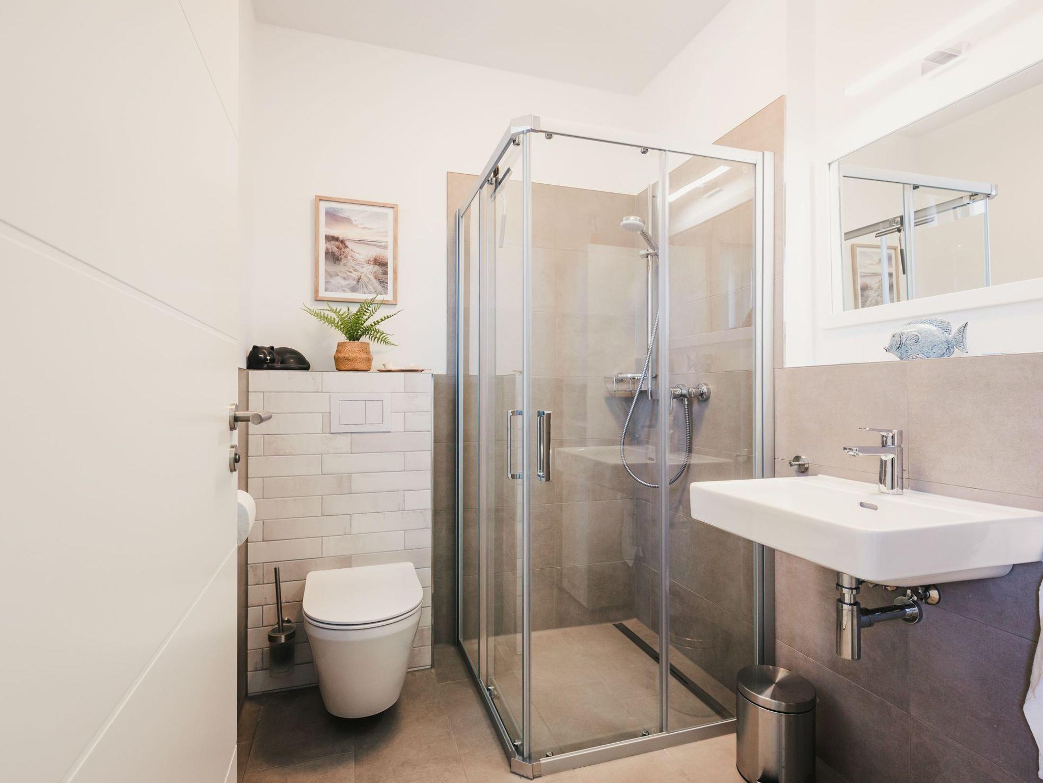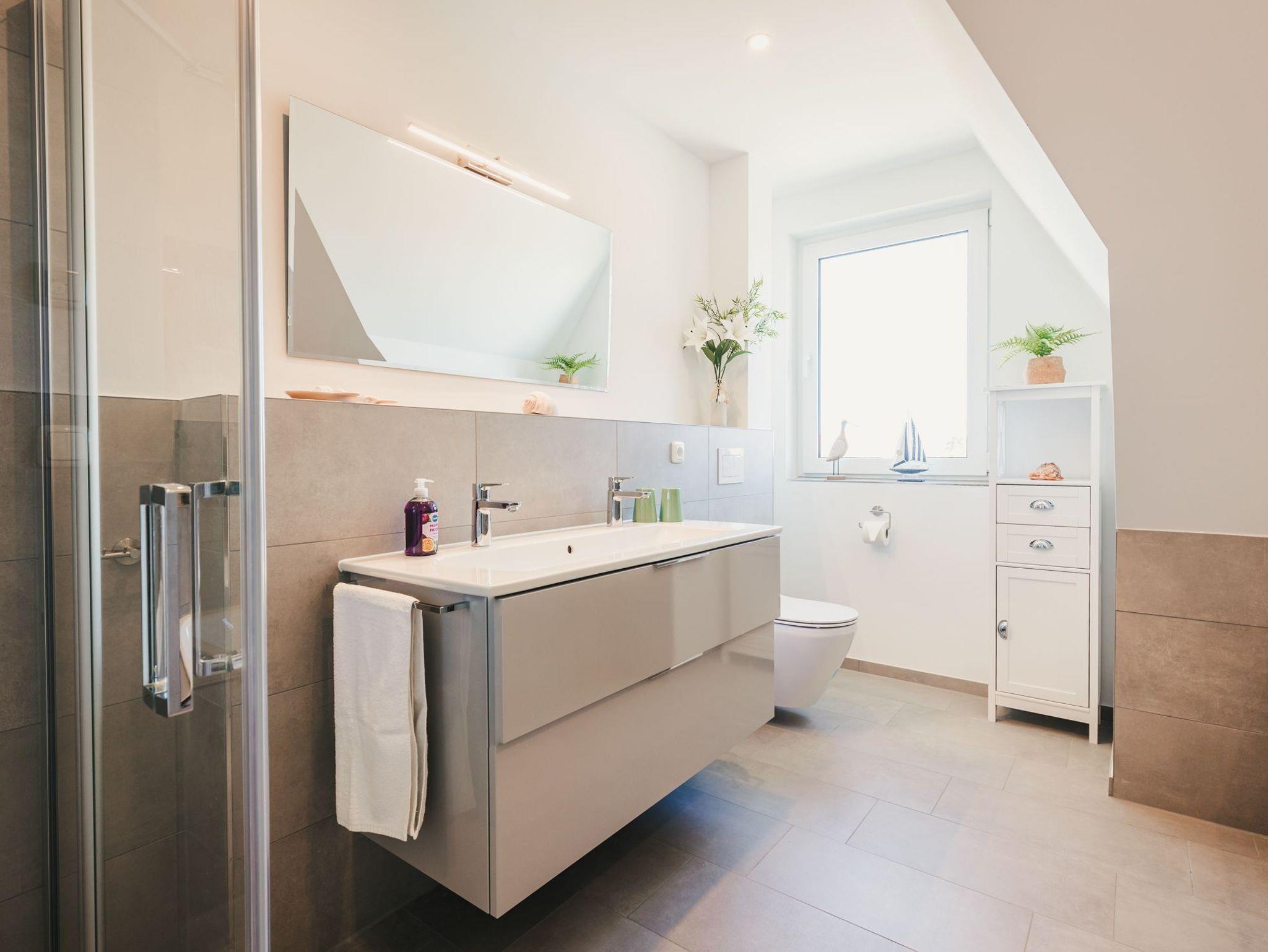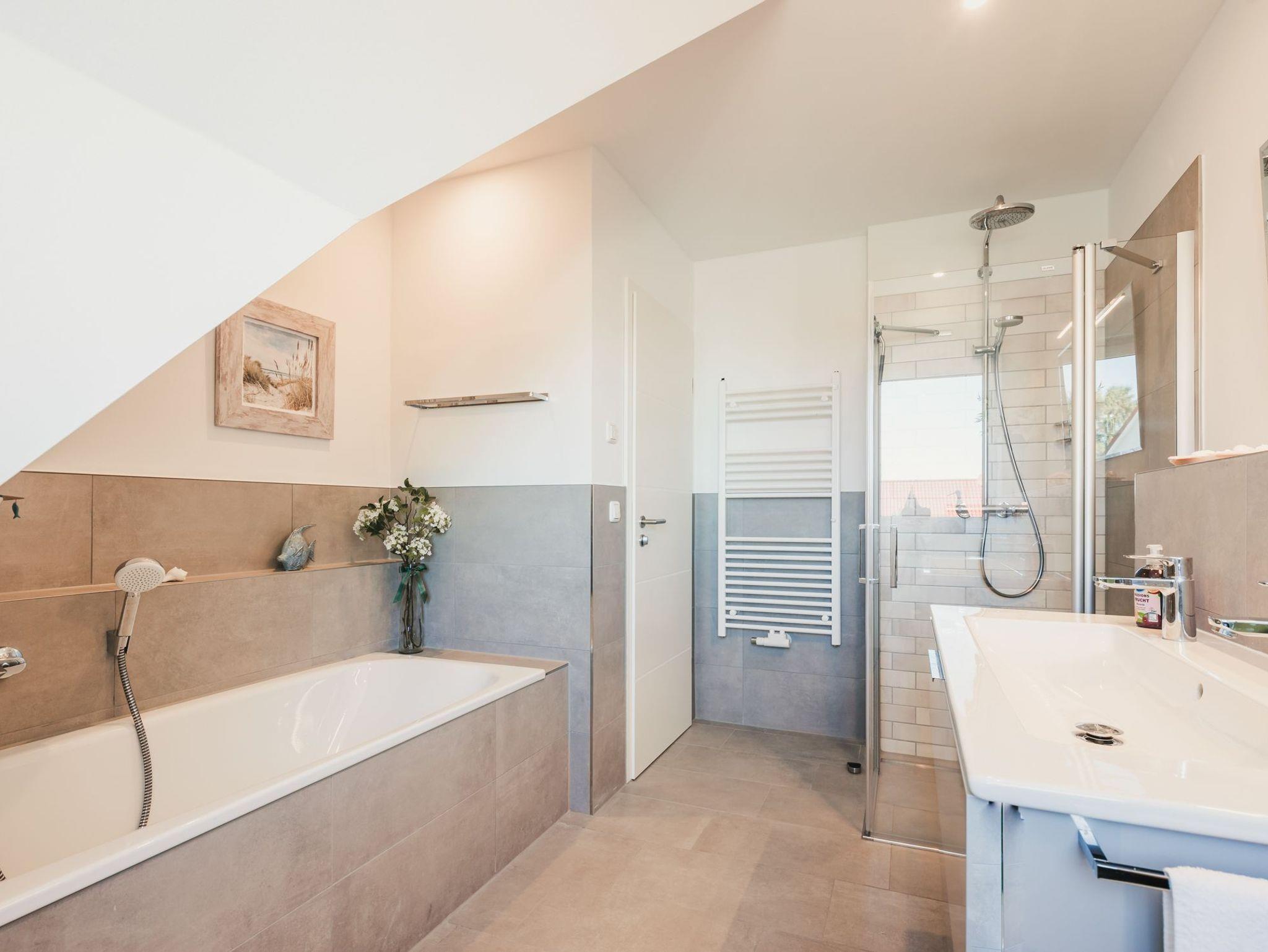 Ebenfalls im Obergeschoss finden Sie das moderne Hauptbad mit komfortablen Doppelwaschtisch, bodengleicher Dusche, Shower - Pipe und Badewanne, von dem aus auch der Bodden zu sehen ist.