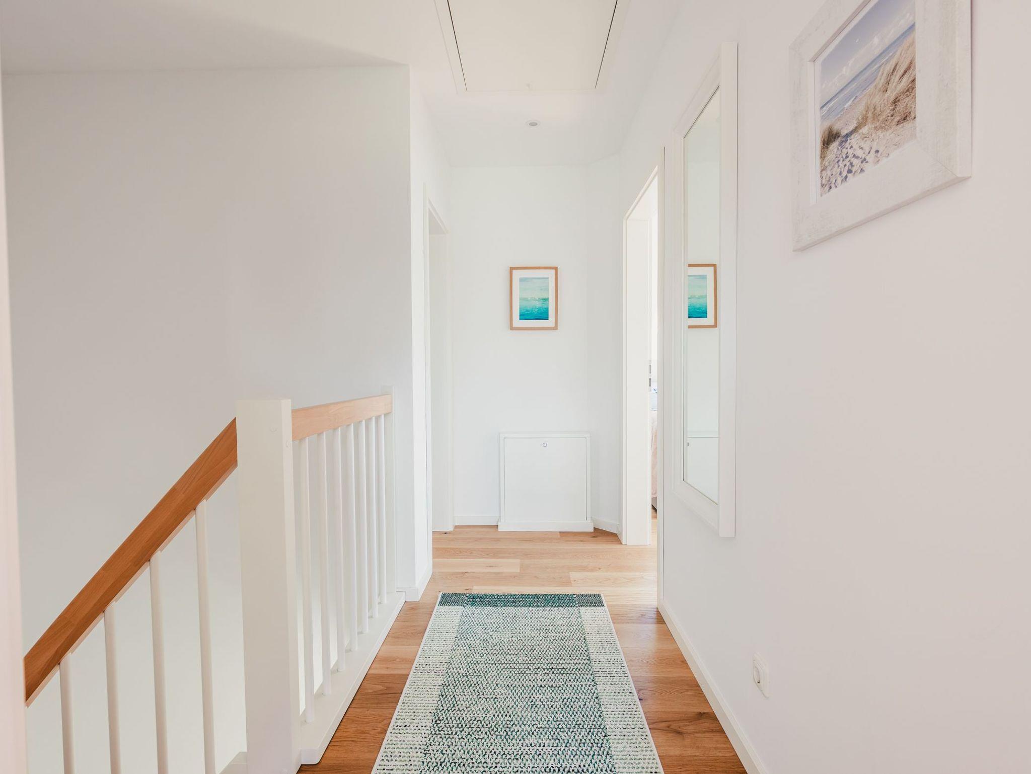 Eine moderne Holztreppe führt vom Erdgeschoss in das im Flur und den beiden Schlafzimmern mit stilvollen Eichenholzdielen versehene Obergeschoss.