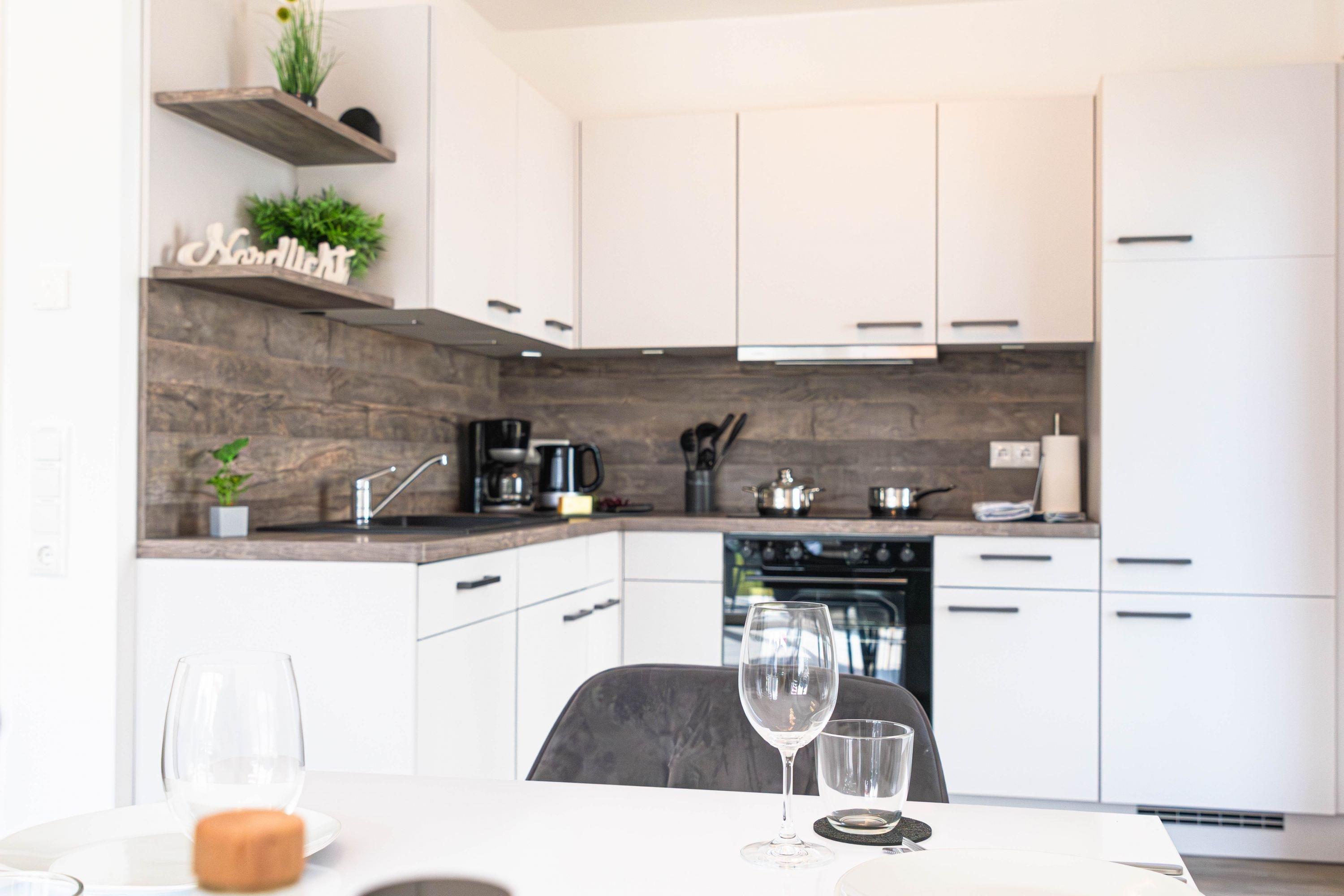 Küche: Voll ausgestattet mit Induktionsherd, Backofen, Geschirrspüler, Kühlschrank mit Gefrierfach, Dampfgarer, Toaster, Kaffeemaschine und Wasserkocher