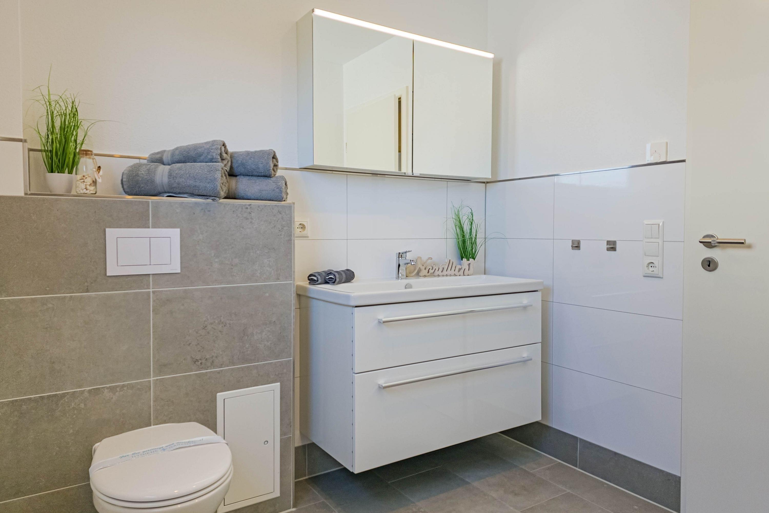 Badezimmer: Zwei moderne Duschbäder – beide mit ebenerdiger Dusche, WC und Fußbodenheizung