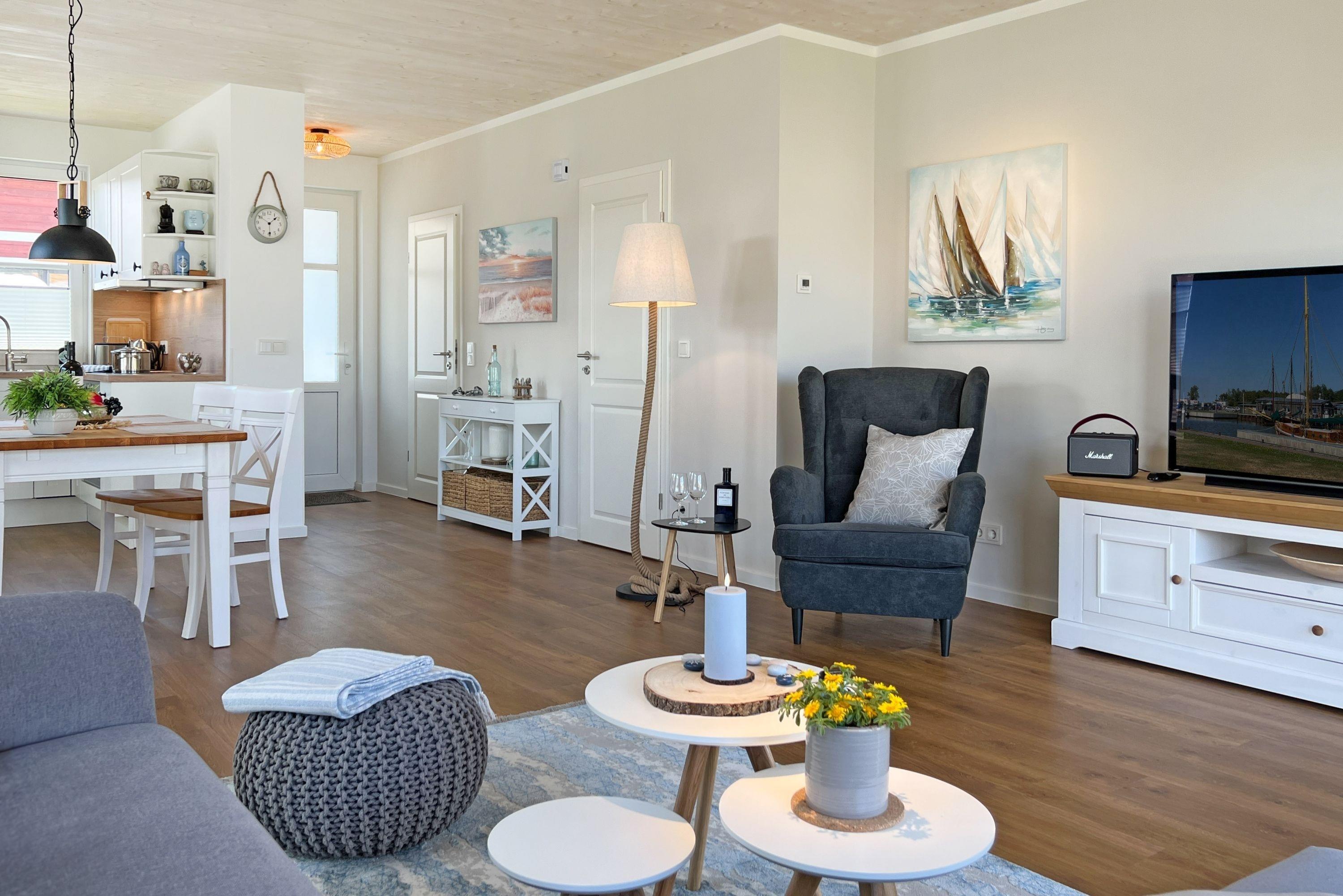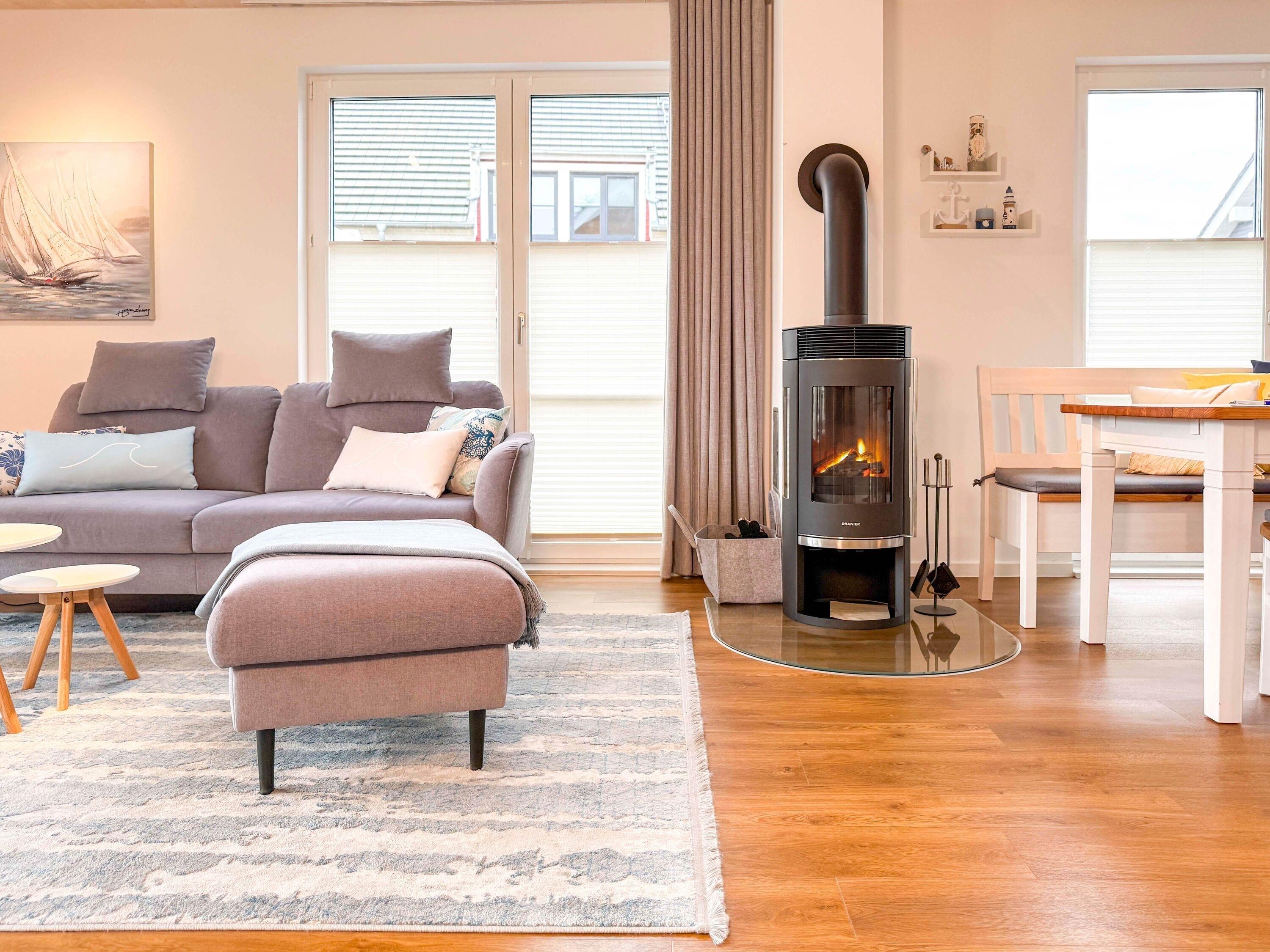 Wohnbereich: Heller, offener Raum mit gemütlicher Sitzgruppe, Kamin und Smart-TV