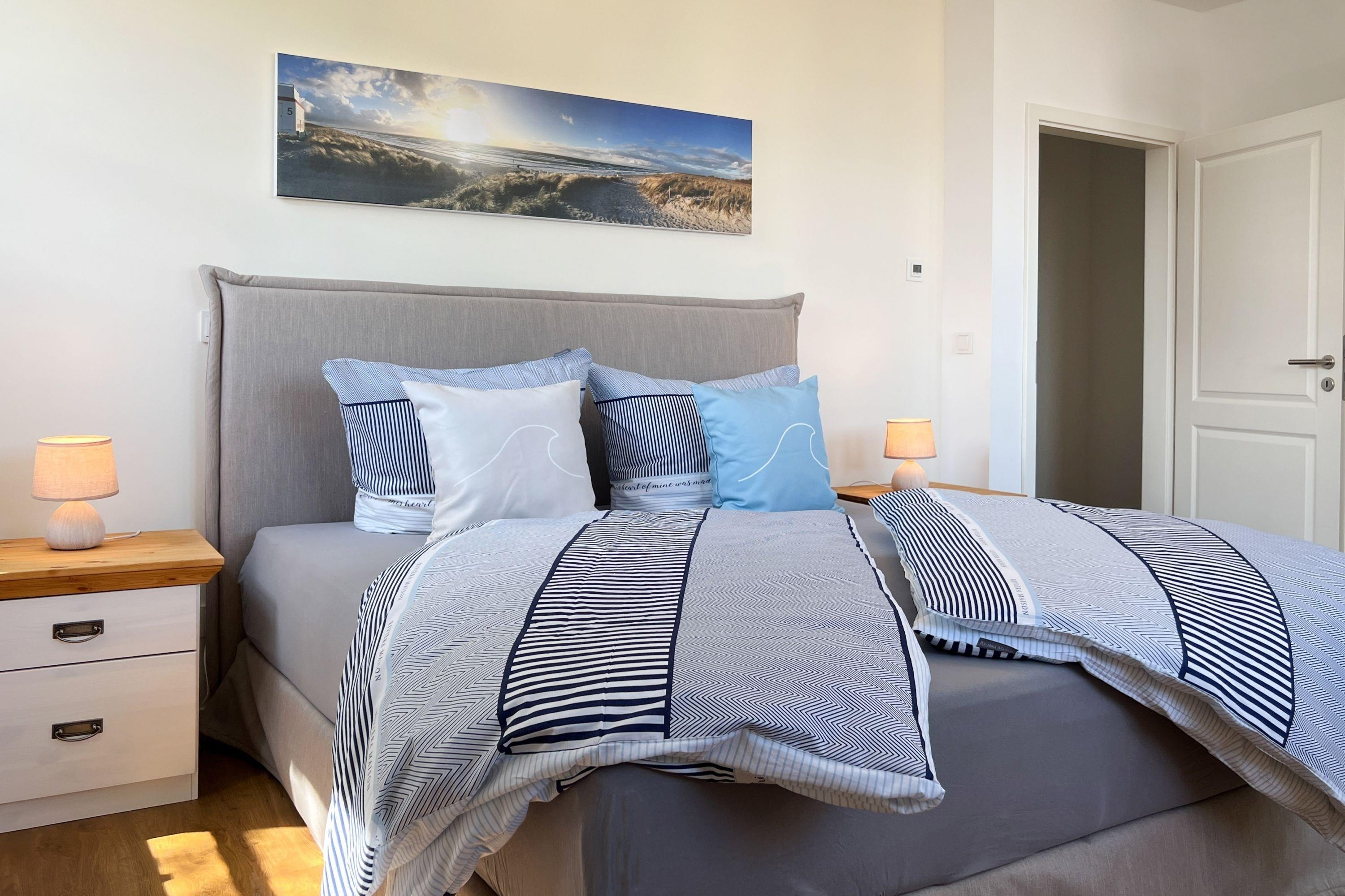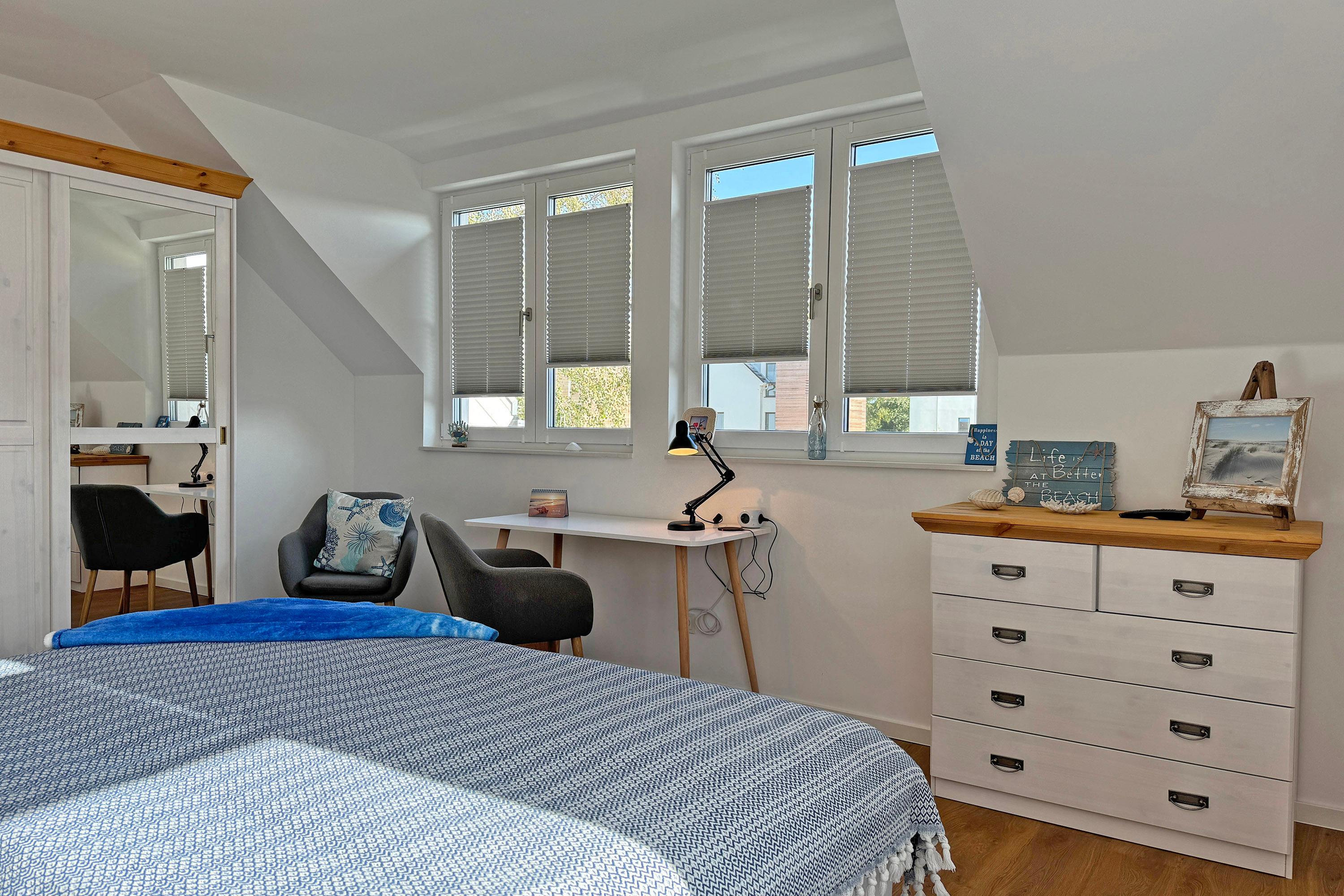Schlafzimmer: Zwei komfortable Doppelzimmer mit Boxspringbetten, Plissees und Fliegengittern