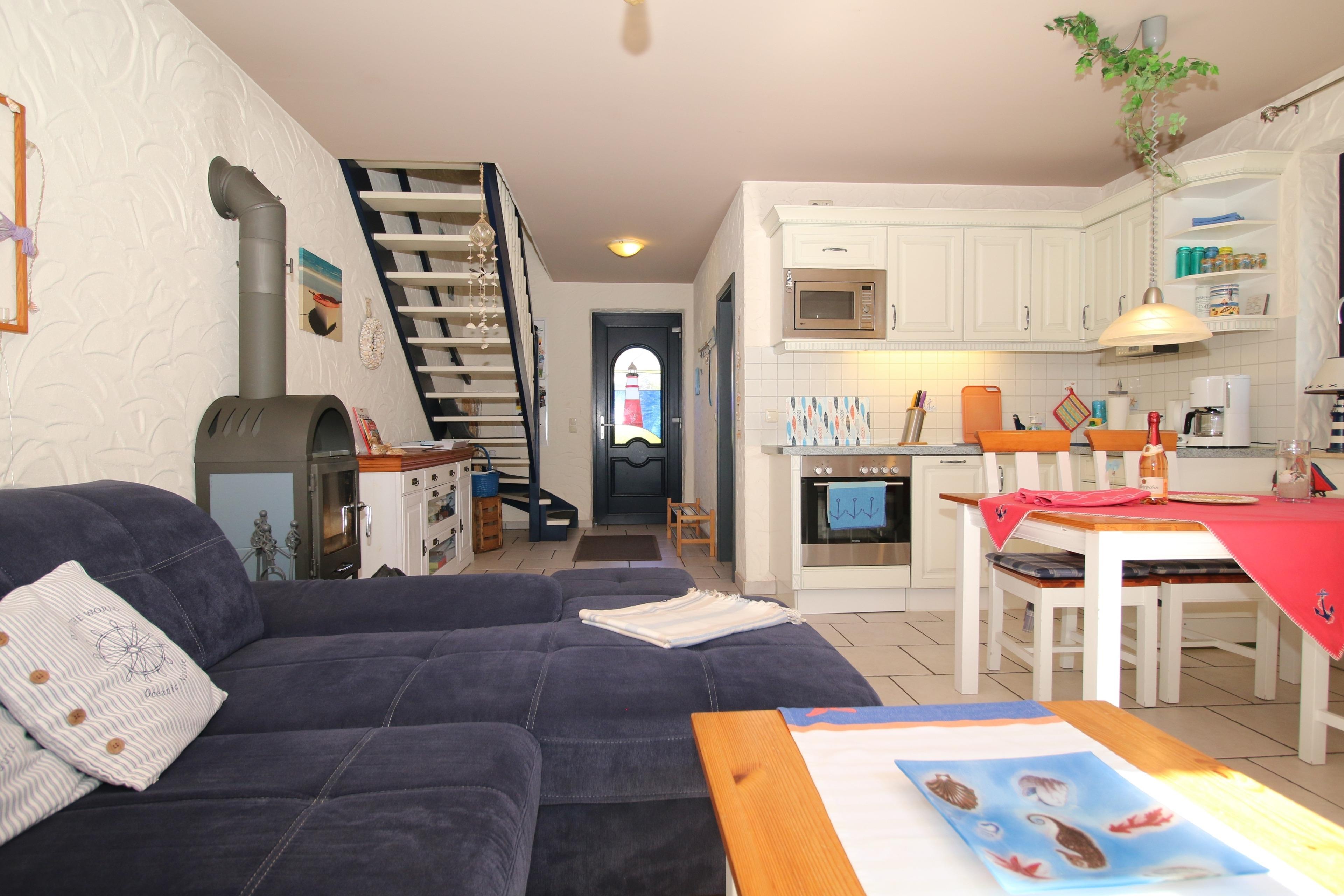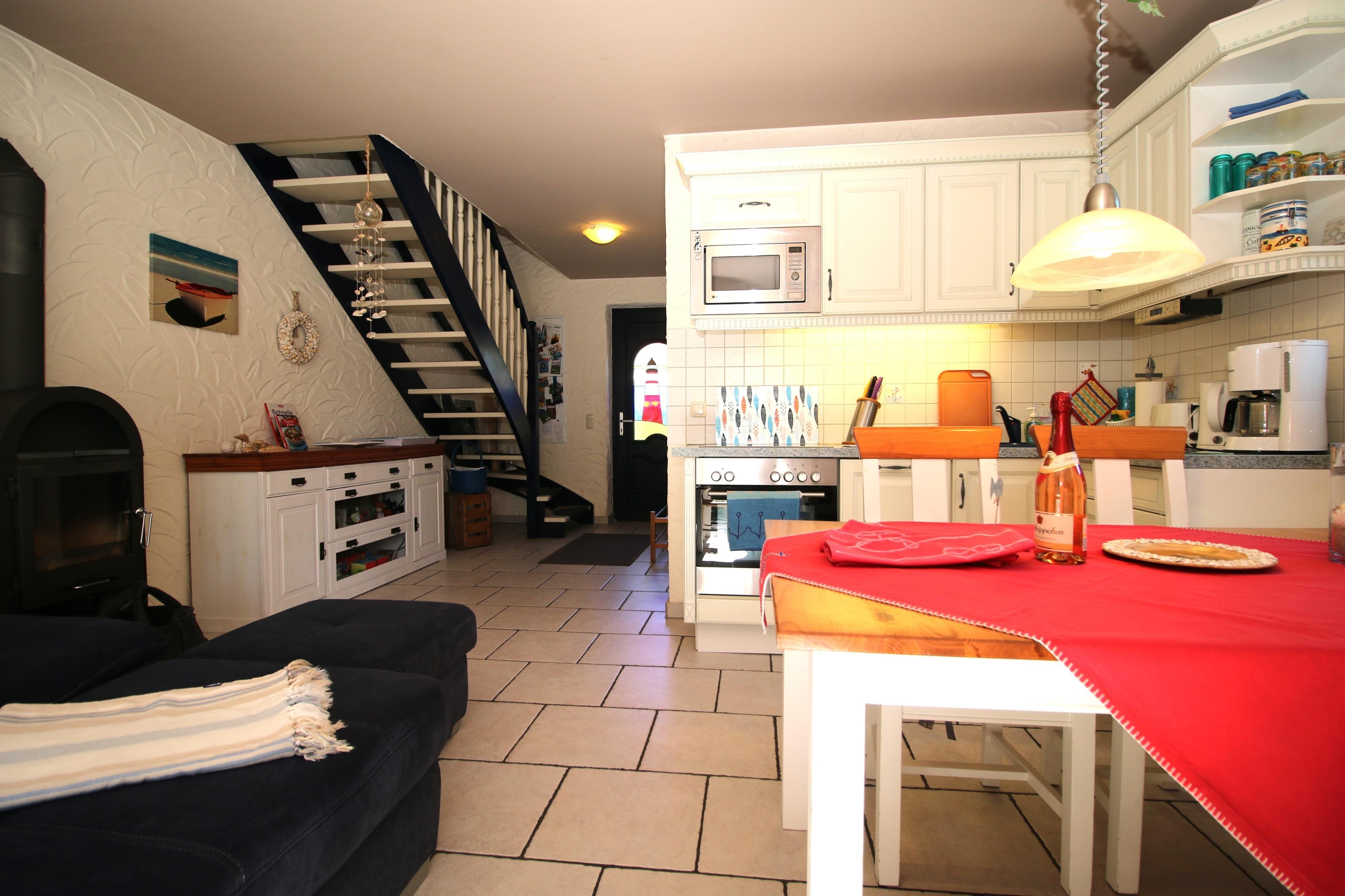 Die Einbauküche mit Mikrowelle und Spülmaschine ist komplett ausgestattet und lässt keine Wünsche offen.