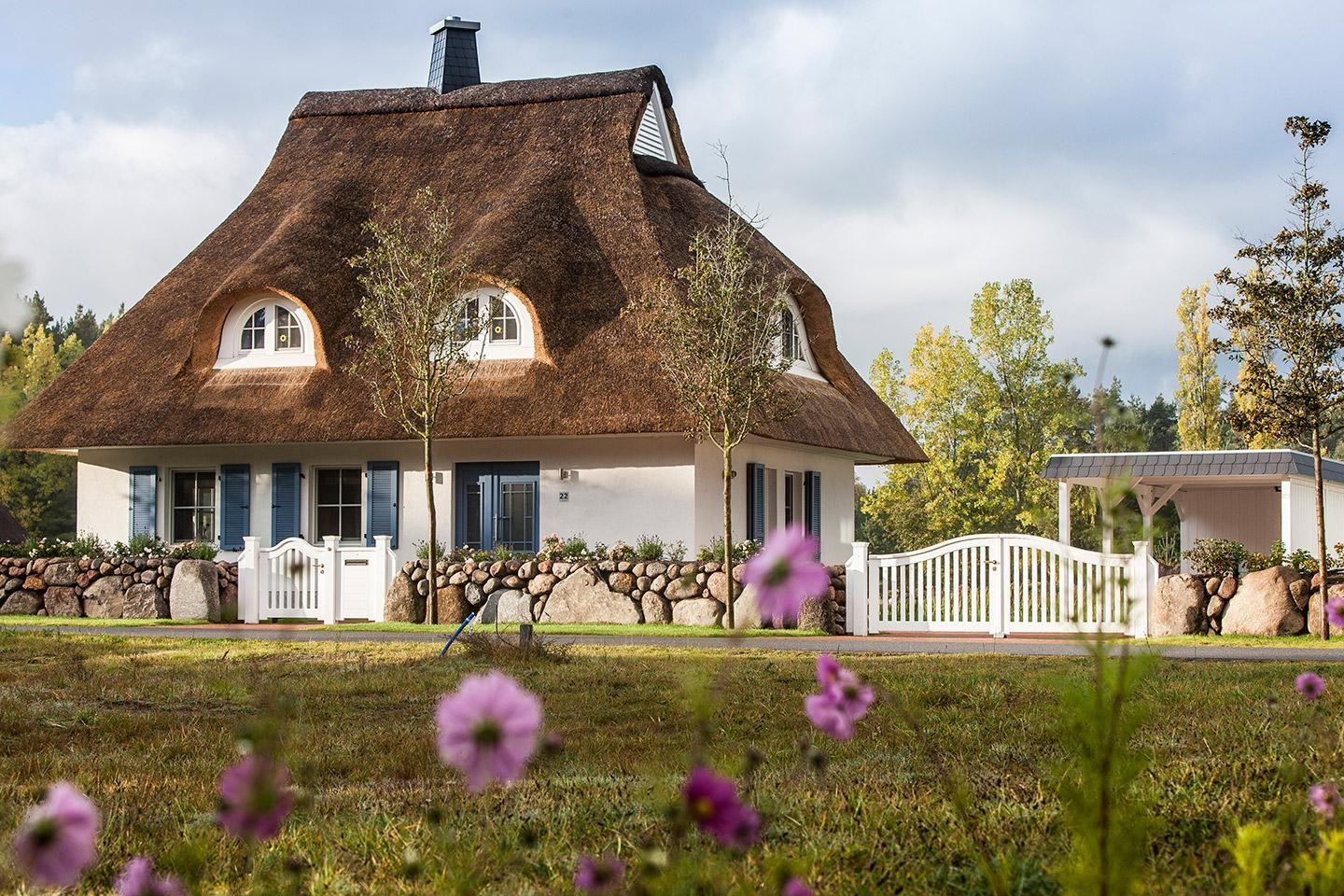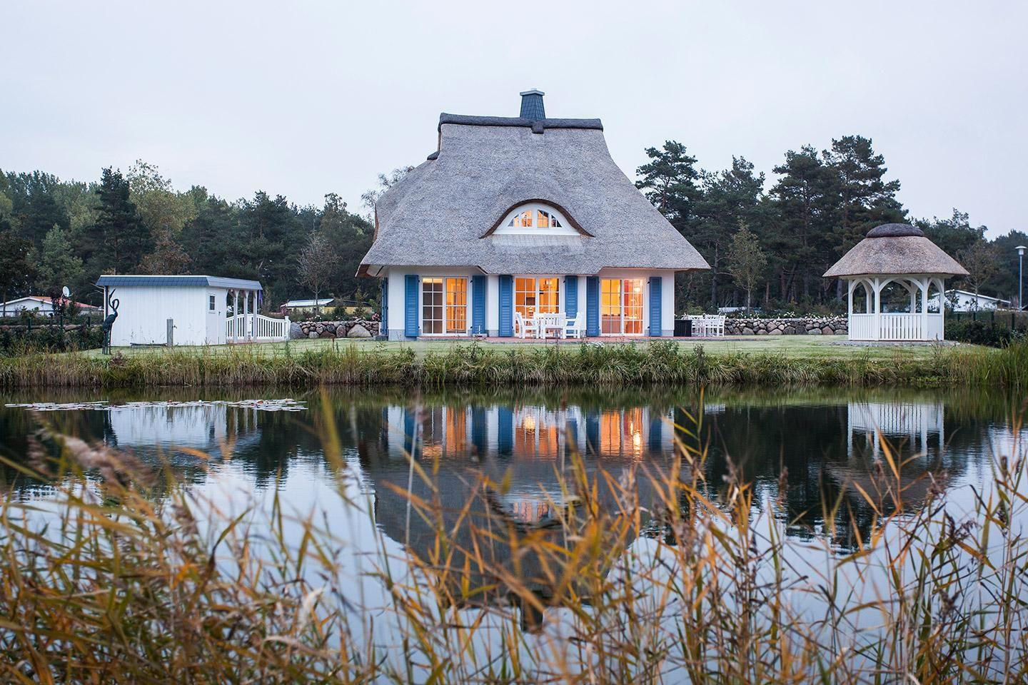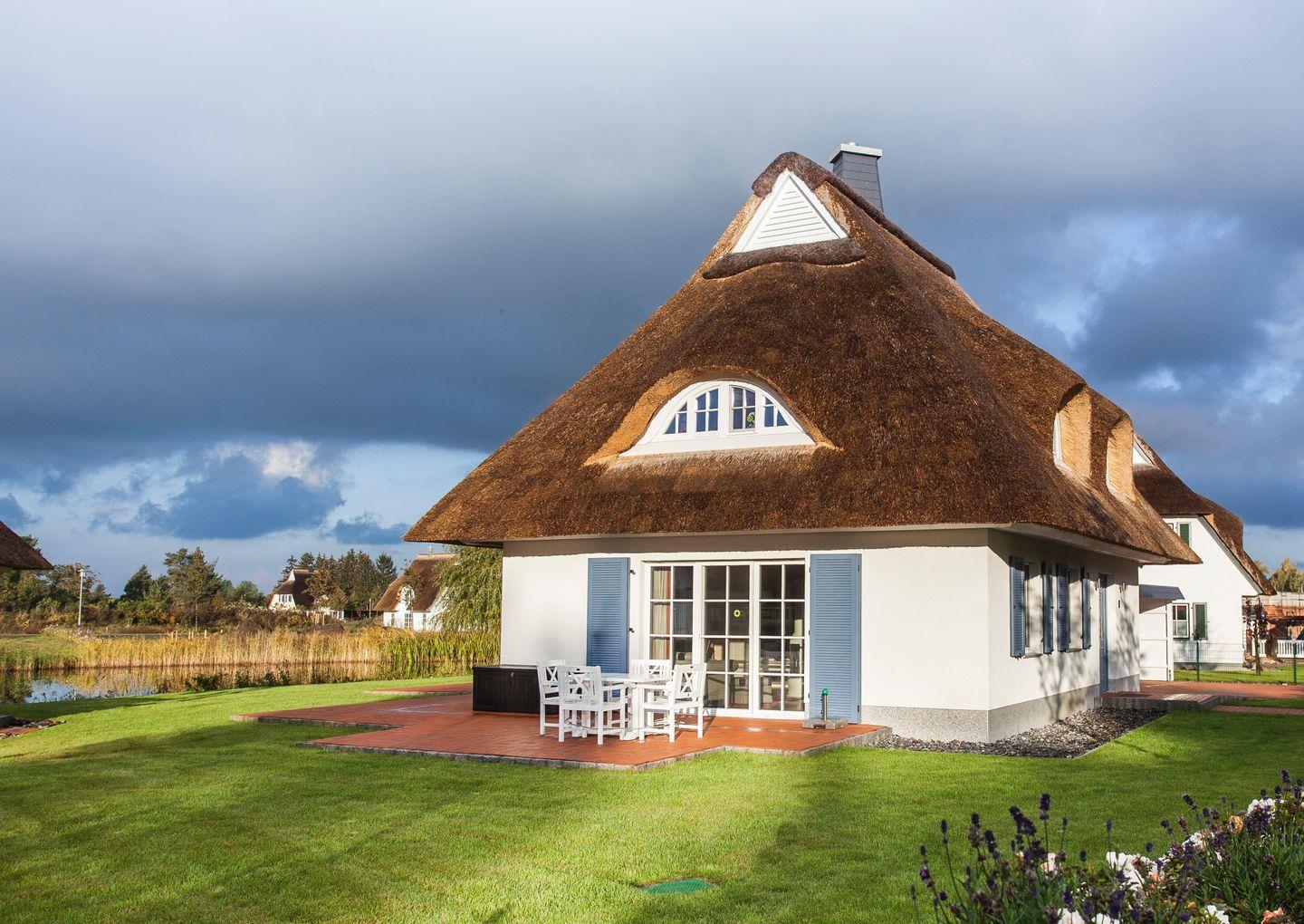 Dieses wunderschöne Ferienhaus mit traditionellem Reetdach, Fensterläden, ortstypischer Feldsteineinfriedung und 803 m2 großem, eingezäuntem Grundstück am Teich liegt in einer neuen Ferienhausanlage. Es bietet großzügig Platz für vier Feriengäste (zwei Schlafzimmer mit Doppelbett) und verfügt über zwei hochwertige Bäder und ein Gäste-WC, davon ein Bad mit Dusche und Sauna im EG und ein Bad mit Badewanne und Dusche im OG.