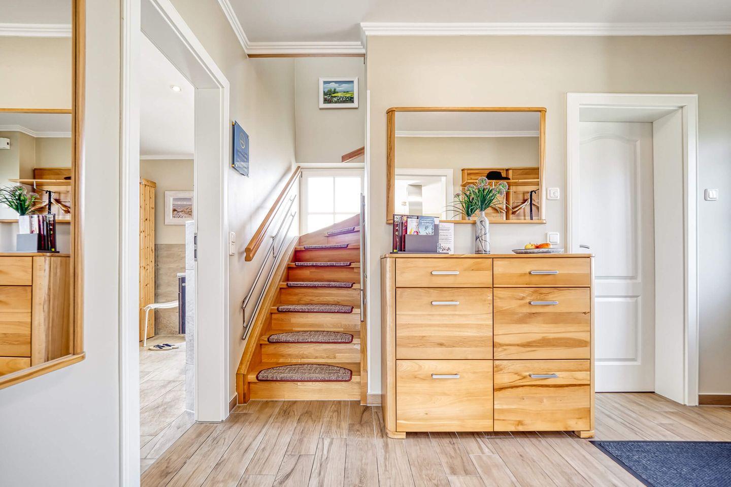 Im Erdgeschoss befindet sich ein ca. 40 qm großer Wohn-Essbereich mit gemütlichen Sitzmöglichkeiten, Kaminofen, SAT-TV mit Sky und neben einer komplett ausgestatteten Küche ist ein großer Esstisch für vier Personen vorhanden. In dem Hauswirtschaftsraum befinden sich u.a. Waschmaschine mit Trocknerfunktion, Bügeleisen und Bügelbrett. Um Sie und Ihr Fahrzeug mit Strom mobil zu halten, haben wir die Infrastruktur geschaffen und stellen Ihnen einen Ladepunkt (kostenpflichtig) am Haus zur Verfügung.